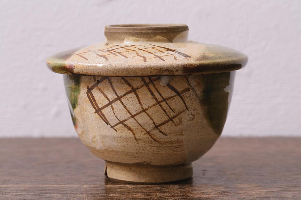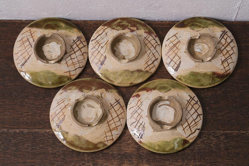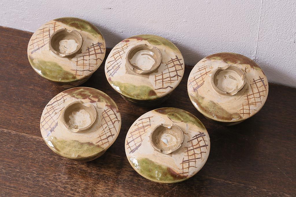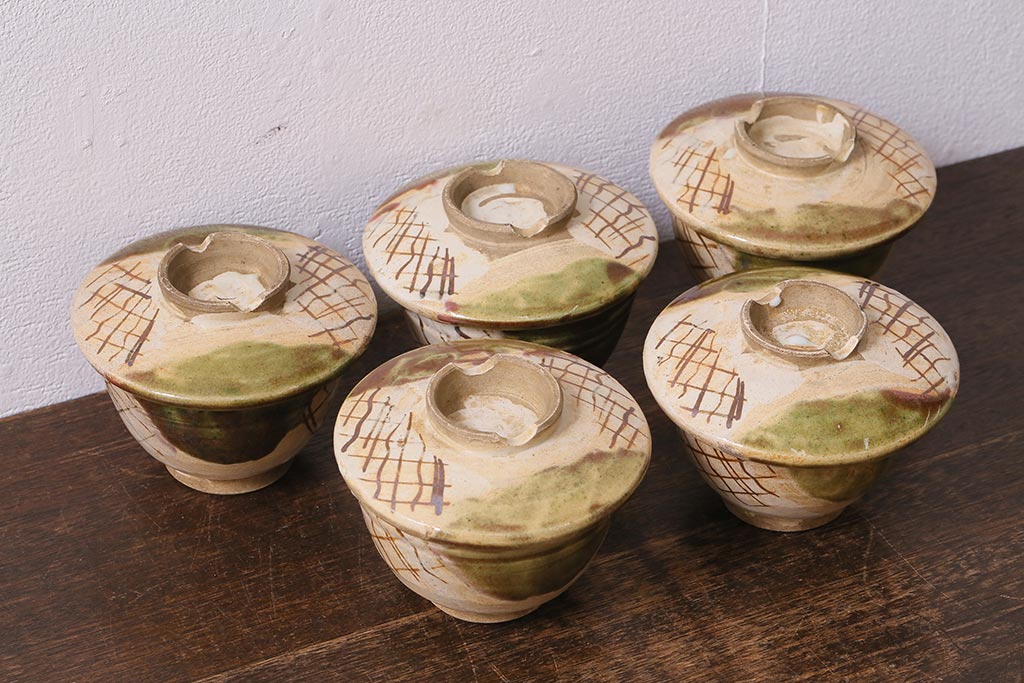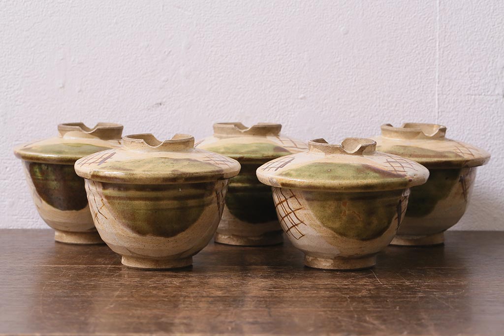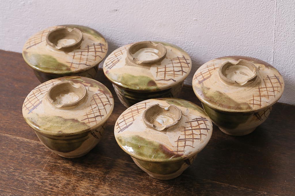 アンティーク雑貨 江戸明治期 時代物 古い織部焼蓋茶碗5客セット(和食器)(R-041390)
