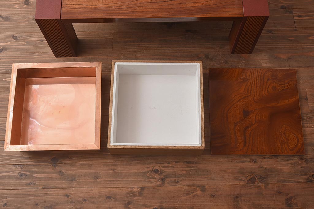 テーブル> センターテーブル・ローテーブル > 在庫未使用品 IDC大塚家具 藤沢木工 脚乾漆 ケヤキ無垢材 力強い杢目が目を惹く上質な囲炉裏テーブル(いろり、座卓、ローテーブル、センターテーブル、リビングテーブル、木製火鉢)(定価約32万円)(R-041752)
