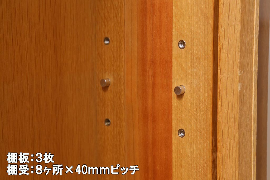 棚板は取り外しできます。棚板は3枚あります。棚受けは8ヶ所、40mmピッチで調整できます。棚幅サイズのものが1枚の作りです。