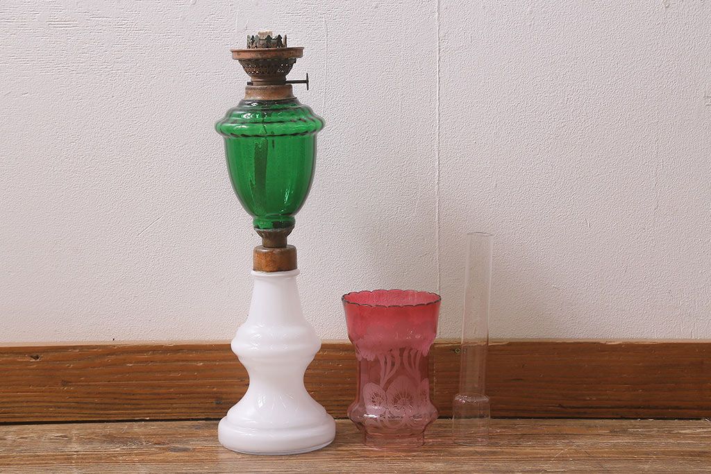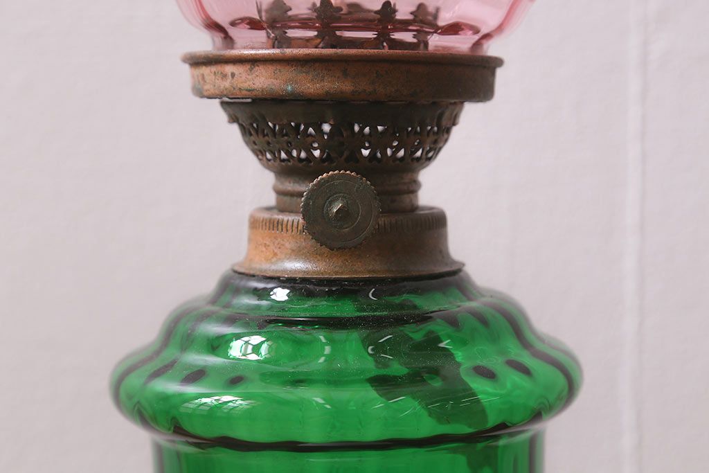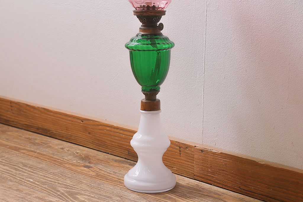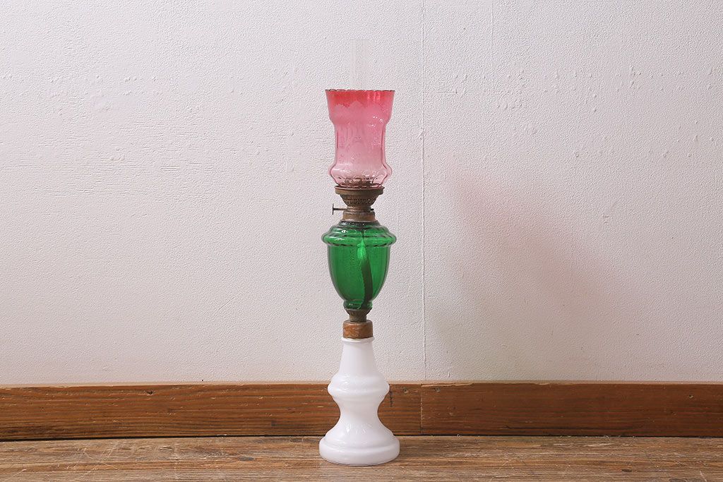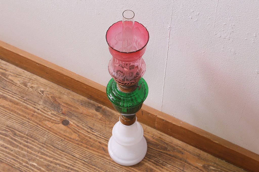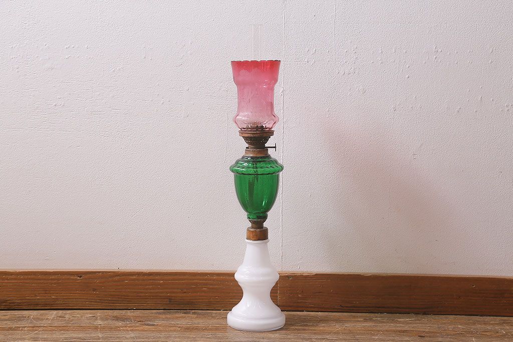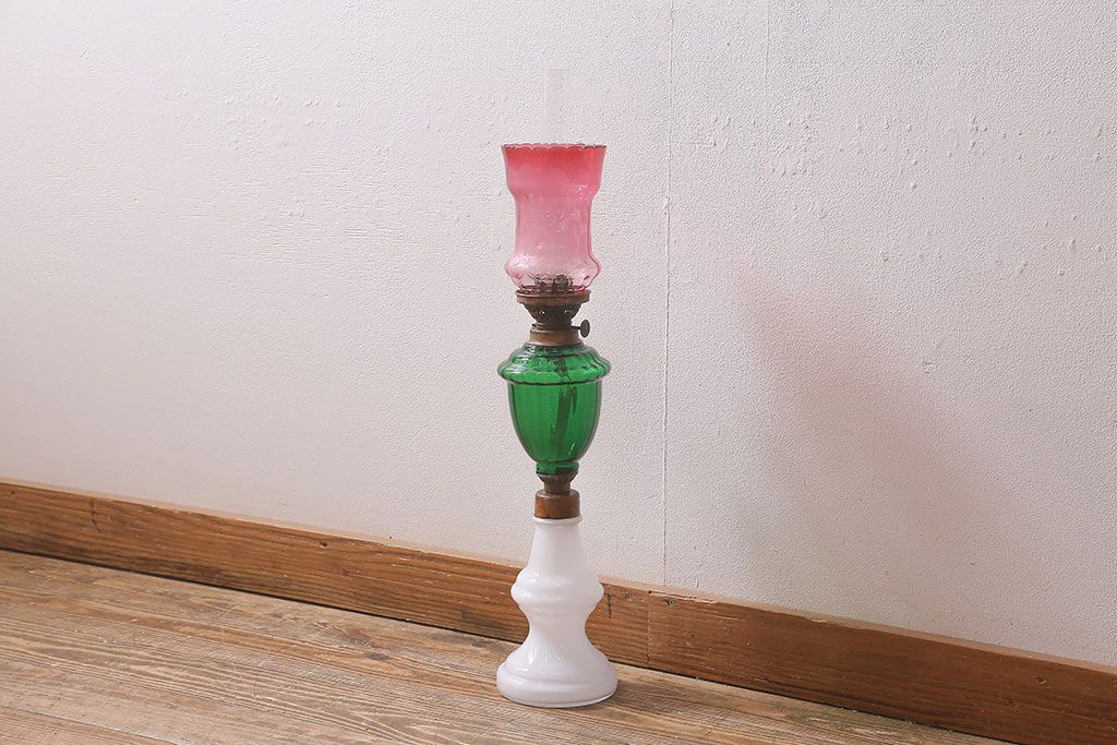 ヴィンテージ雑貨 イギリスビンテージ 平芯 5分芯 3色のガラスが可愛らしいオイルランプ(灯油ランプ、台ランプ)(R-041760)
