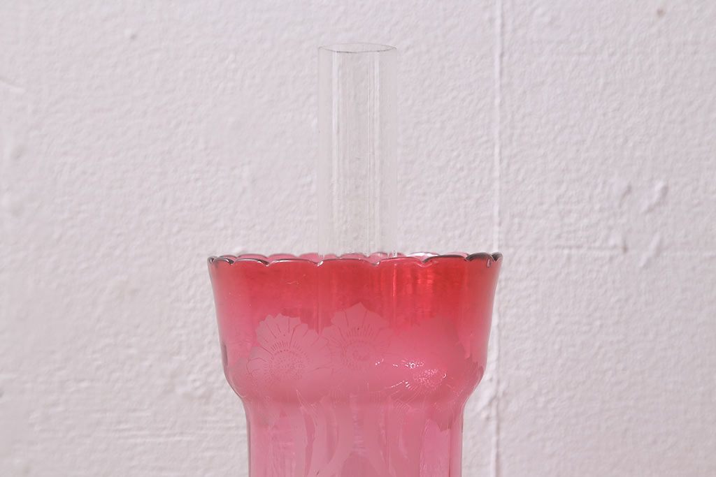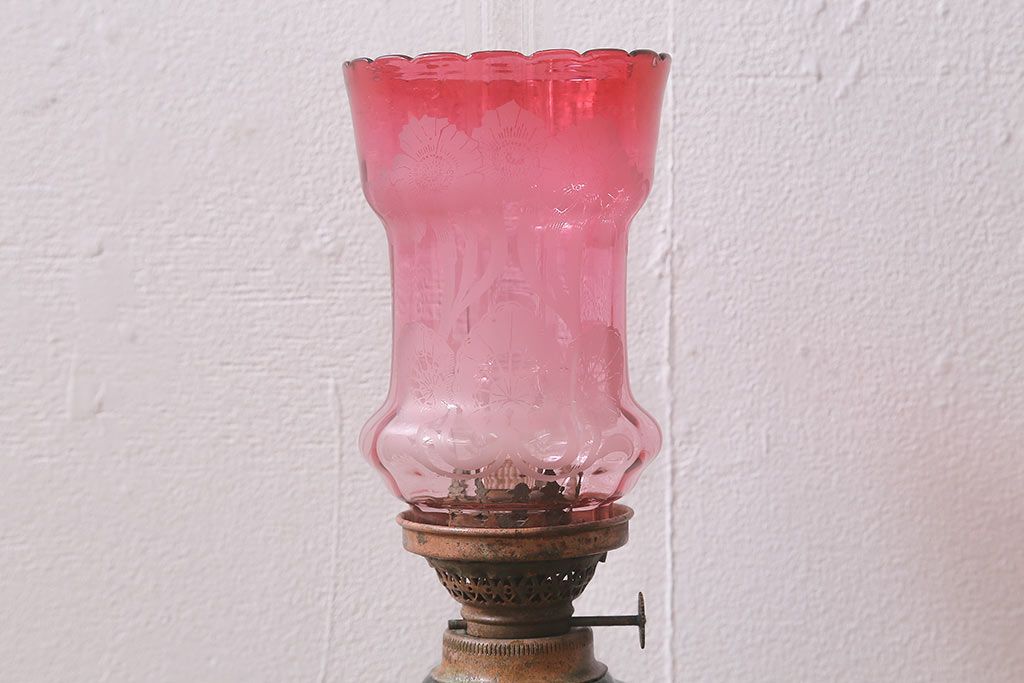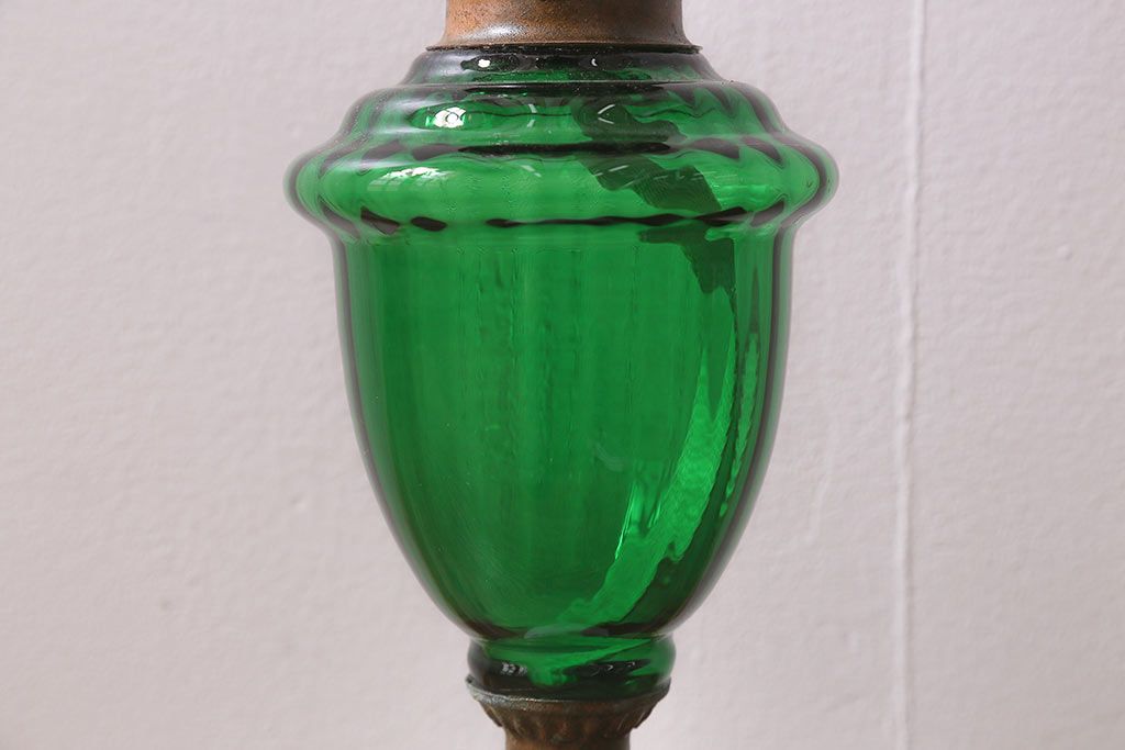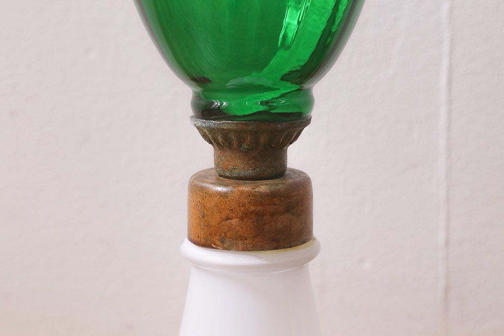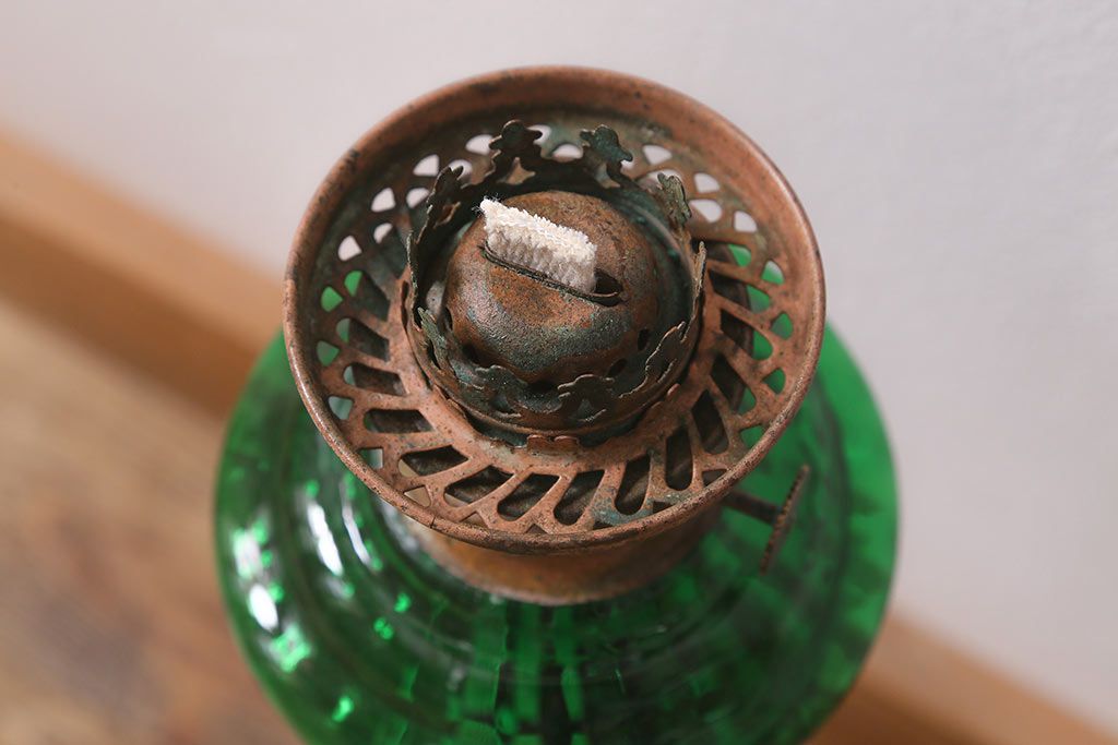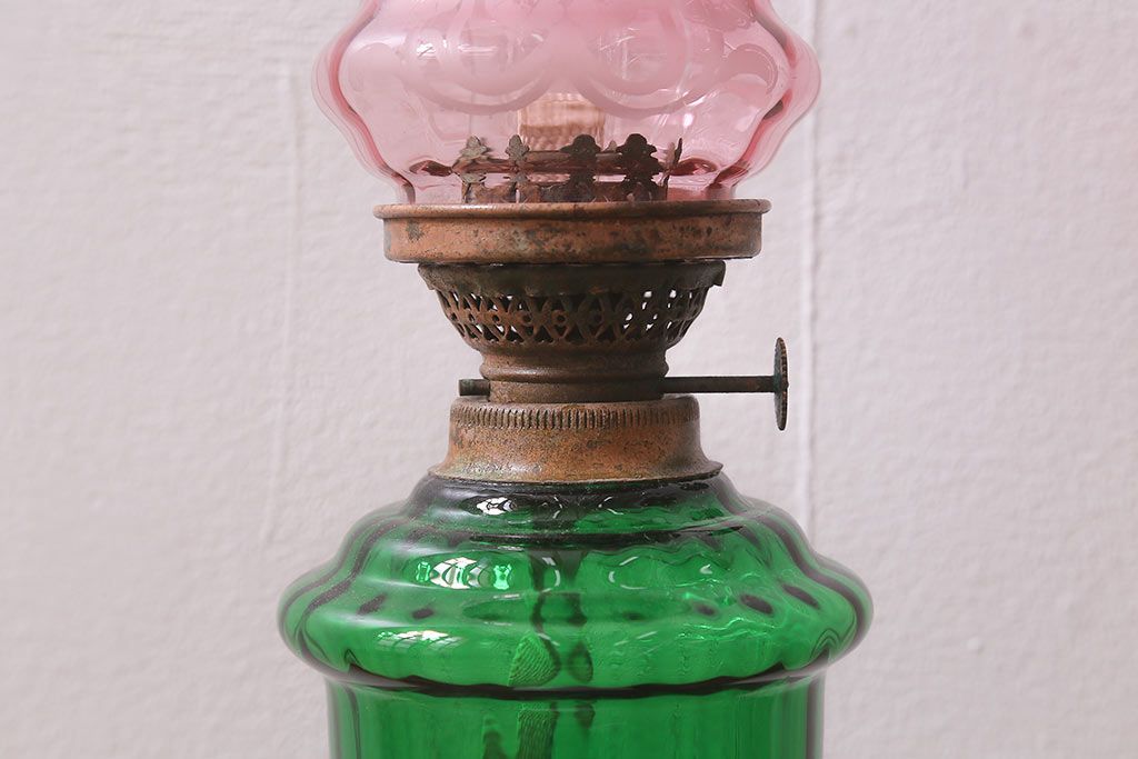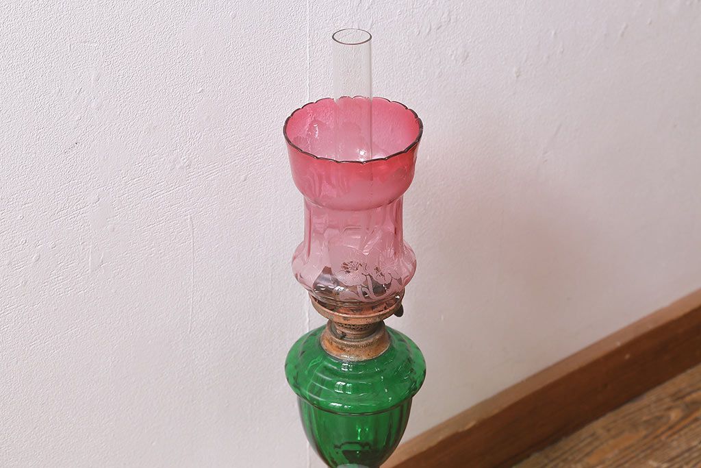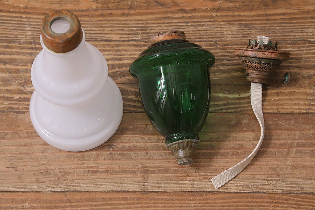 ヴィンテージ雑貨 イギリスビンテージ 平芯 5分芯 3色のガラスが可愛らしいオイルランプ(灯油ランプ、台ランプ)(R-041760)