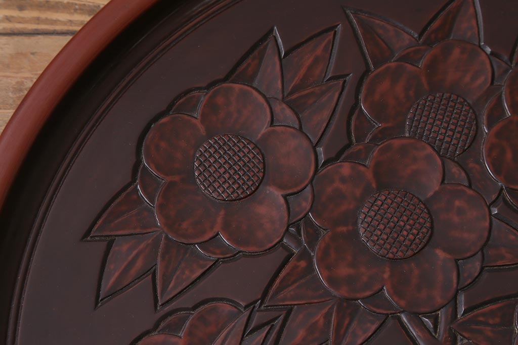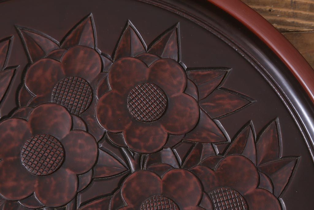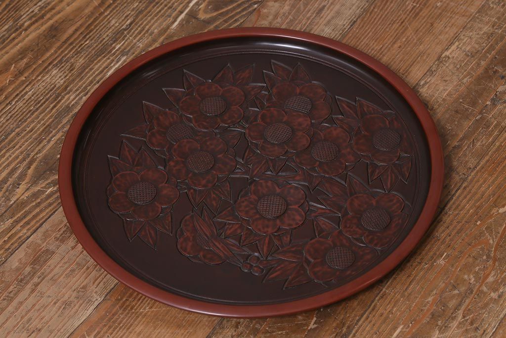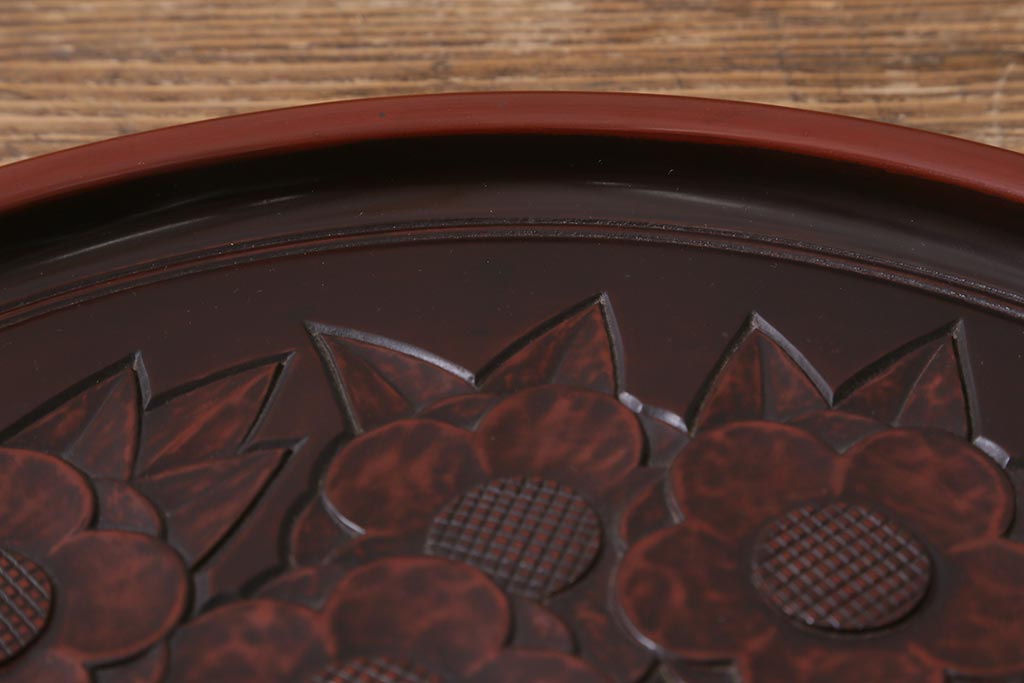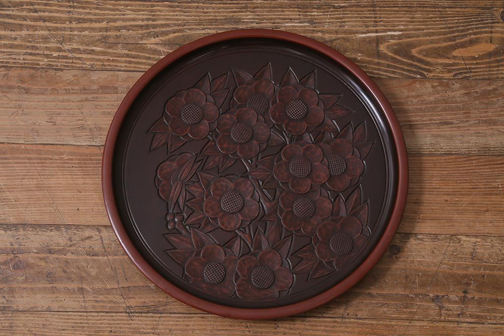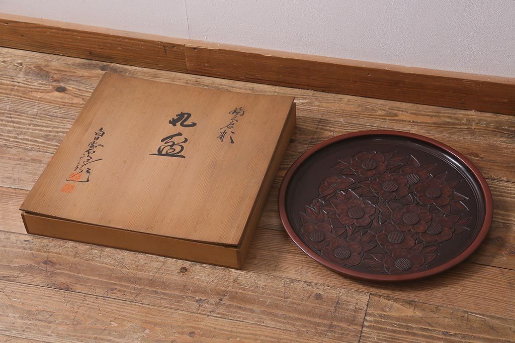 ラフジュ工房> 骨董・美術品> 骨董-漆器 > 鎌倉彫 白日堂 伊志良不説作 丸盆 箱付き(和盆、木製盆、漆器)(R-041598)