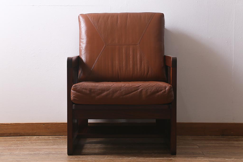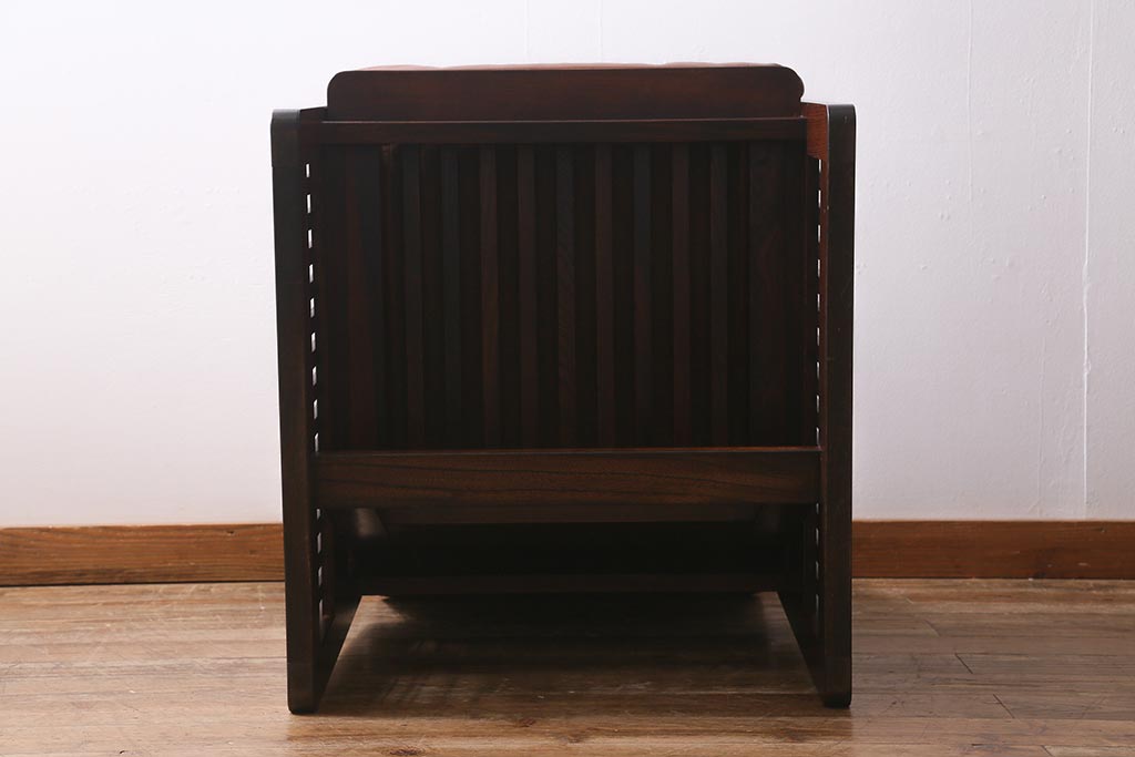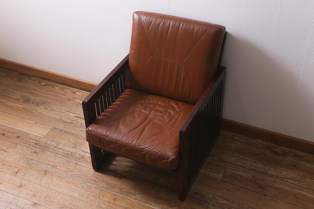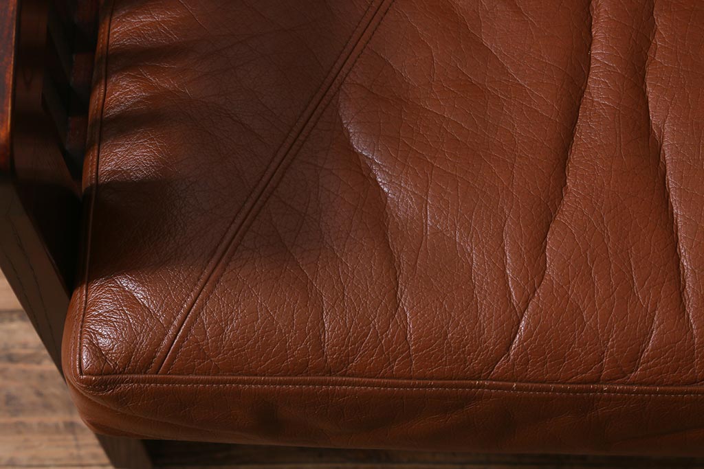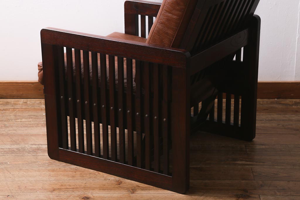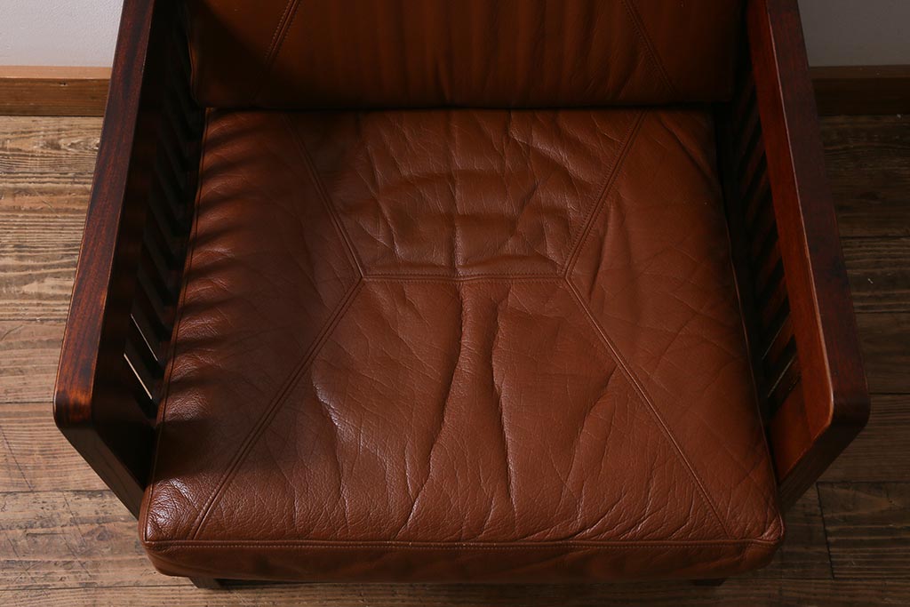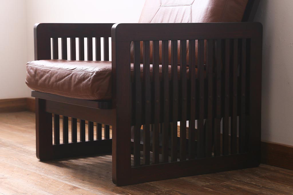 中古 九州民芸家具 本革 総ケヤキ材 漆塗り 上質な雰囲気漂う1人掛けソファ(定価30万円)(1Pソファ、椅子、アームチェア)(R-040925)