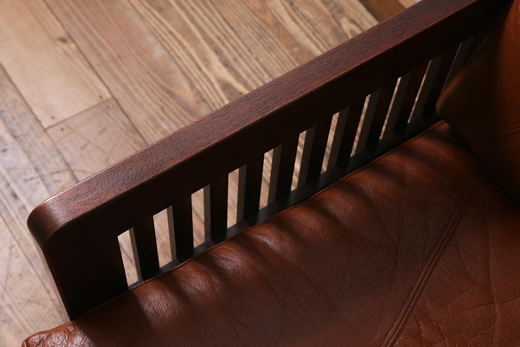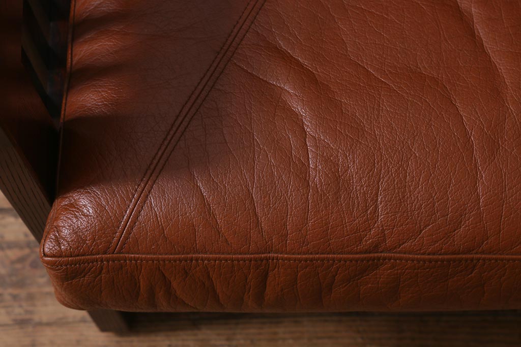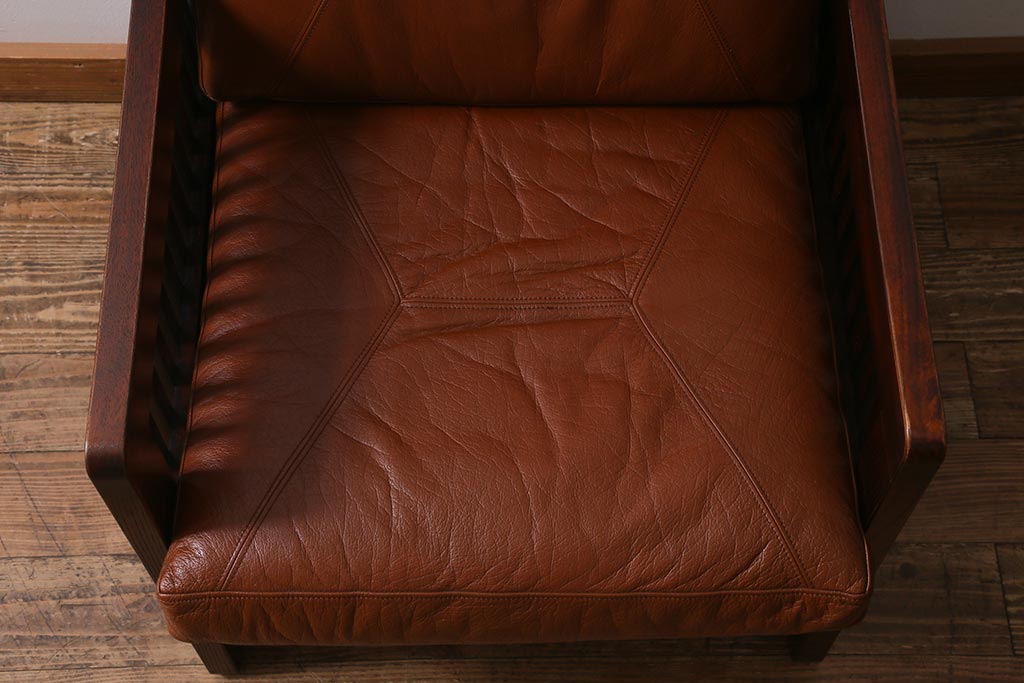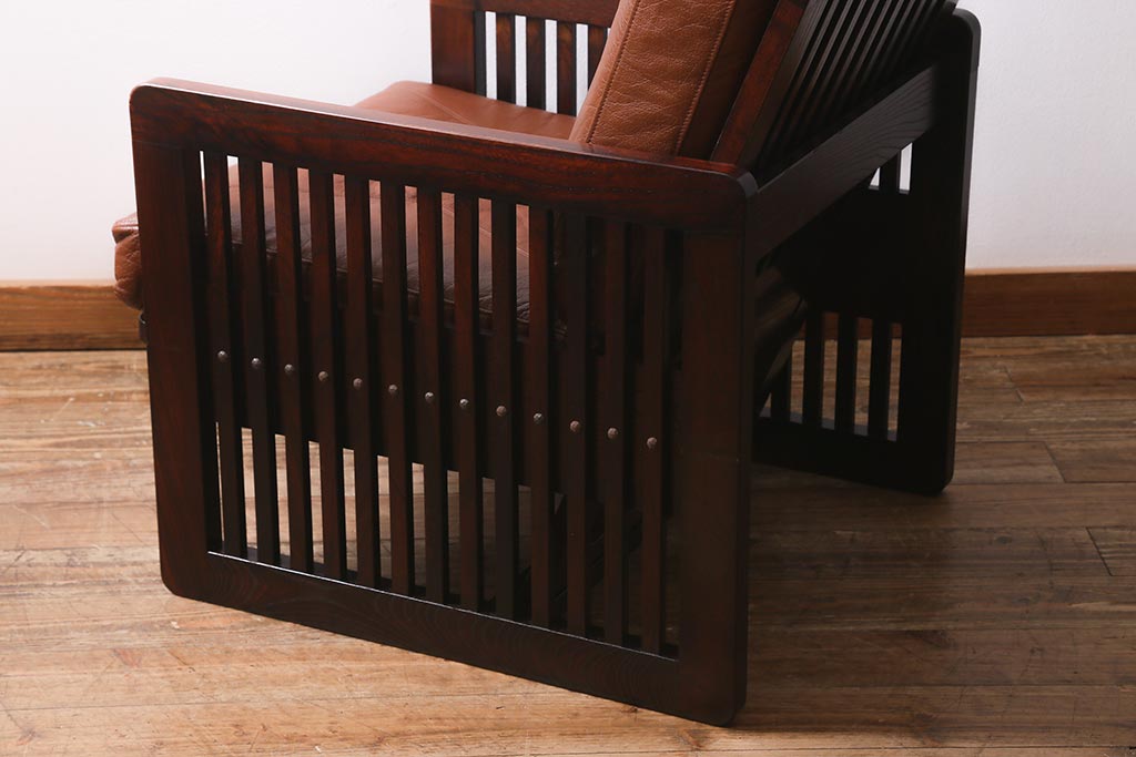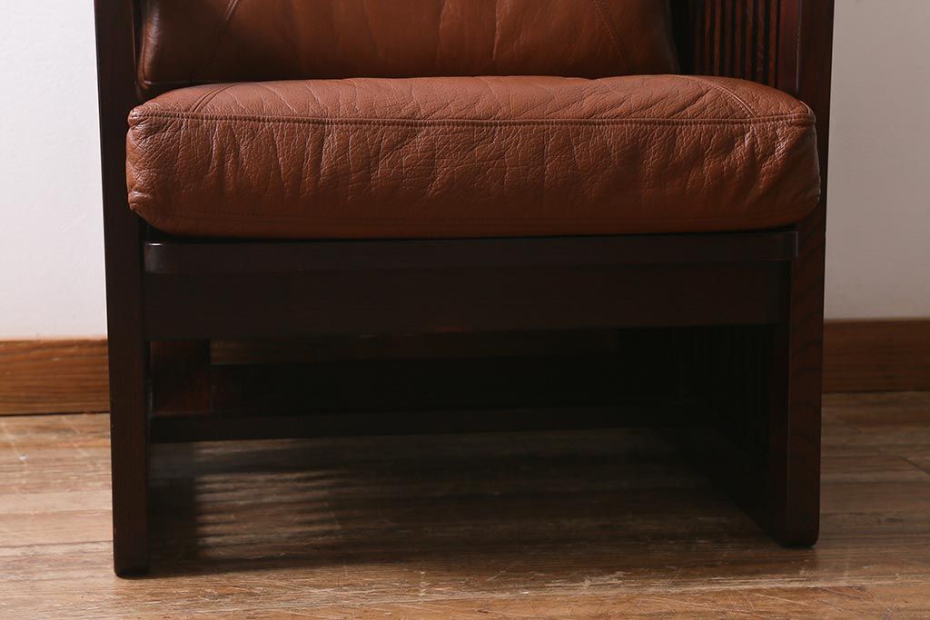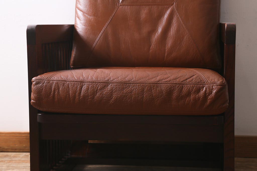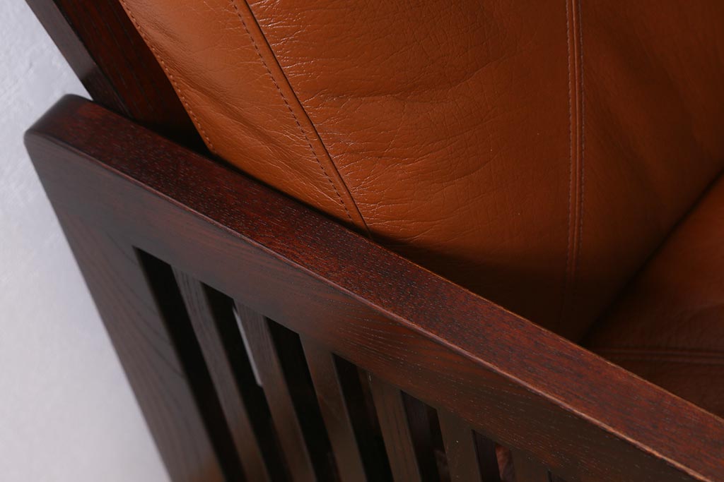 民芸家具				> 中古 九州民芸家具 本革 総ケヤキ材 漆塗り 上質な雰囲気漂う1人掛けソファ(定価30万円)(1Pソファ、椅子、アームチェア)(R-040927)