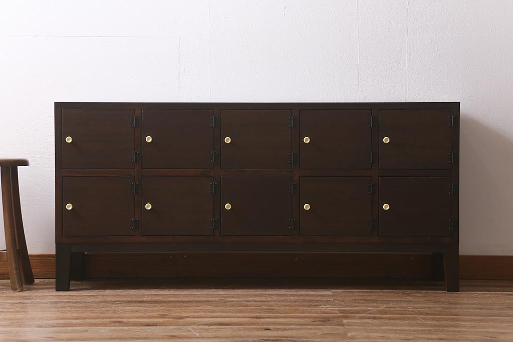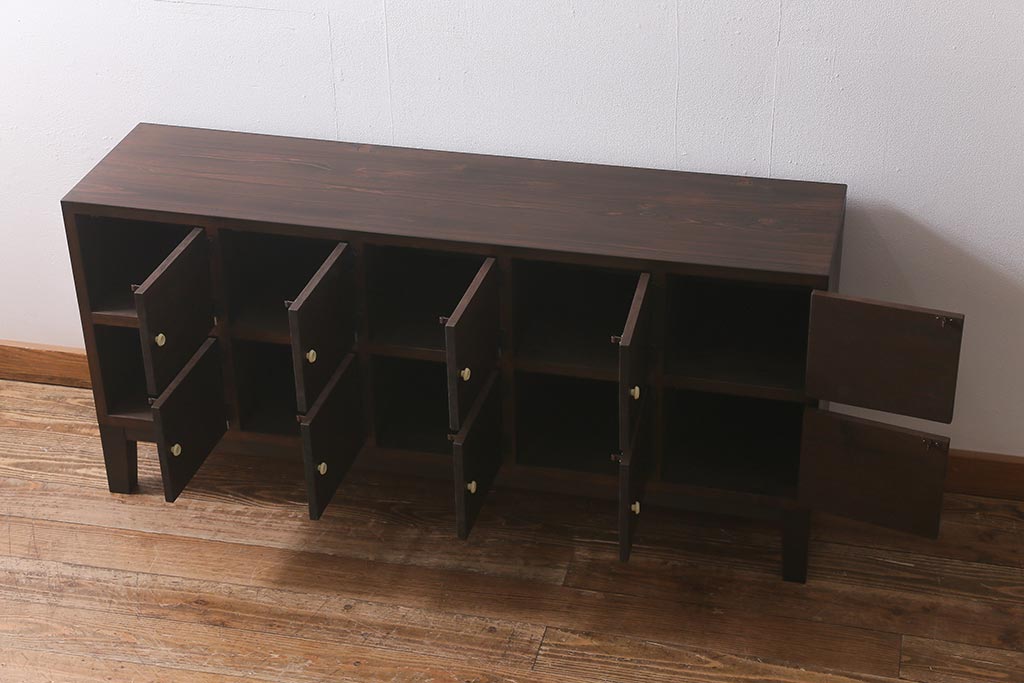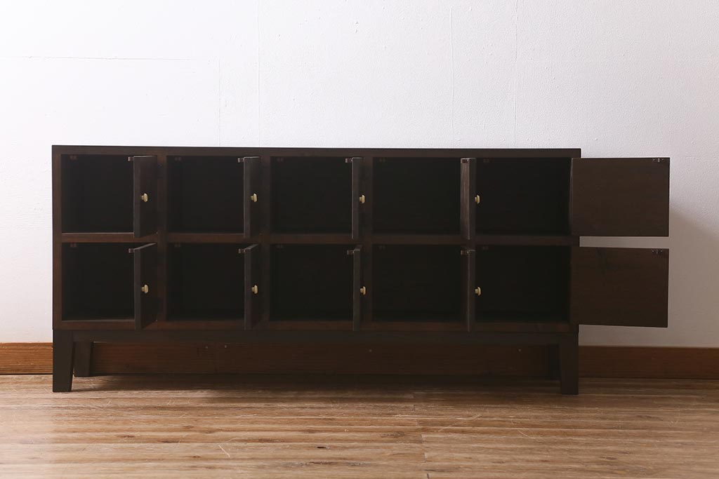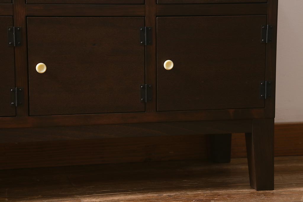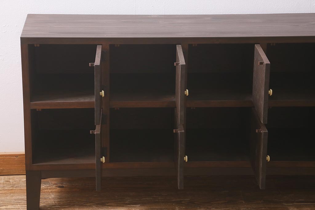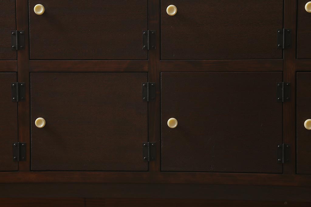 ラフジュ工房> キャビネット・戸棚> テレビ台・ローボード > ラフジュ工房オリジナル 古材リメイク レトロな雰囲気が魅力的な扉付きマス目棚・右開き(収納棚、ロッカー、下駄箱)(R-042044)