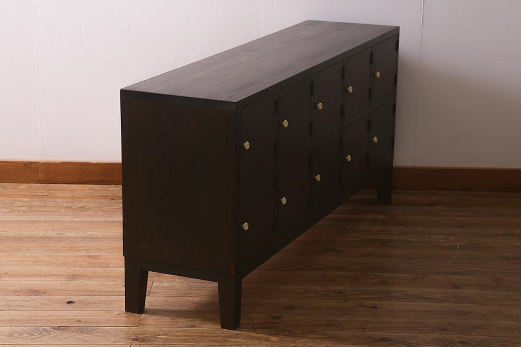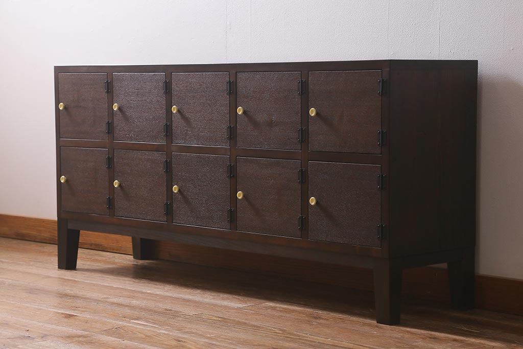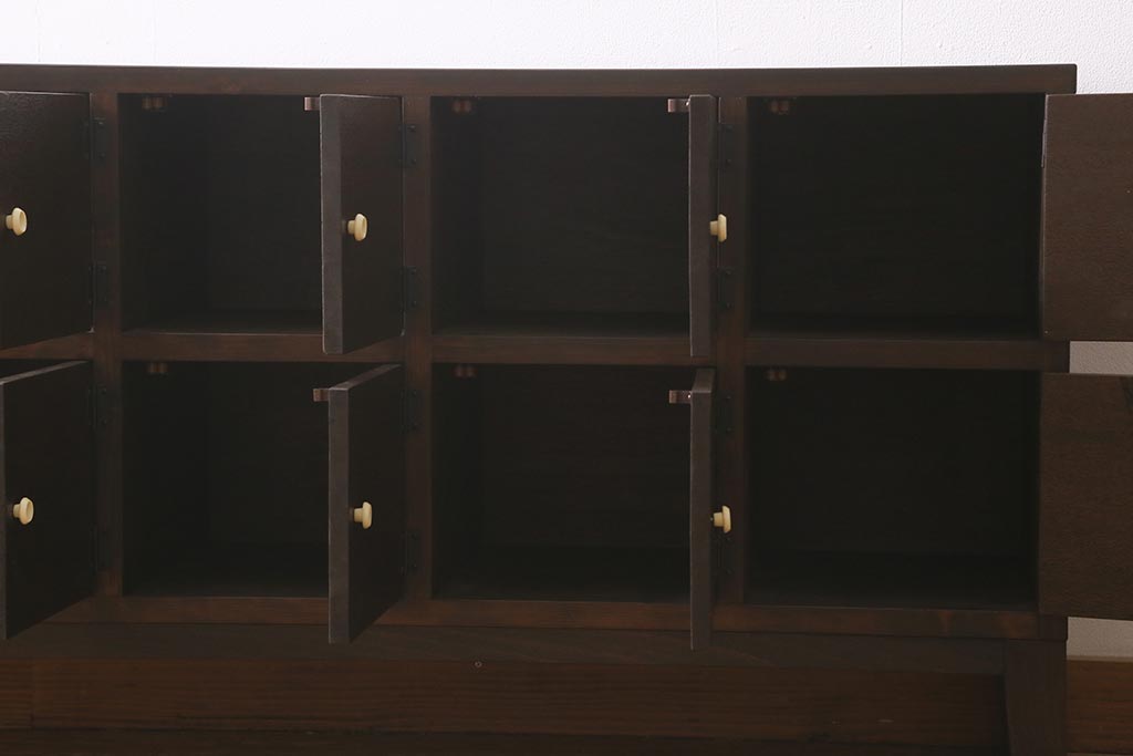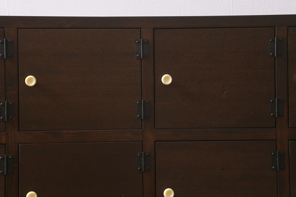 ラフジュ工房オリジナル 古材リメイク レトロな雰囲気が魅力的な扉付きマス目棚・右開き(収納棚、ロッカー、下駄箱)(R-042044)