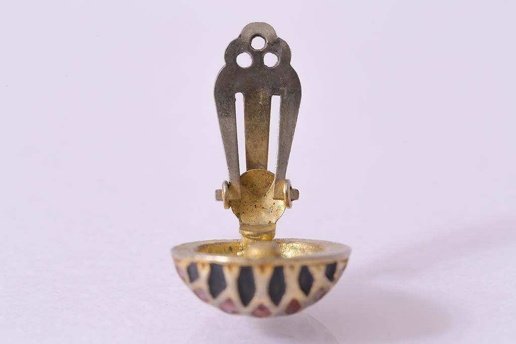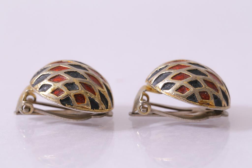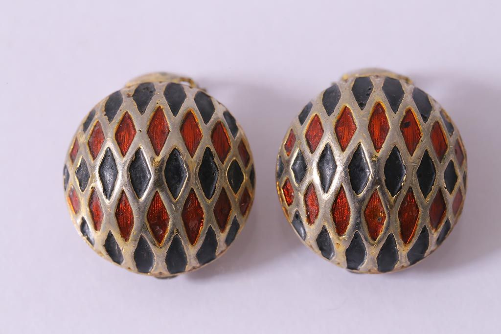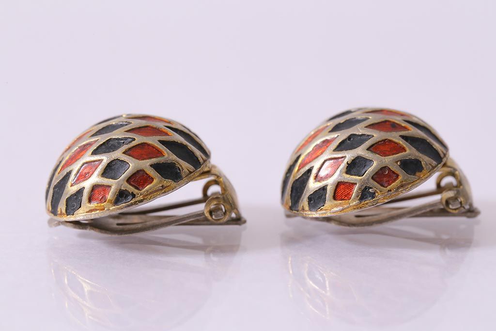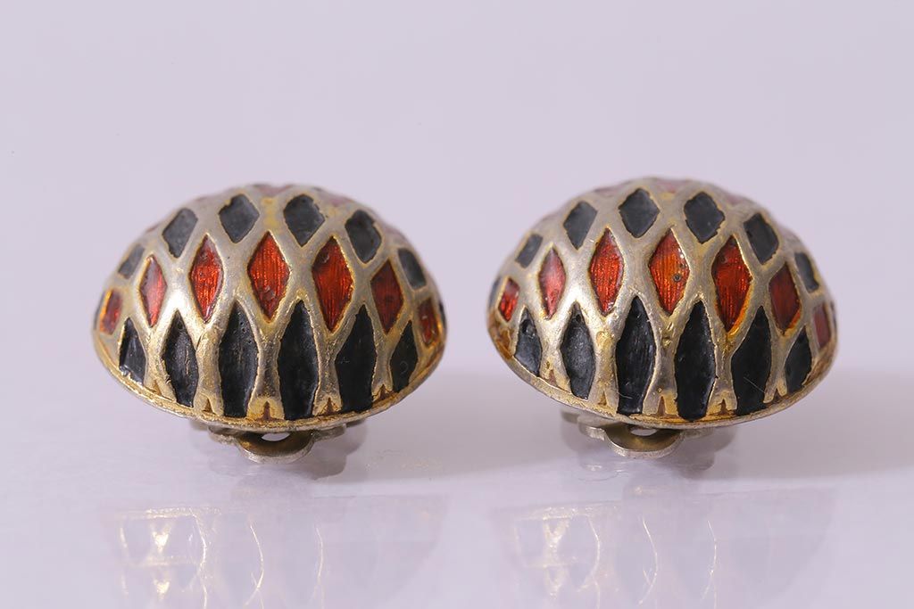 ヴィンテージ 赤 黒 ゴールド レトロ ドーム型イヤリング(アクセサリー、ビンテージ)(R-041793)