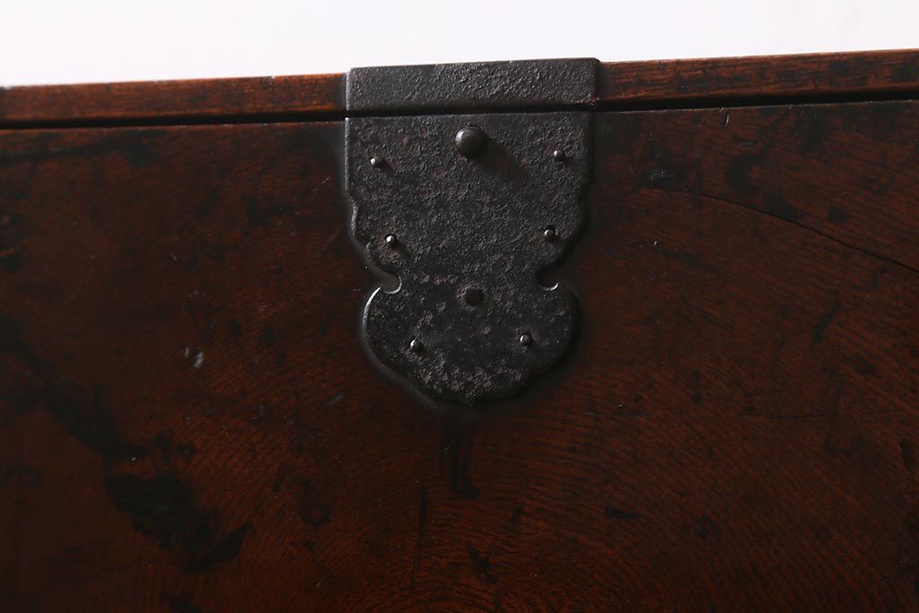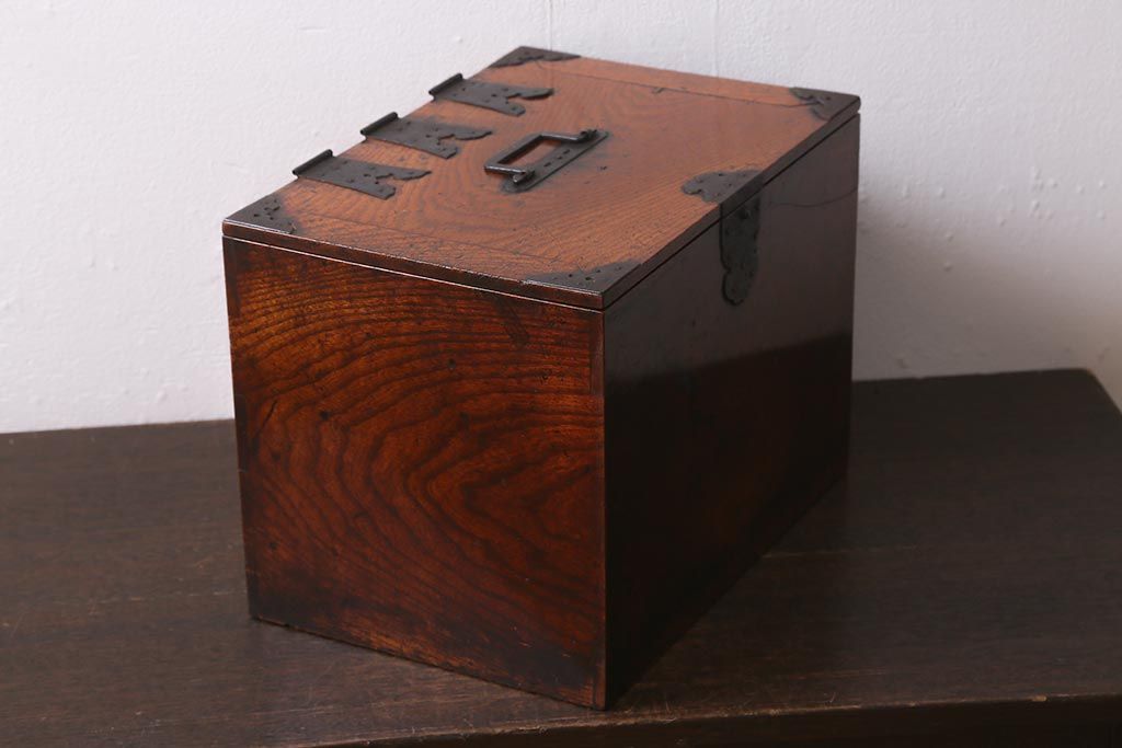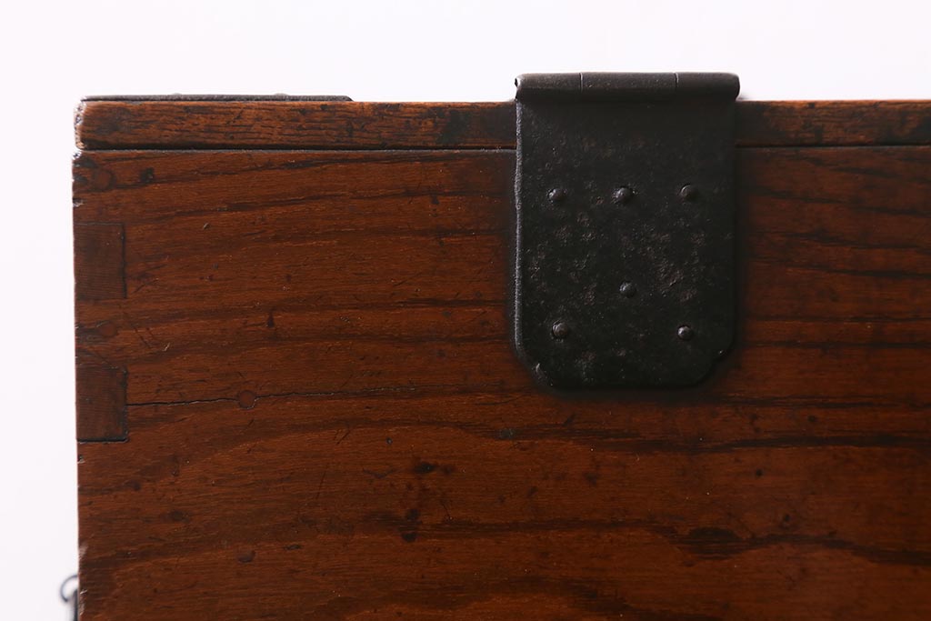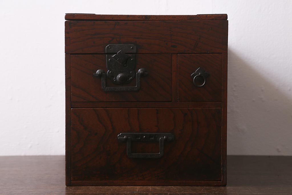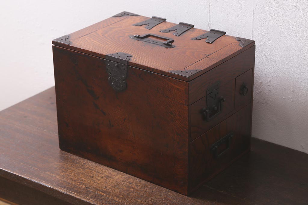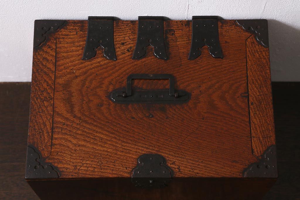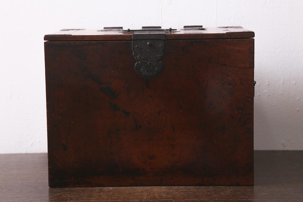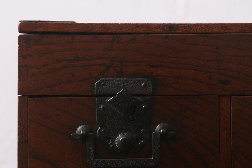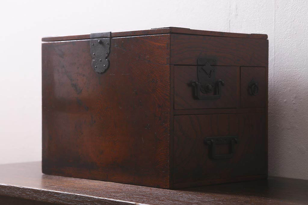 小物収納・トランク > アンティーク家具 古民具・骨董 総欅(ケヤキ)材 漆塗り 存在感のある金具が魅力の硯箱(小引き出し)(R-042009)