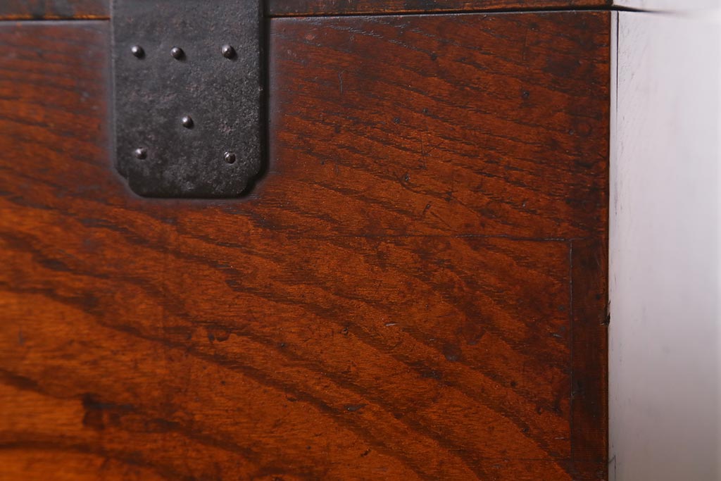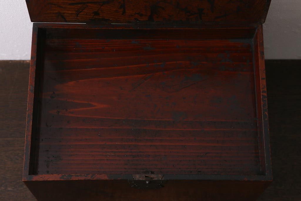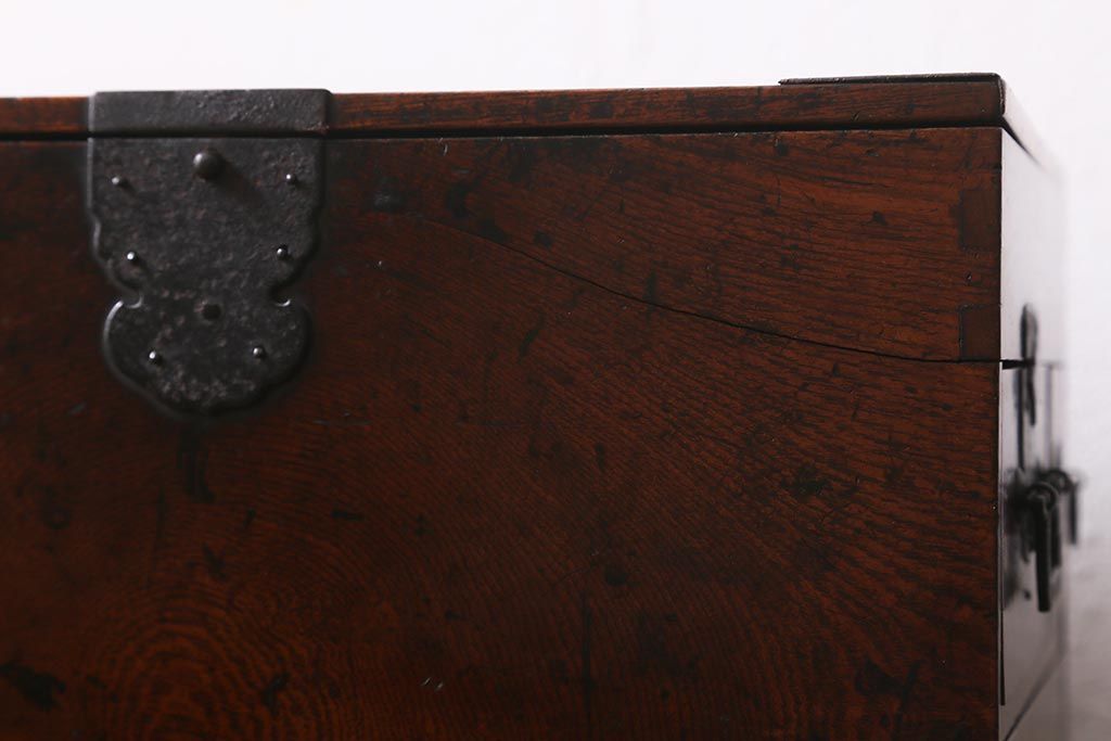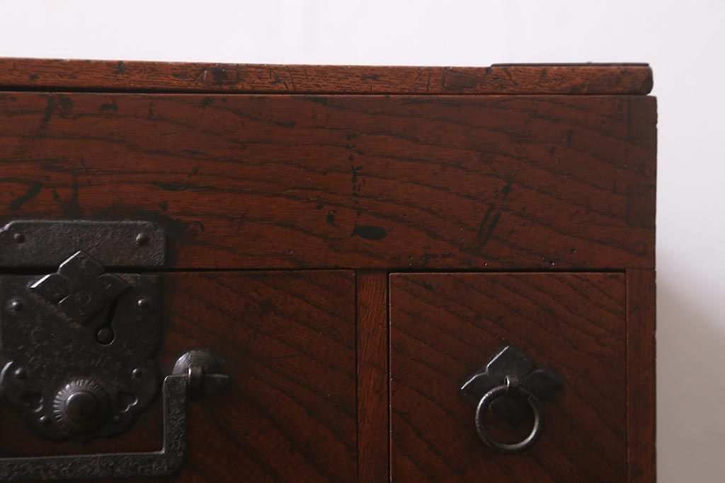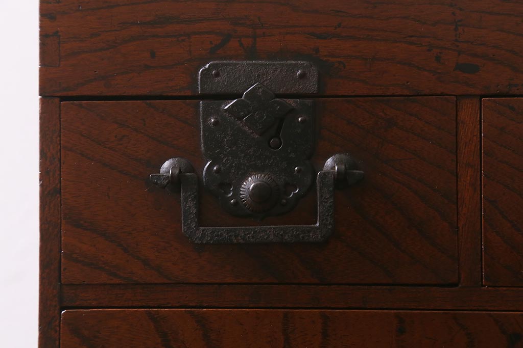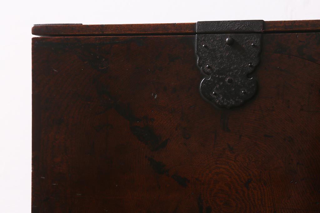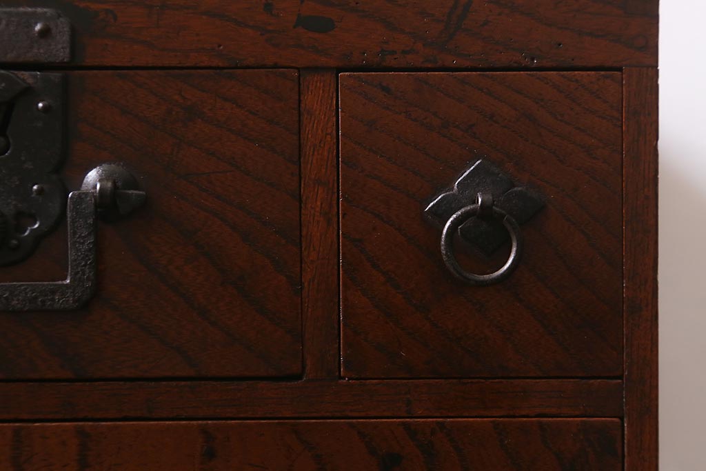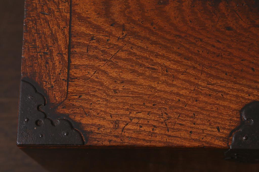 小物収納・トランク > アンティーク家具 古民具・骨董 総欅(ケヤキ)材 漆塗り 存在感のある金具が魅力の硯箱(小引き出し)(R-042009)
