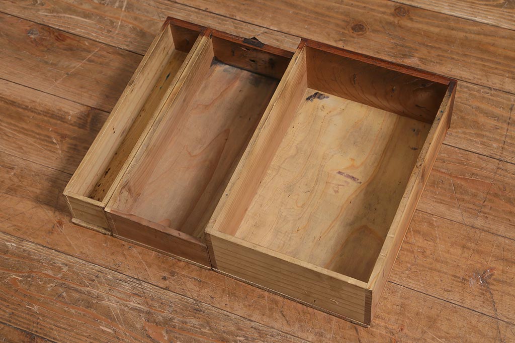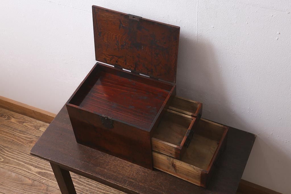 小物収納・トランク> 木箱 > アンティーク家具 古民具・骨董 総欅(ケヤキ)材 漆塗り 存在感のある金具が魅力の硯箱(小引き出し)(R-042009)