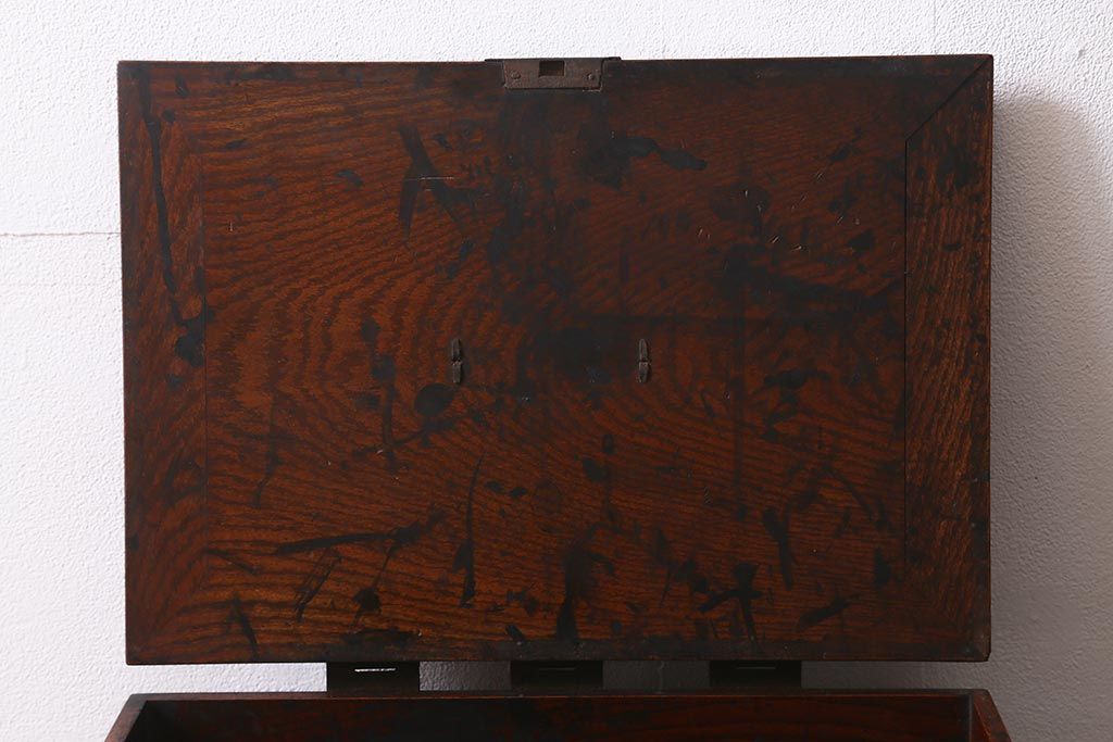 骨董・美術品> 書道具 > アンティーク家具 古民具・骨董 総欅(ケヤキ)材 漆塗り 存在感のある金具が魅力の硯箱(小引き出し)(R-042009)