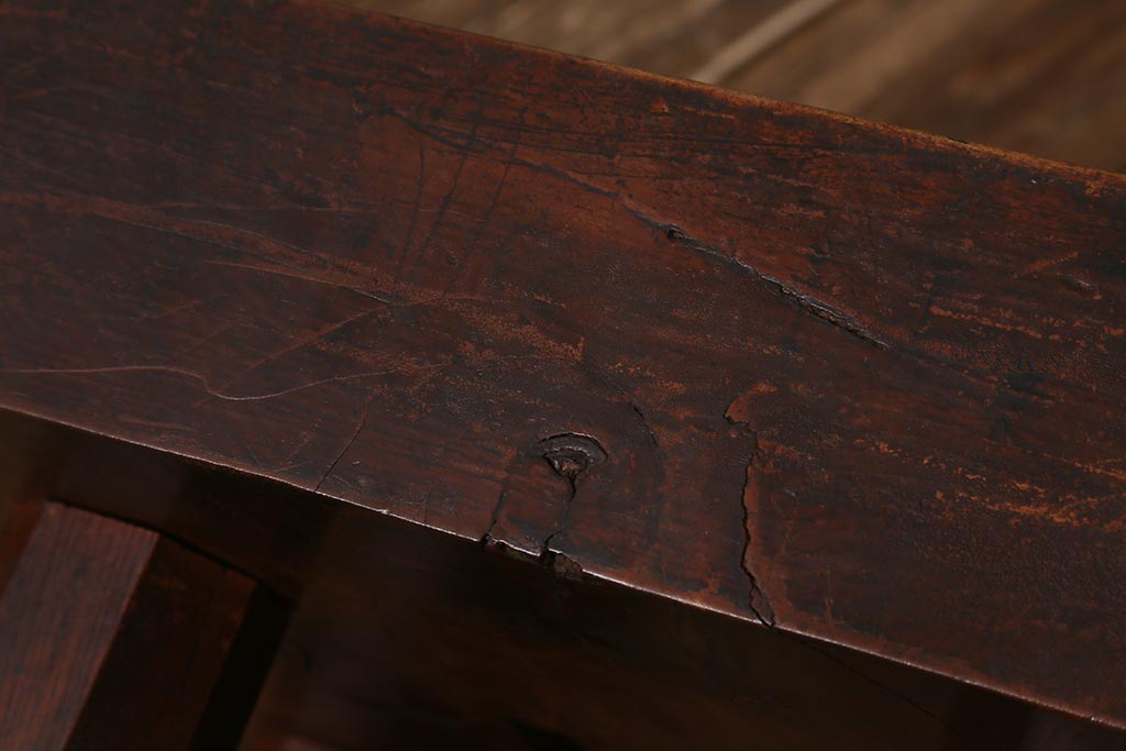 欅の力強い杢目と節や経年による傷が