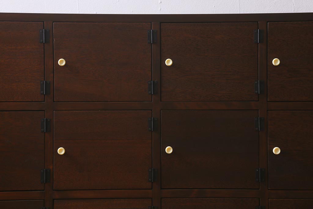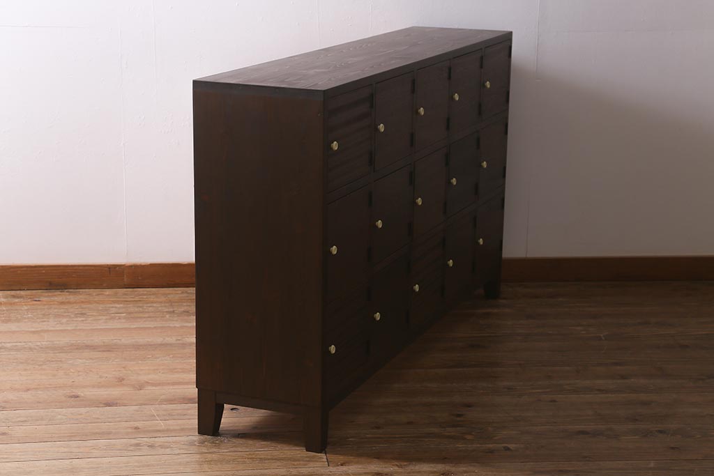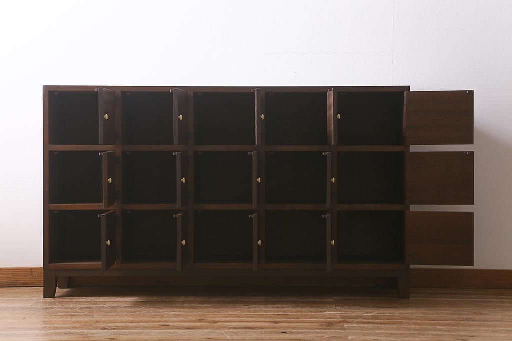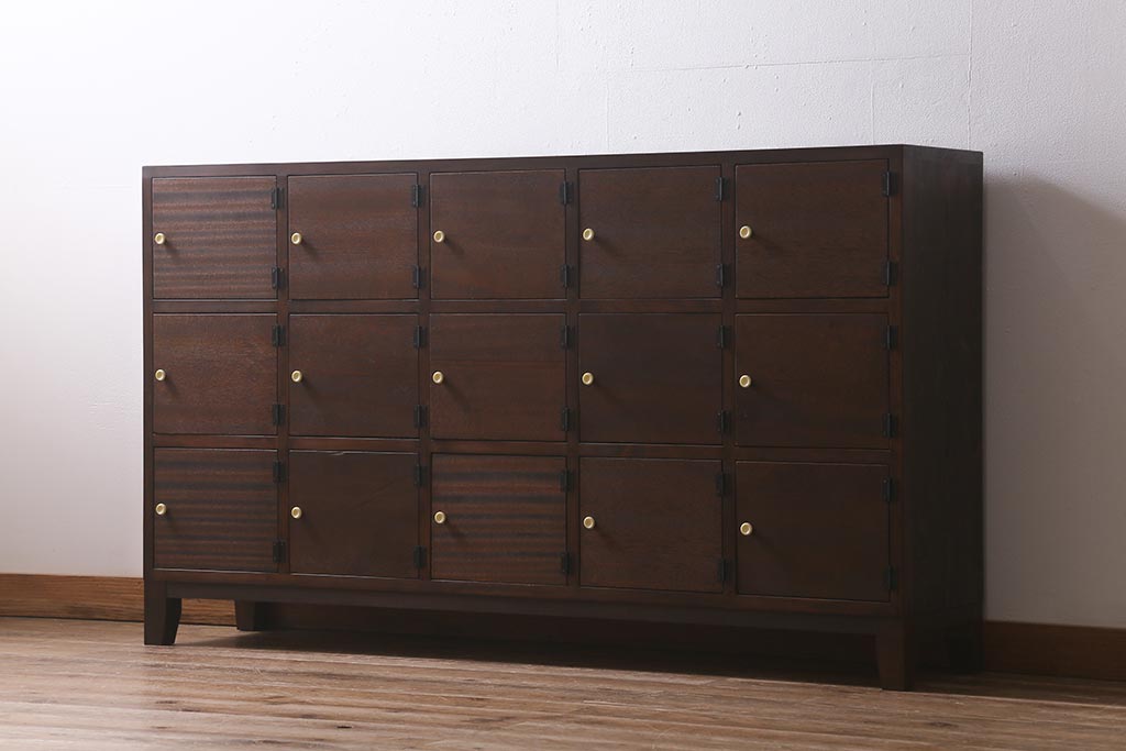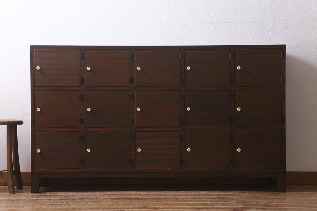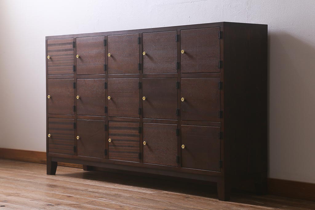 ワードローブ・ロッカー> ロッカー > ラフジュ工房オリジナル 3×5マス 古材リメイク ヒノキ無垢材・ラワン古材 レトロな佇まいの脚付きマス目棚・右開き(収納棚、ロッカー、下駄箱)(R-042077)