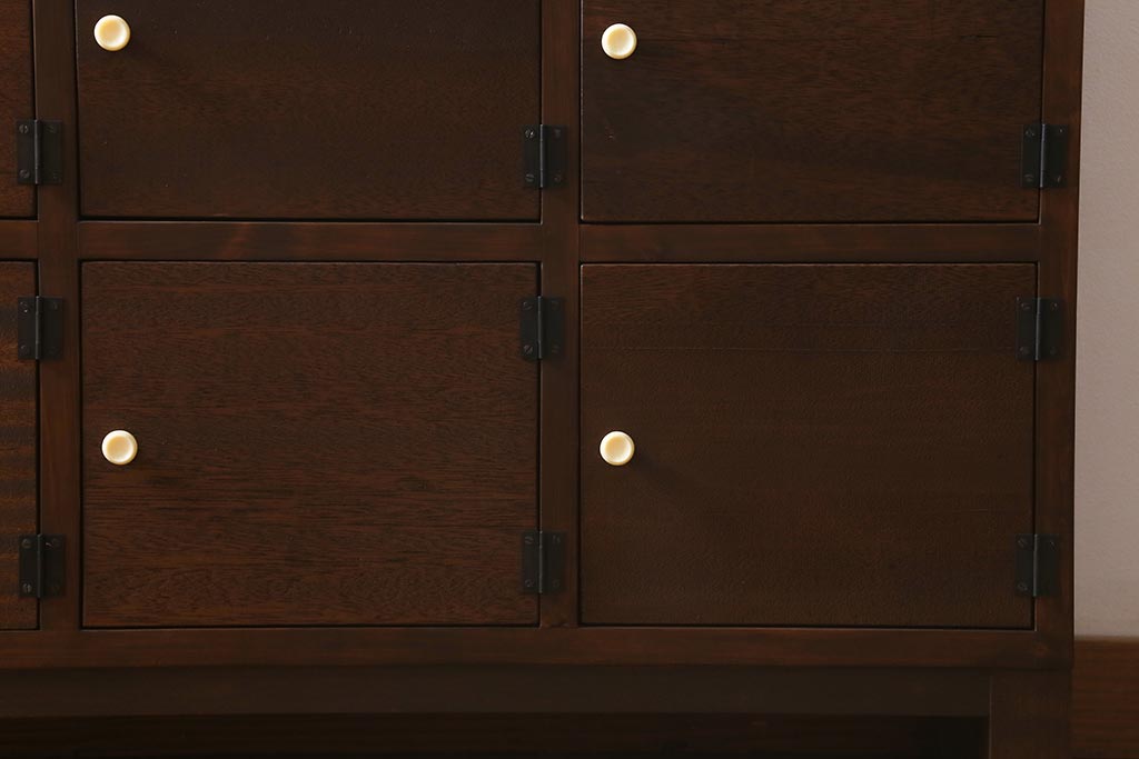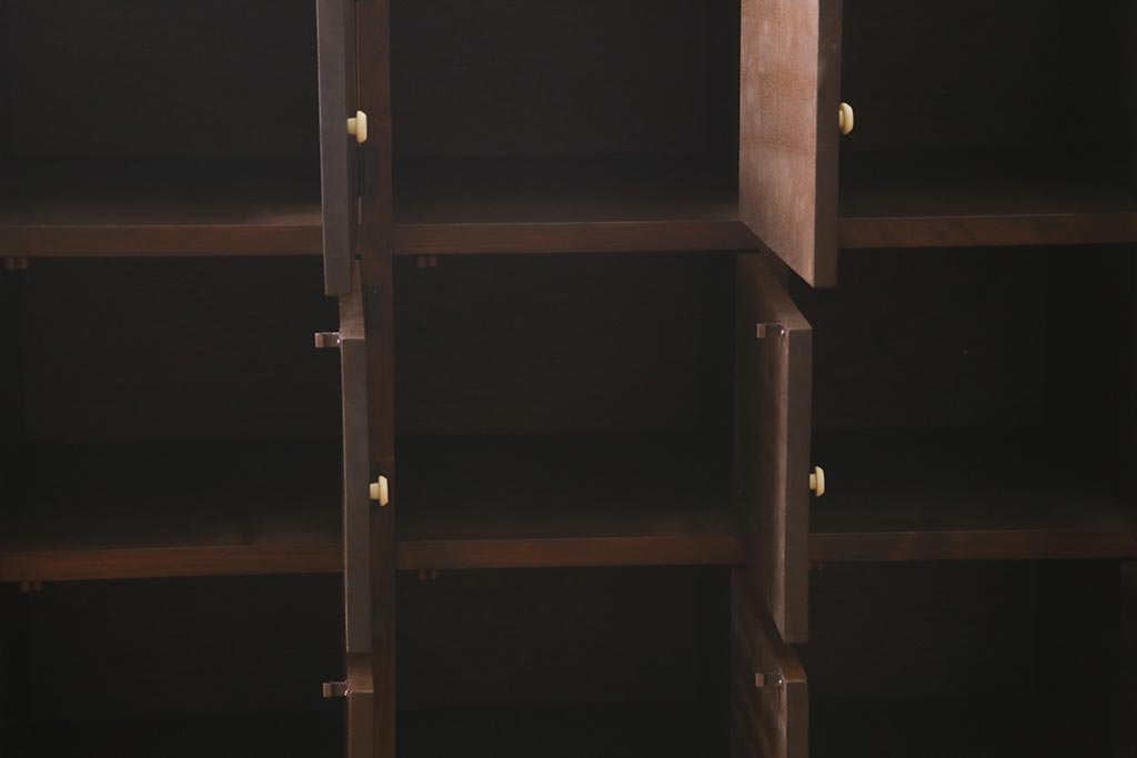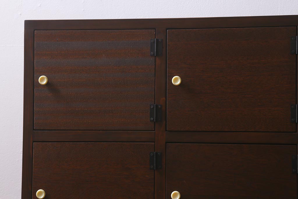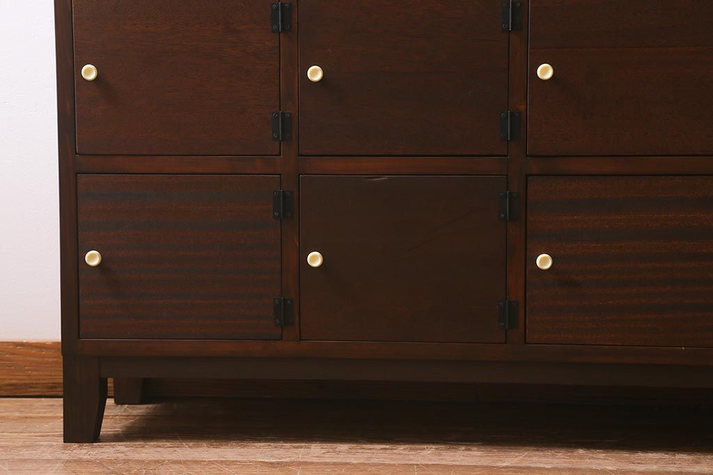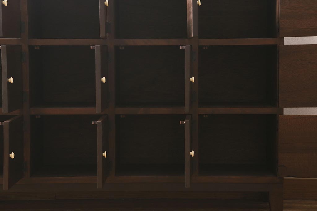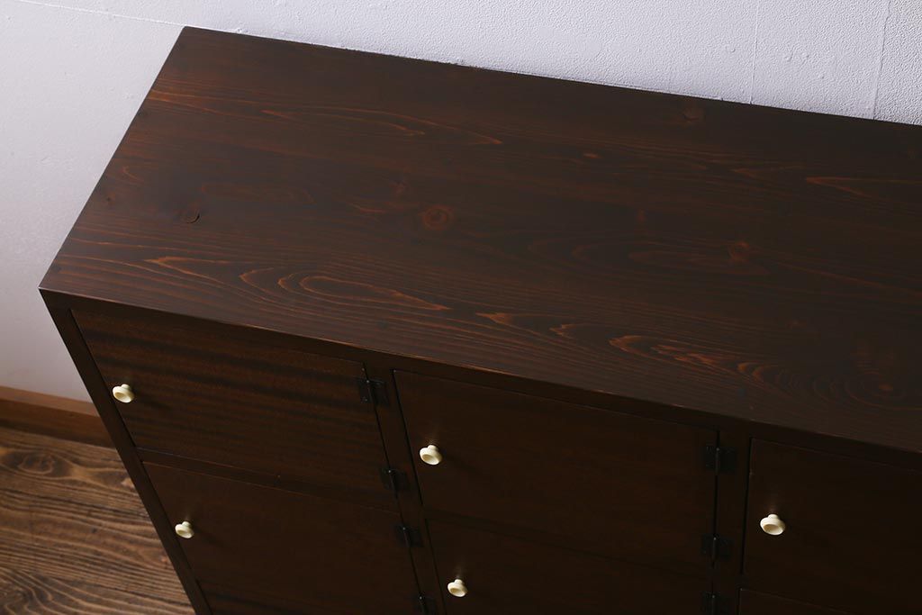 ワードローブ・ロッカー> ロッカー > ラフジュ工房オリジナル 3×5マス 古材リメイク ヒノキ無垢材・ラワン古材 レトロな佇まいの脚付きマス目棚・右開き(収納棚、ロッカー、下駄箱)(R-042077)