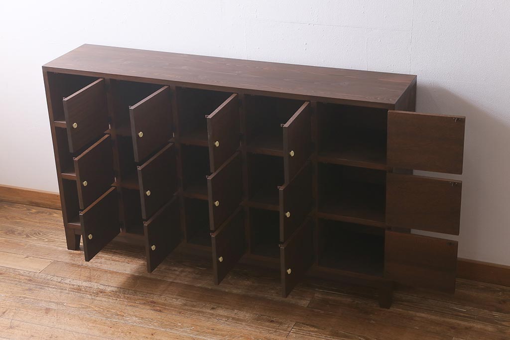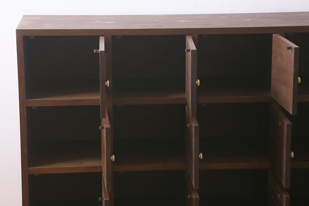 キャビネット・戸棚> 下駄箱 > ラフジュ工房オリジナル 3×5マス 古材リメイク ヒノキ無垢材・ラワン古材 レトロな佇まいの脚付きマス目棚・右開き(収納棚、ロッカー、下駄箱)(R-042077)