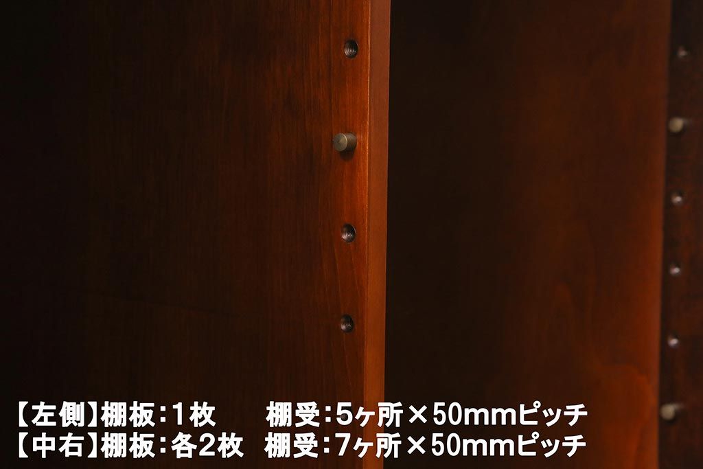 棚板は取り外しできます。棚板は左1枚、中右各2枚あります。棚受けは左5ヶ所、中右7ヶ所、各50mmピッチで調整できます。棚幅サイズのものが1枚の作りです。