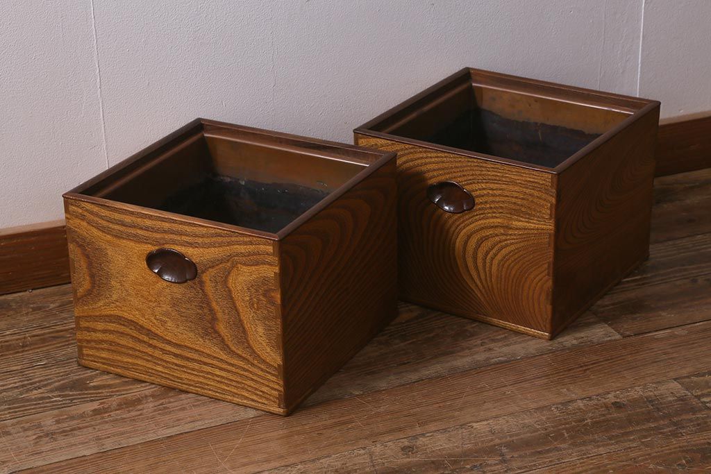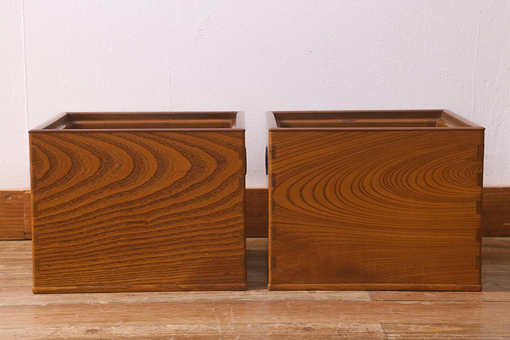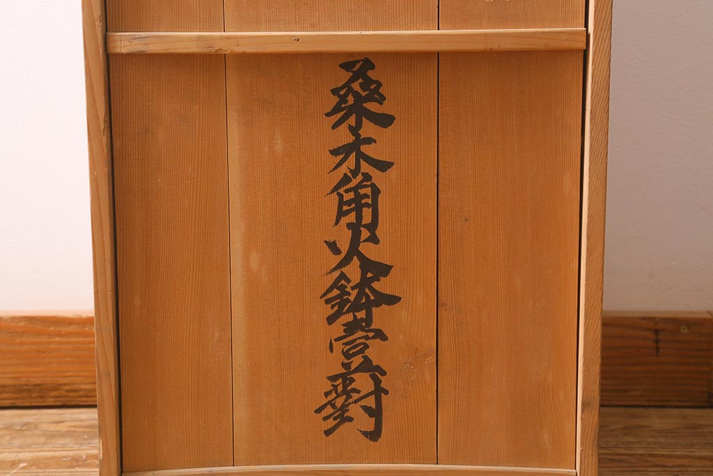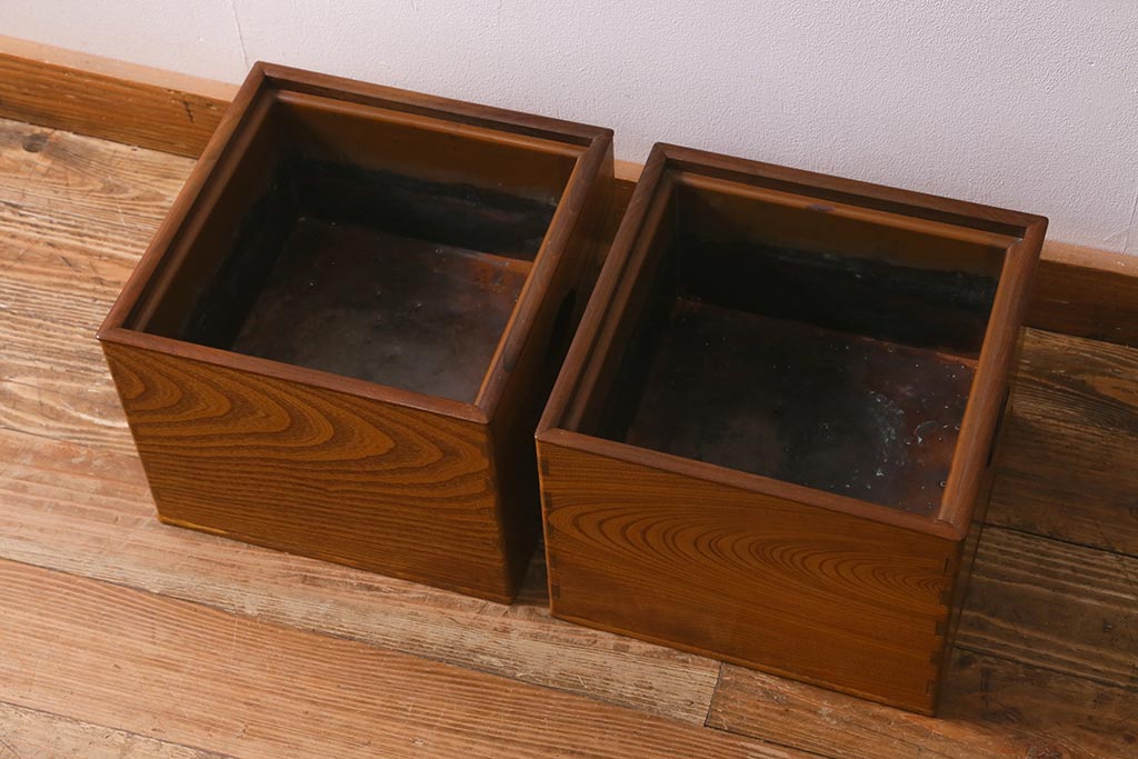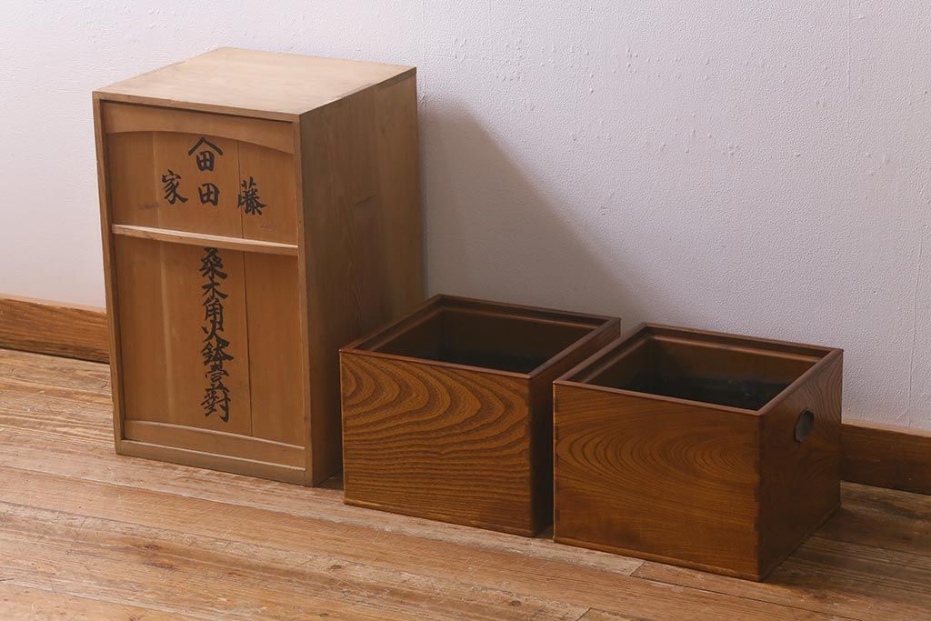 火鉢> 木製火鉢 > アンティーク雑貨 昭和初期 高級品! 桑材 共箱付き 美しい杢目の角火鉢一対(箱火鉢、手あぶり)(R-042074)