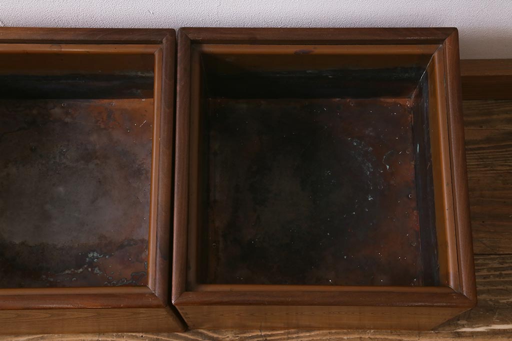 アンティーク雑貨 昭和初期 高級品! 桑材 共箱付き 美しい杢目の角火鉢一対(箱火鉢、手あぶり)(R-042074)です。