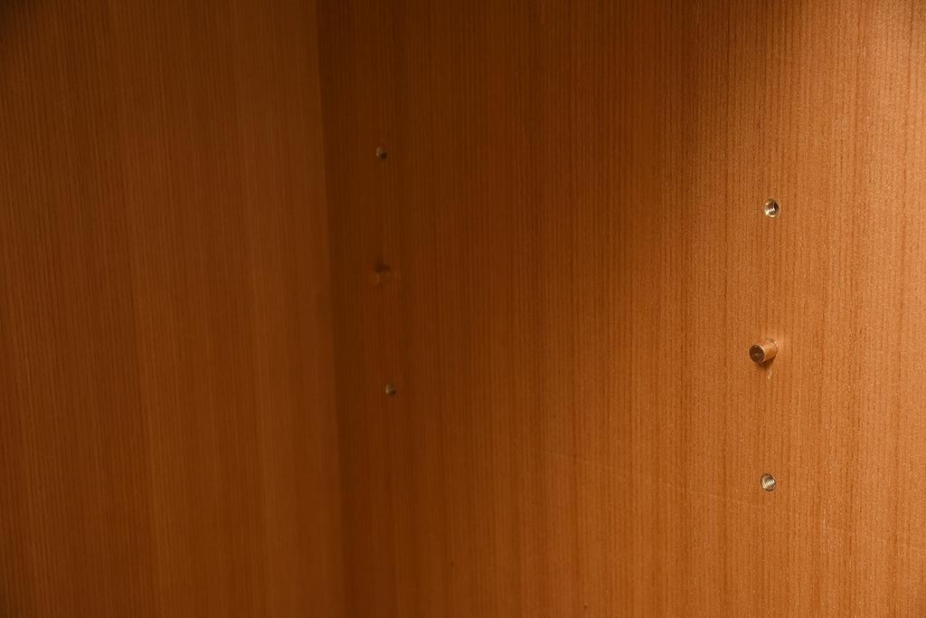 棚板は取り外しできます。棚板は2枚あります。棚受けは3ヶ所、60mmピッチで調整できます。棚幅サイズのものが1枚の作りです。