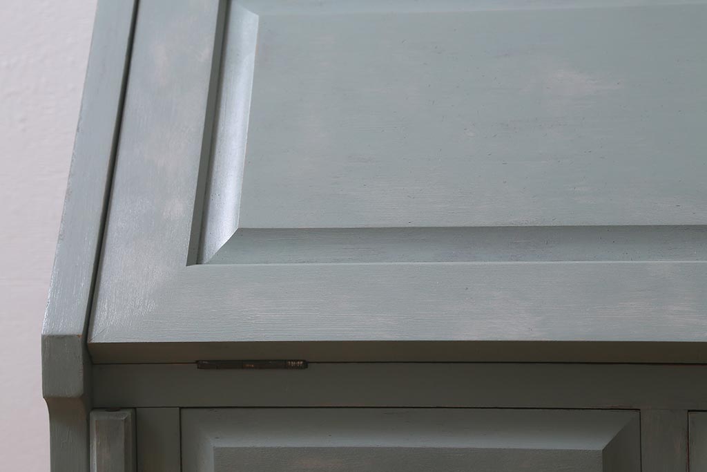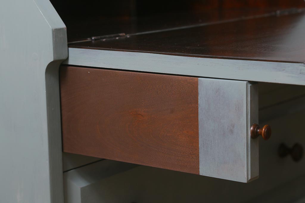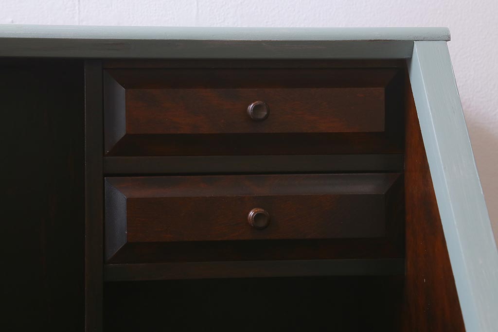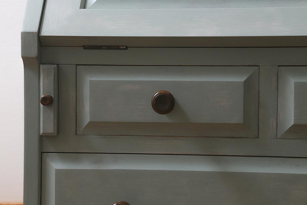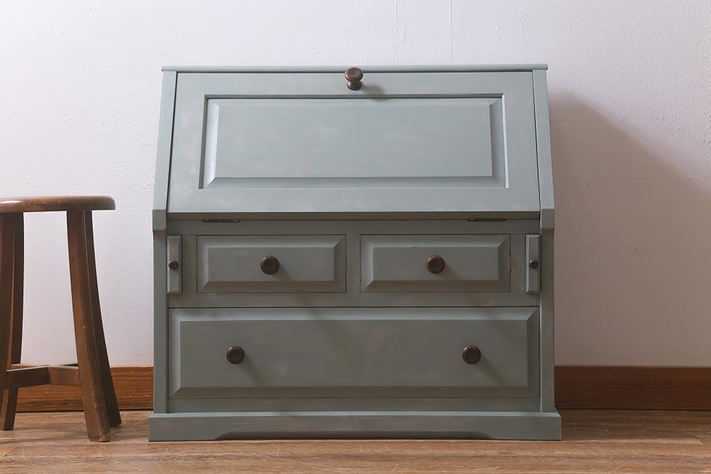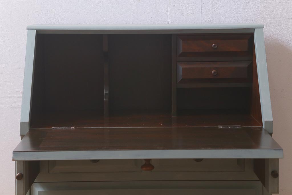 中古 北海道民芸家具 グレイッシュなカラーがおしゃれなペイントライティングビューロー(机、引き出し)(R-042219)