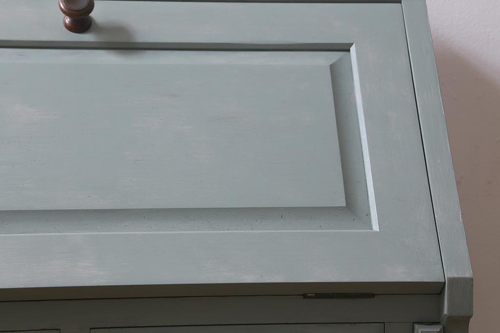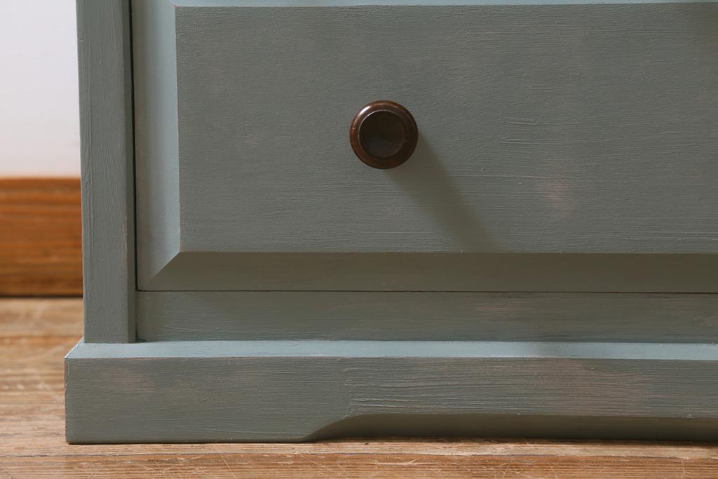 中古 北海道民芸家具 グレイッシュなカラーがおしゃれなペイントライティングビューロー(机、引き出し)(R-042219)です。