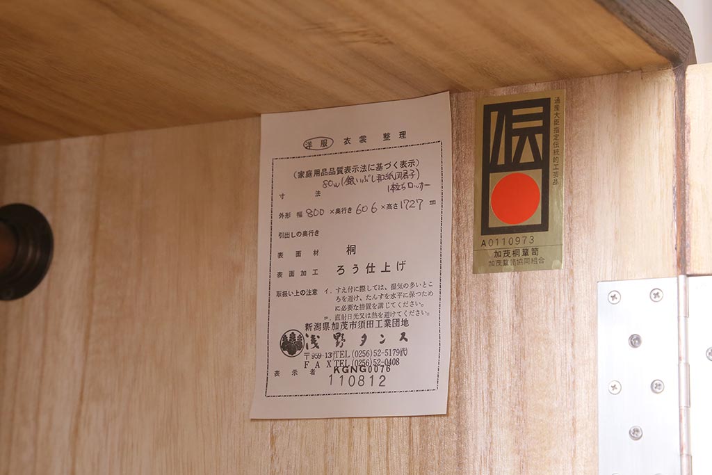 民芸家具 > 中古 伝統工芸品 高級品 総桐材 上品な意匠金具が目を引く加茂総桐箪笥(総桐たんす、衣装箪笥、洋服タンス)(R-042124)