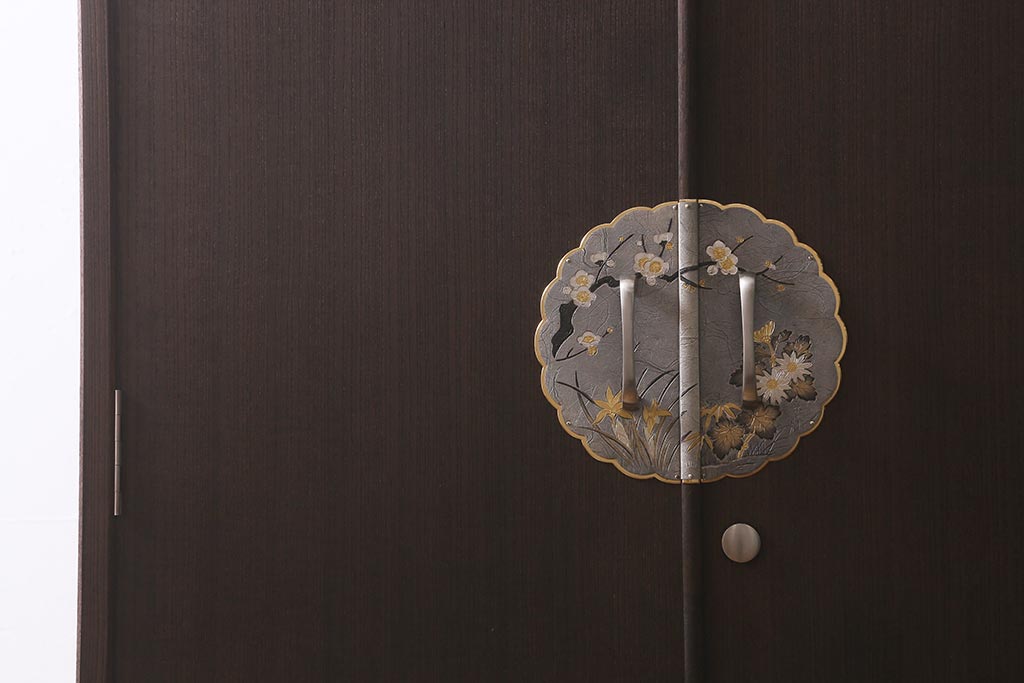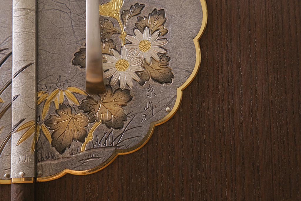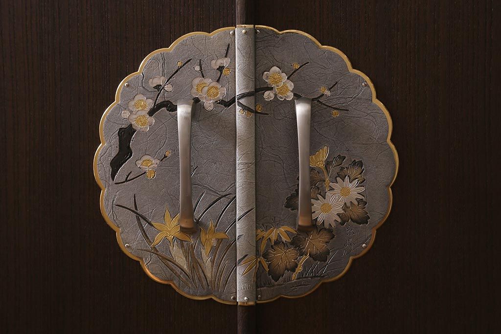 梅、菖蒲、菊、笹の模様の意匠金具が