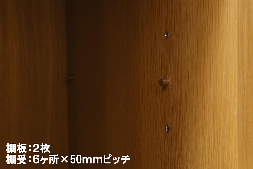 棚板は取り外しできます。棚板は2枚あります。棚受けは6ヶ所、50mmピッチで調整できます。棚幅サイズのものが1枚の作りです。