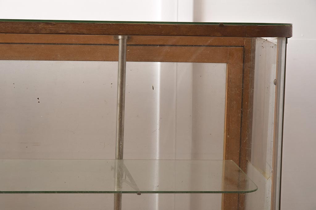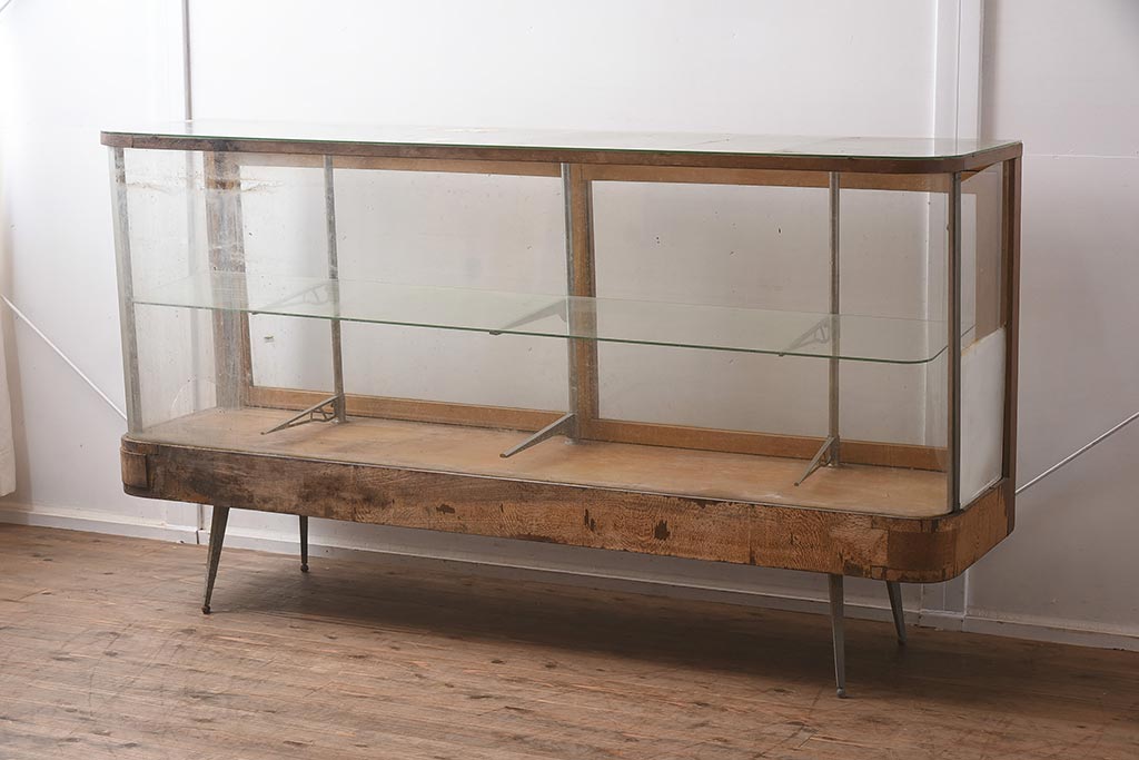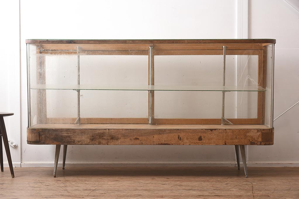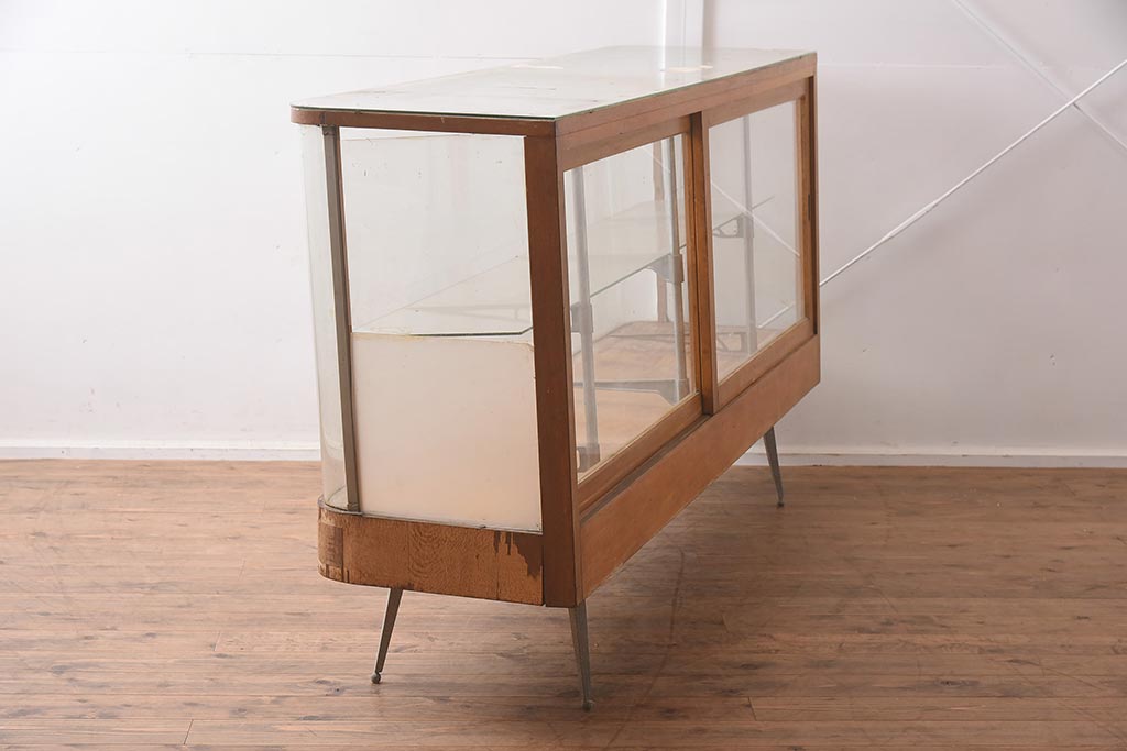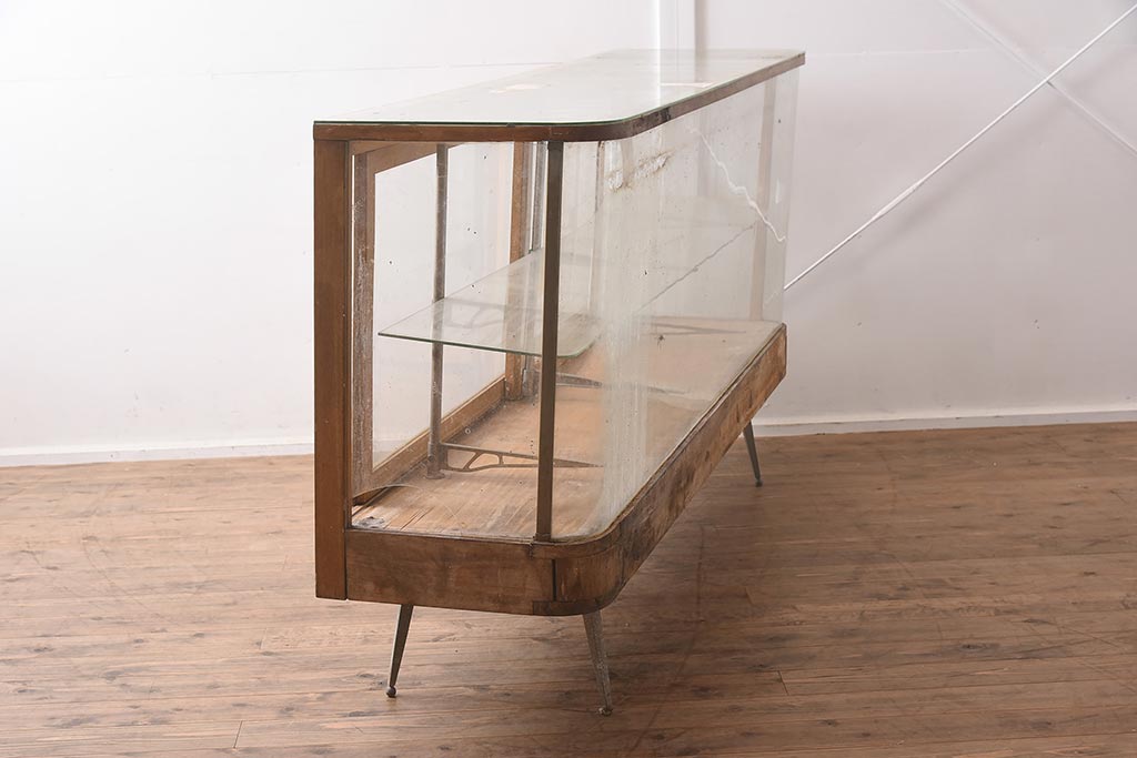 店舗什器 > レトロ家具 脚付き ディスプレイが見やすいRガラスの木製ガラスケース(ショーケース、陳列棚、飾り棚)(R-042267)