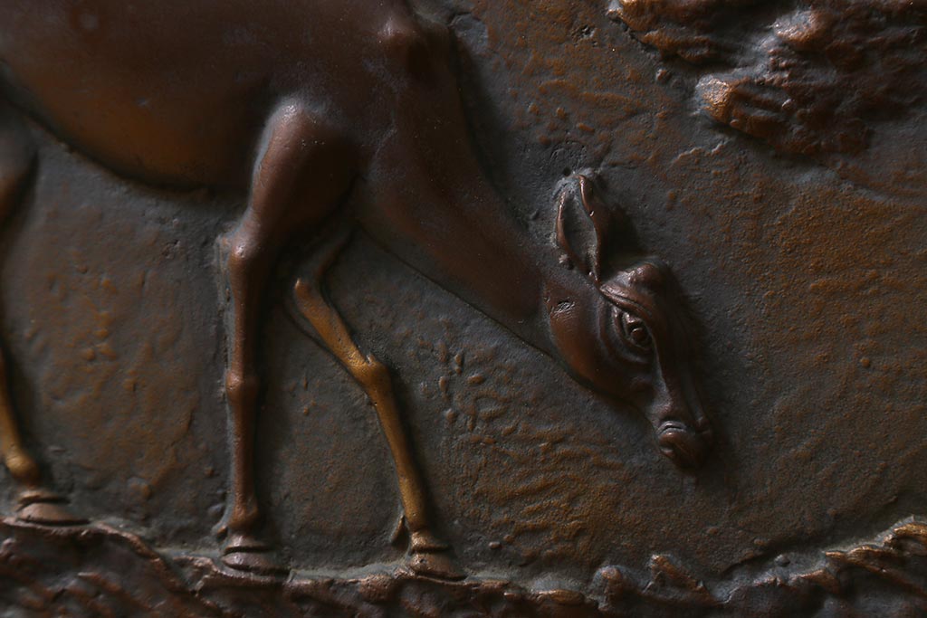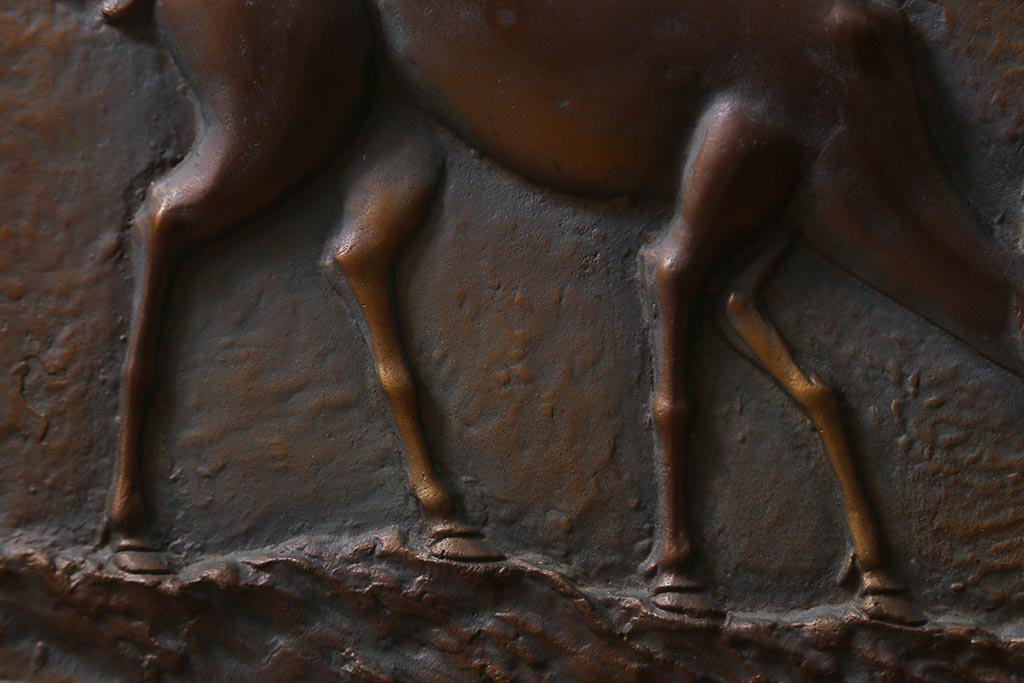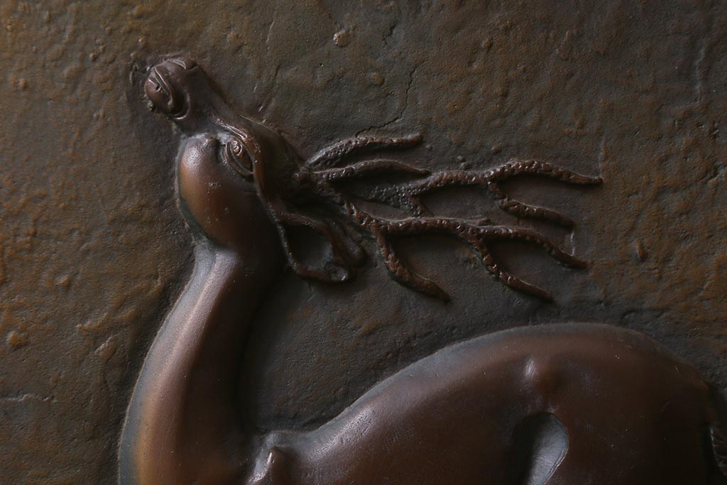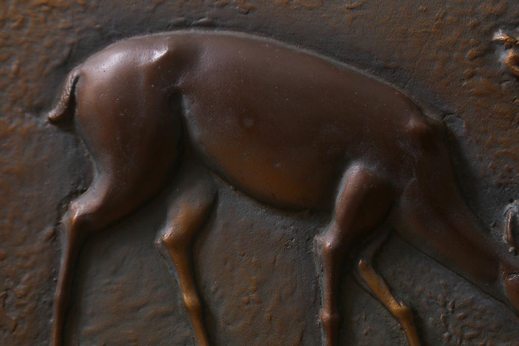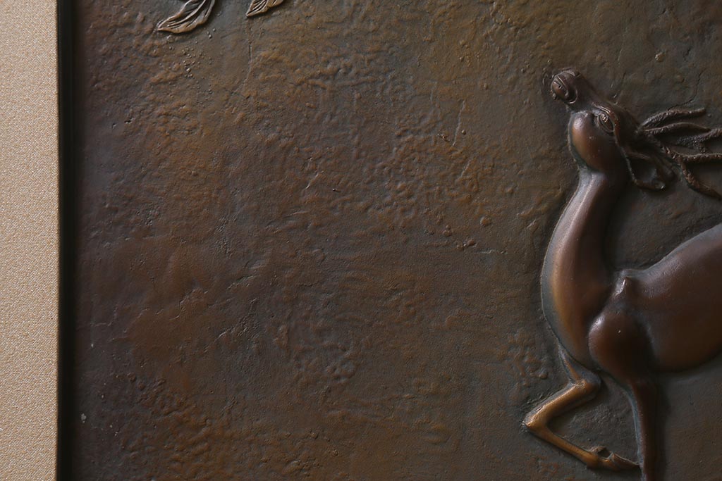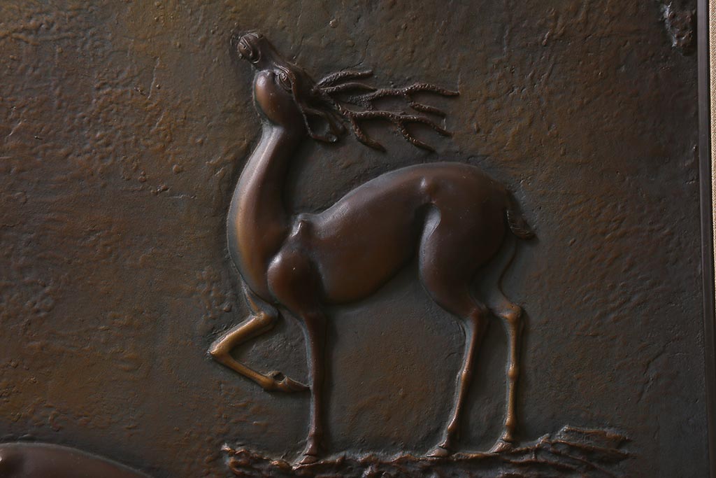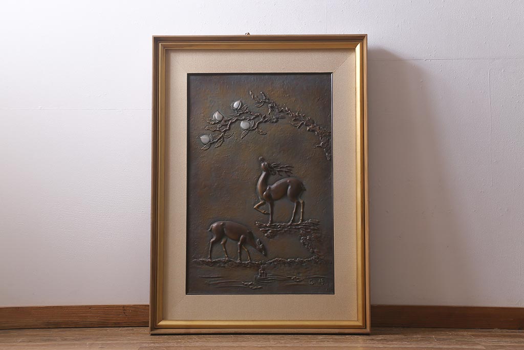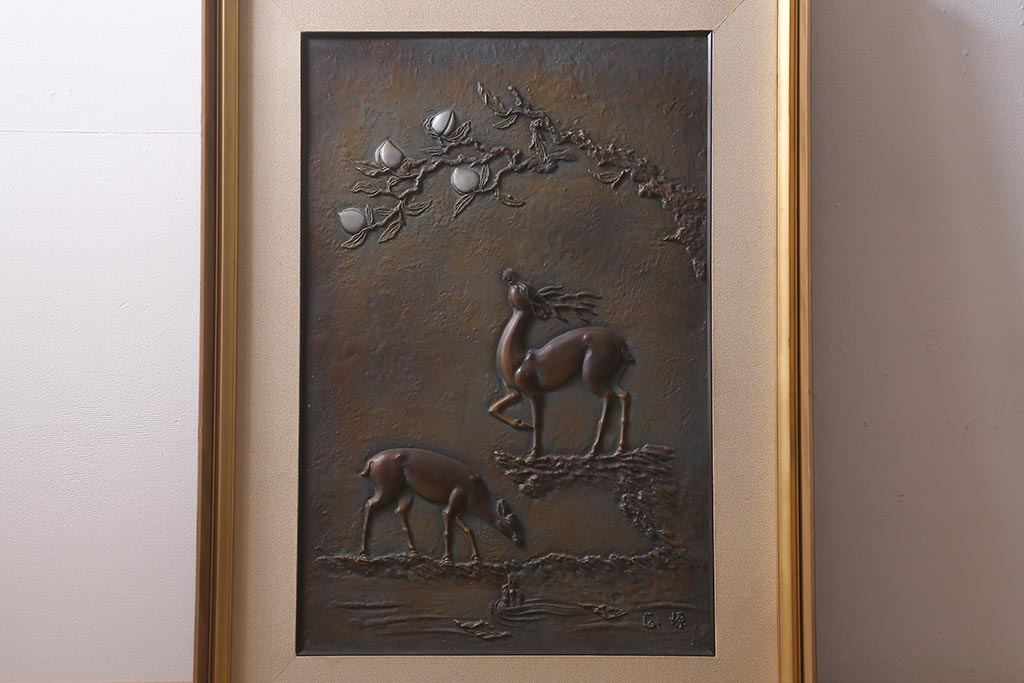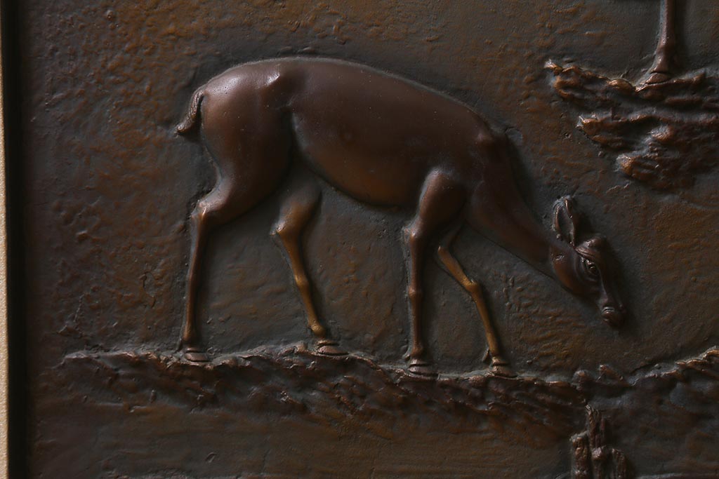 ビンテージ雑貨 正源作 ブロンズレリーフ 鹿と桃(銅板)(R-042068)