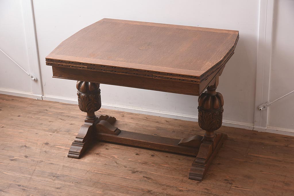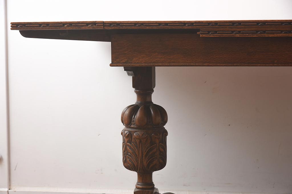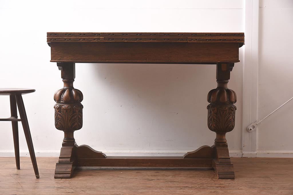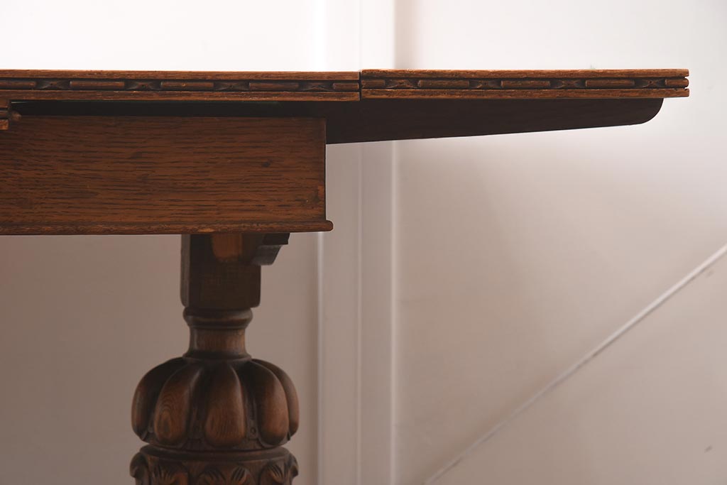 テーブル> 2人用ダイニングテーブル > アンティーク家具 イギリスアンティーク オーク材 存在感あるバルボスレッグのドローリーフテーブル(エクステンションテーブル、ダイニングテーブル)(R-042214)