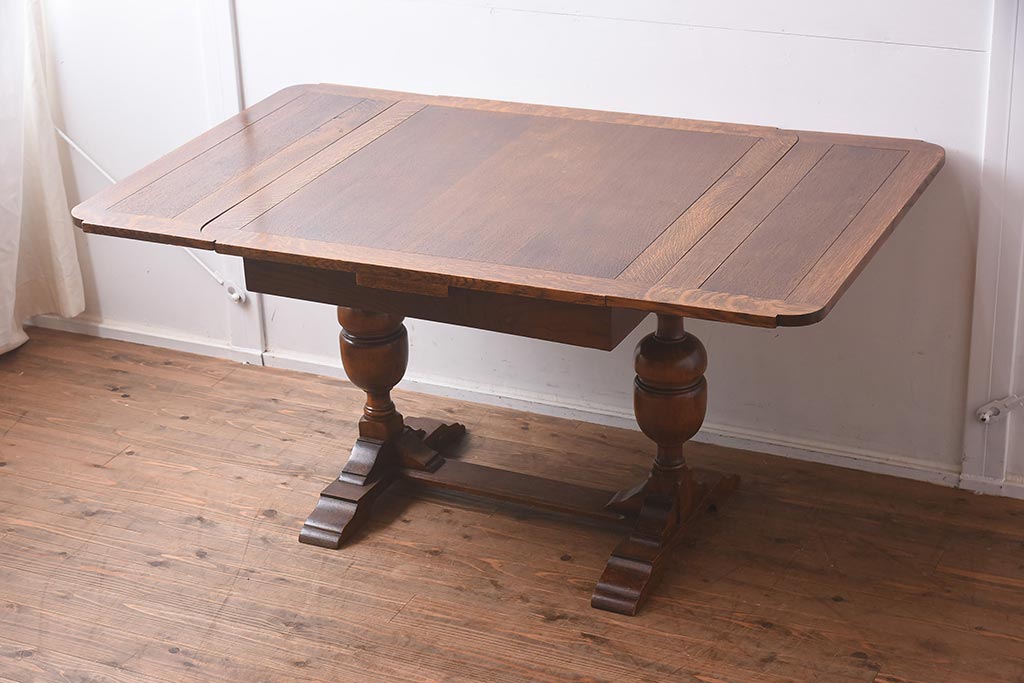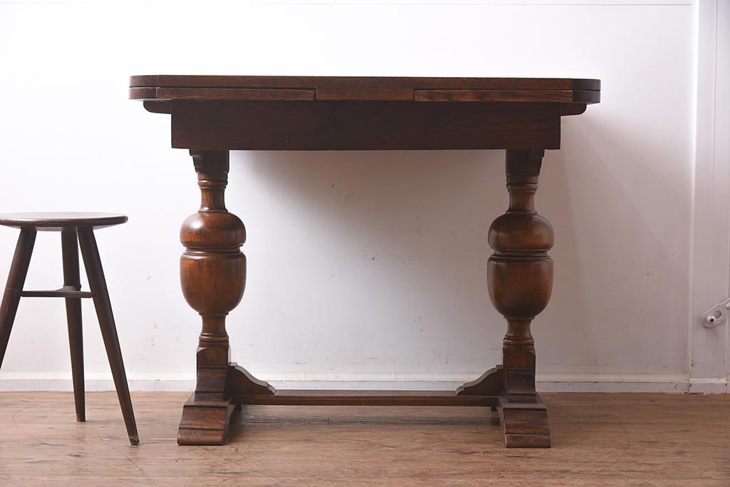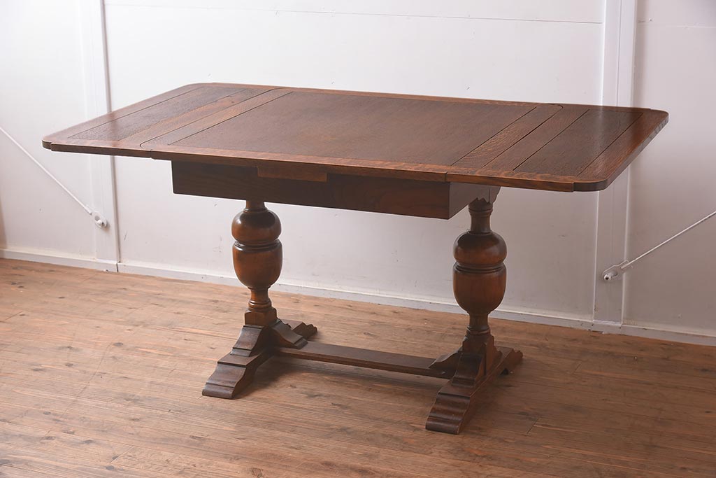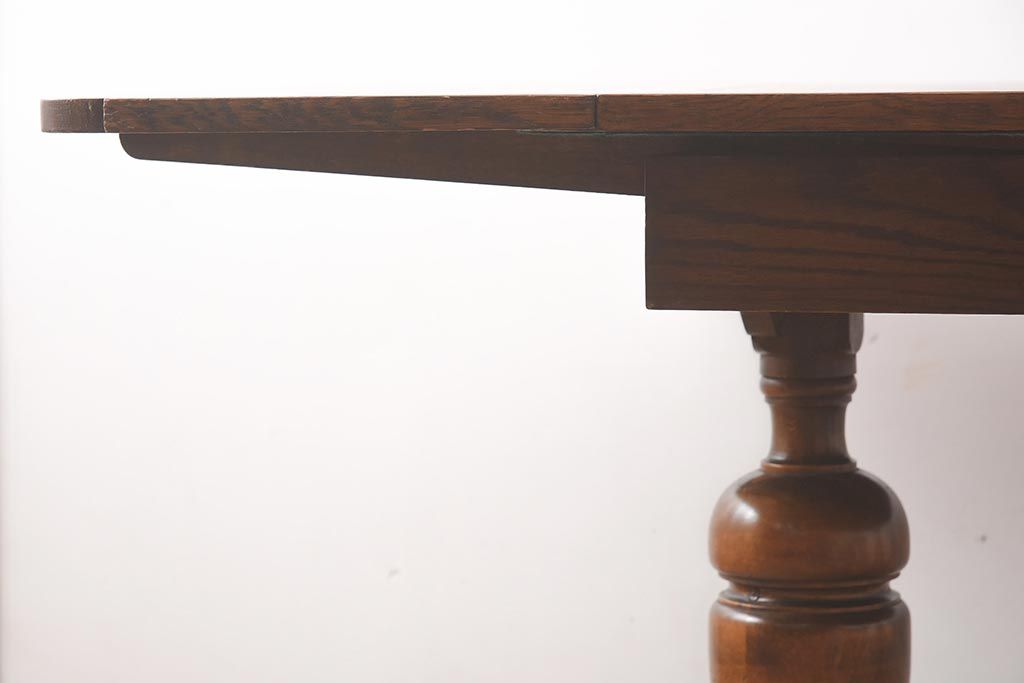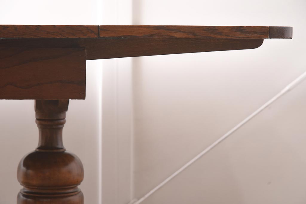 テーブル> 2人用ダイニングテーブル > アンティーク家具 イギリスアンティーク オーク材 丸みのあるバルボスレッグが魅力的なドローリーフテーブル(エクステンションテーブル、ダイニングテーブル)(R-042217)