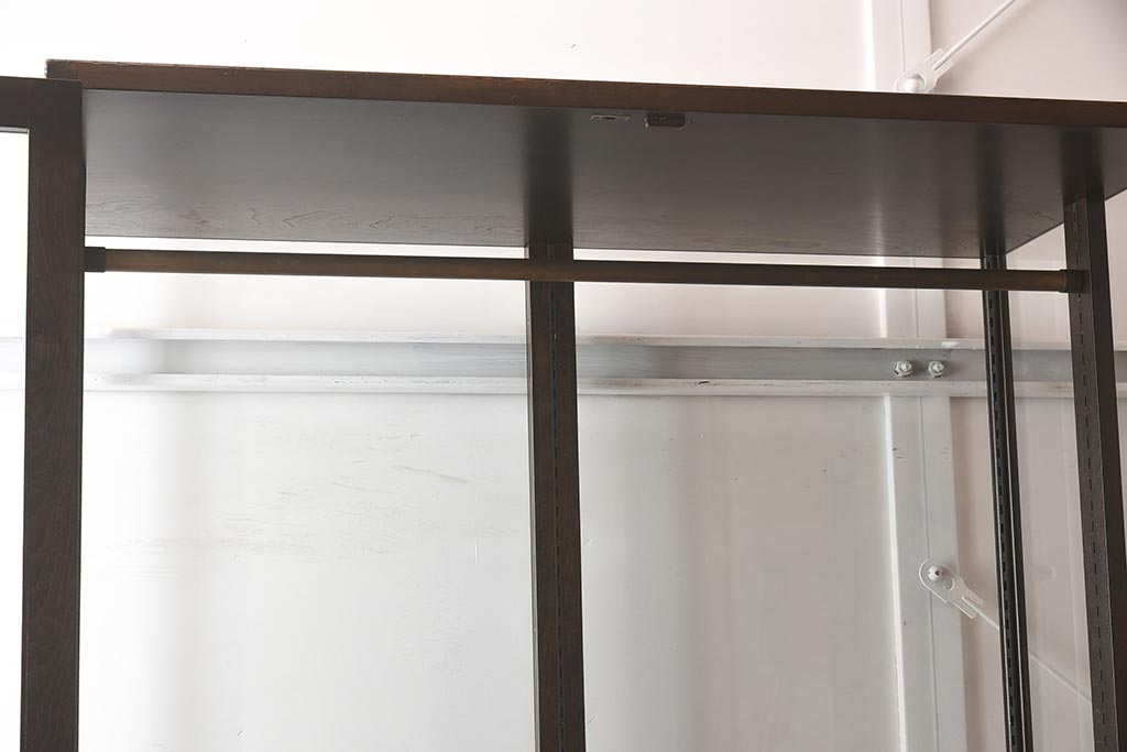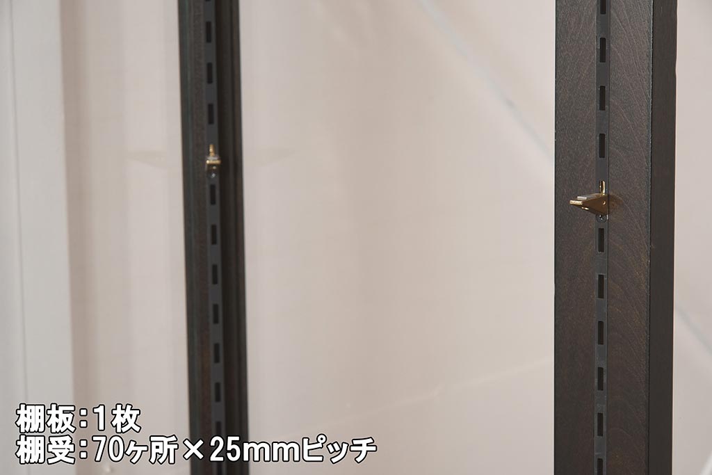 棚板は取り外しできます。棚板は1枚あります。棚受けは70ヶ所、25mmピッチで調整できます。棚幅サイズのものが1枚の作りです。