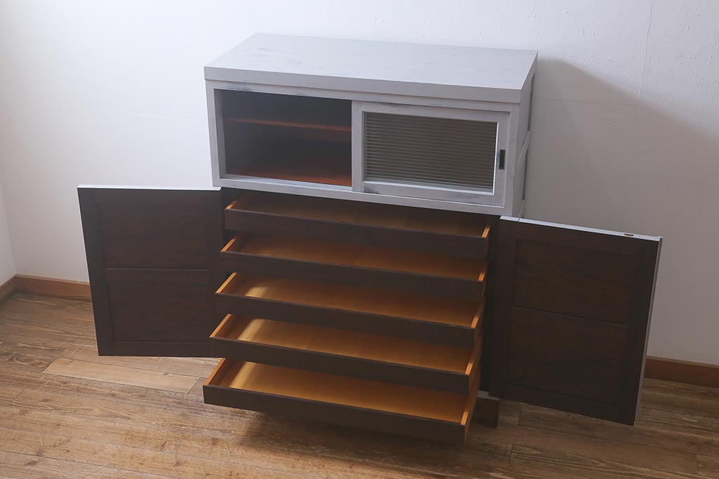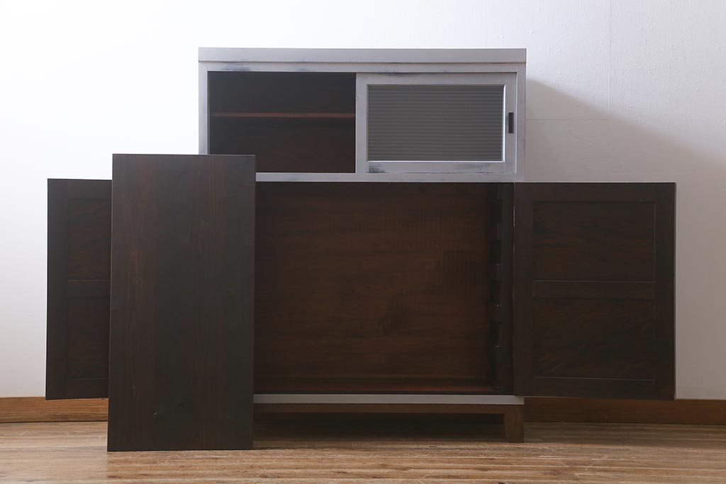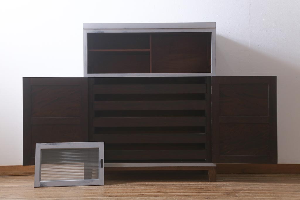 中古 当店リメイク家具 松本民芸家具 ペイント モールガラス入り 衣装盆と収納棚の2WAY使いができる脚付キャビネット(和タンス、戸棚、収納棚、着物箪笥)(R-042307)