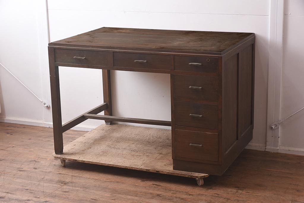 レトロ家具 昭和中期 栗材 ノスタルジックな雰囲気が魅力の片袖机(ワークデスク、在宅ワーク、在宅用、勉強机)(R-042332)