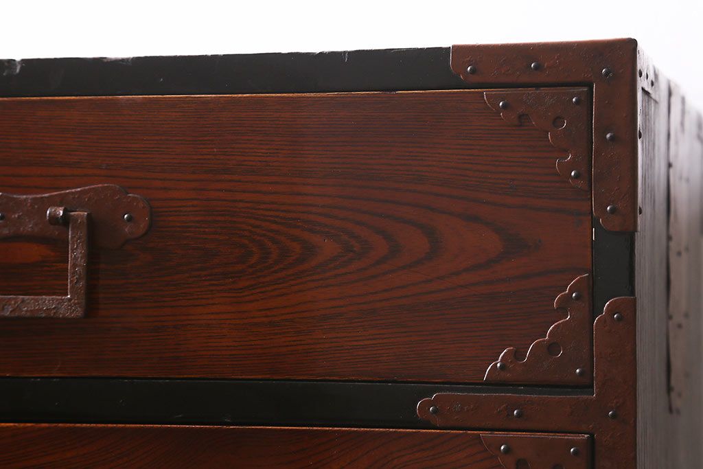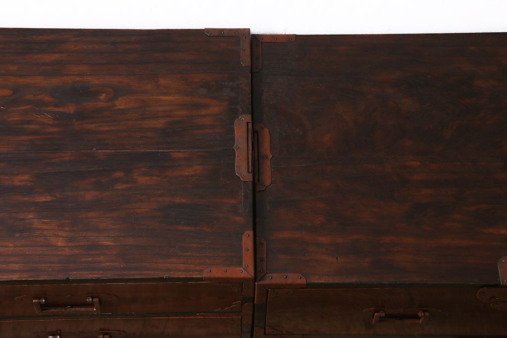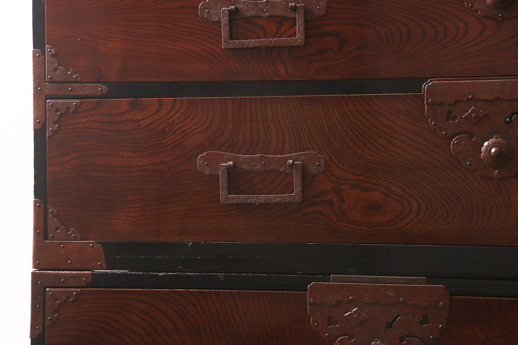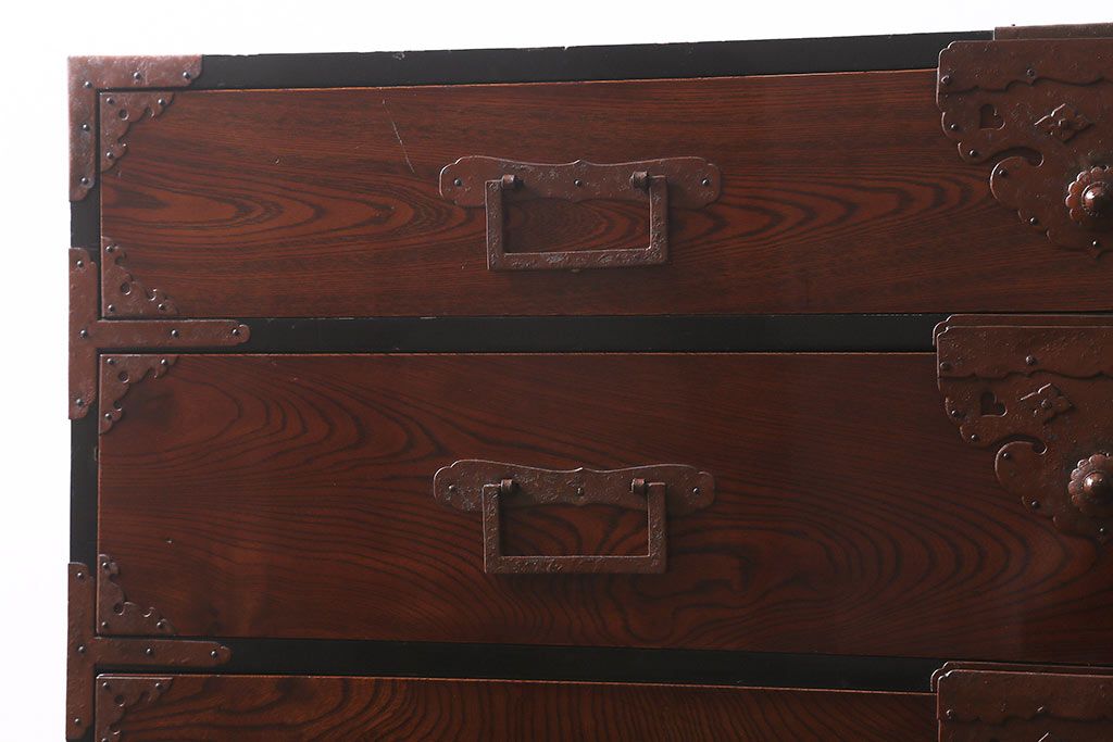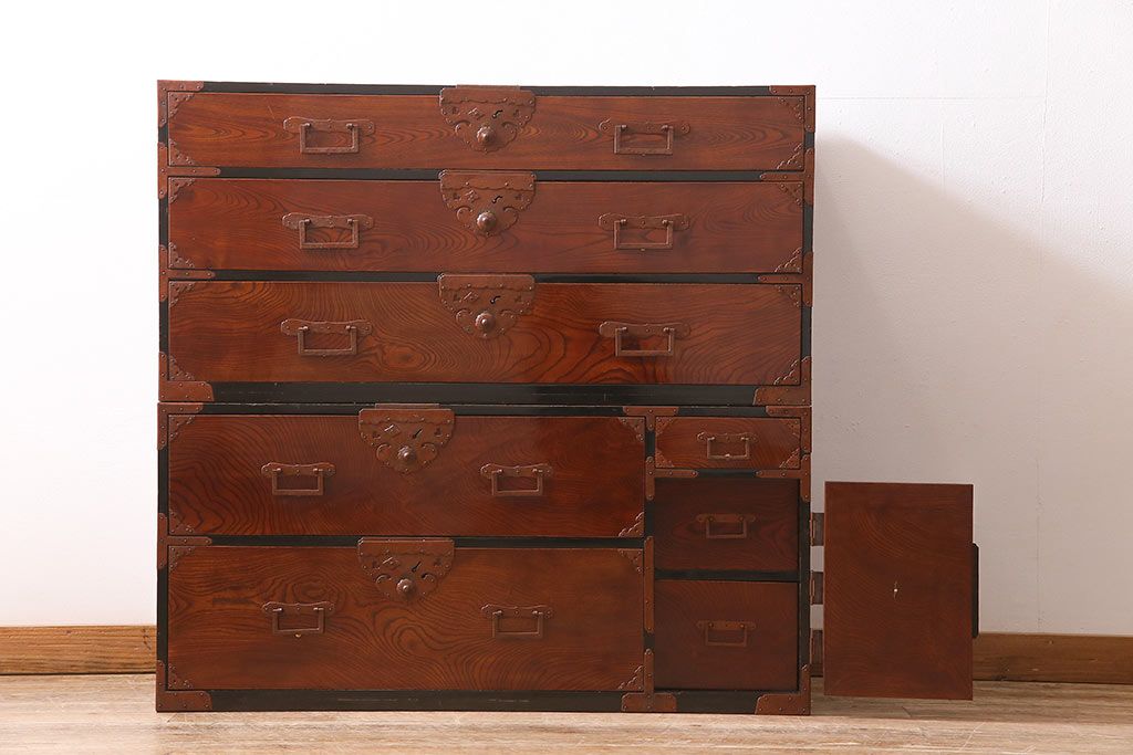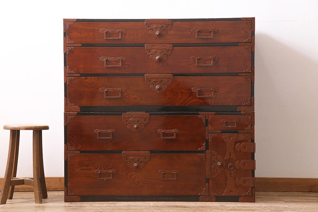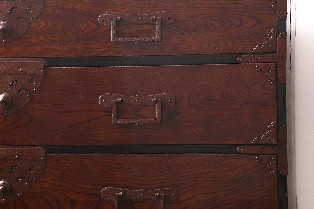 アンティーク家具 和製アンティーク 明治大正期 五丁引き 前面ケヤキ・中桐材 漆塗りが美しい秋田箪笥(重ね箪笥、衣装箪笥、引き出し)(R-042290)です。