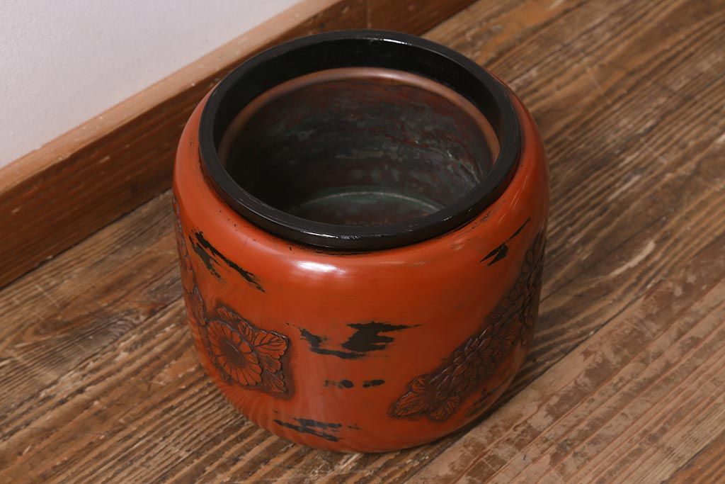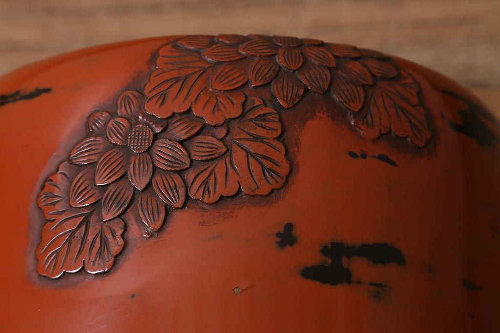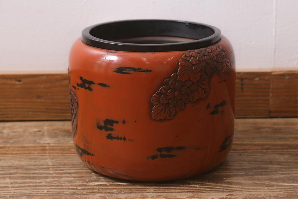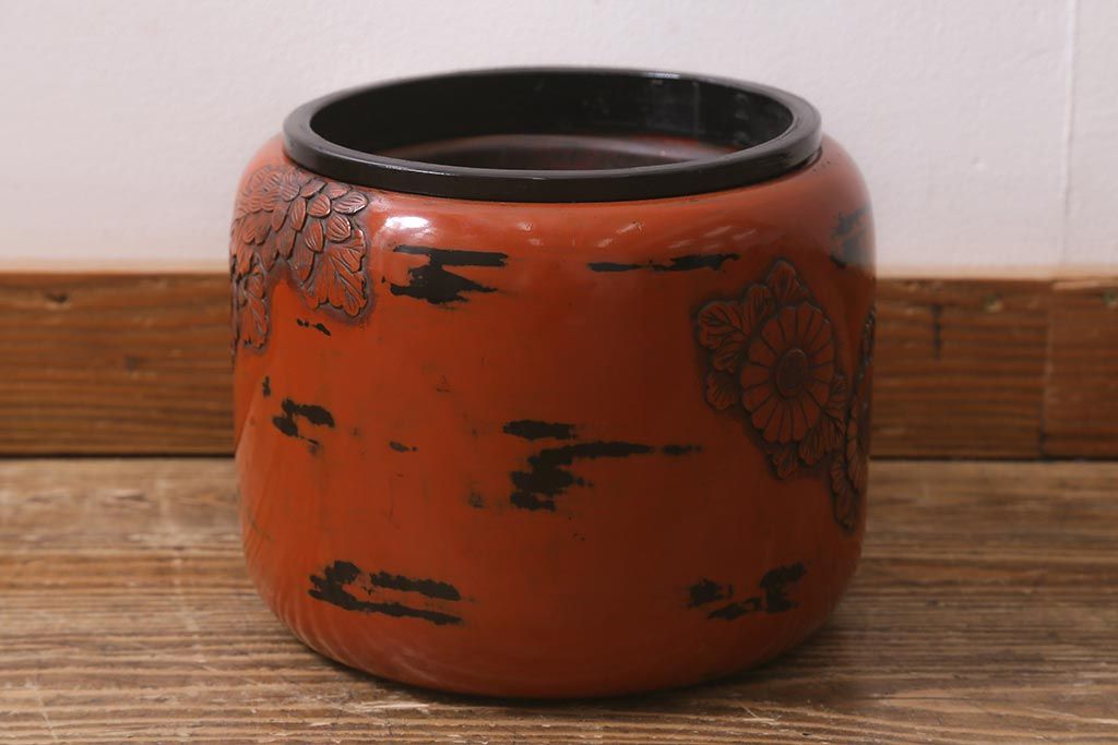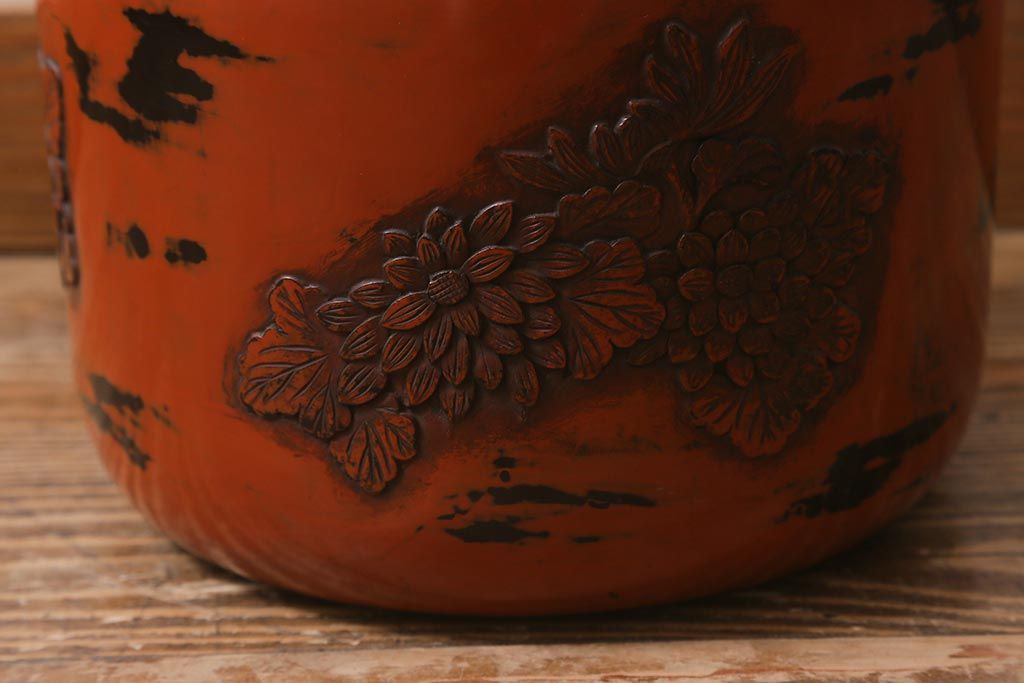 アンティーク雑貨 時代物 菊の図 古い鎌倉彫根来塗火鉢(てあぶり)(R-042066)