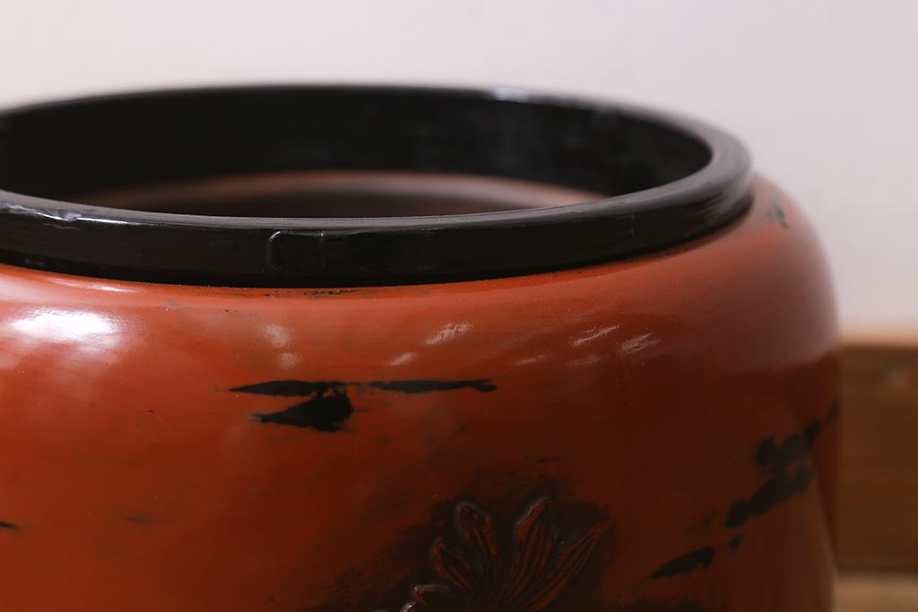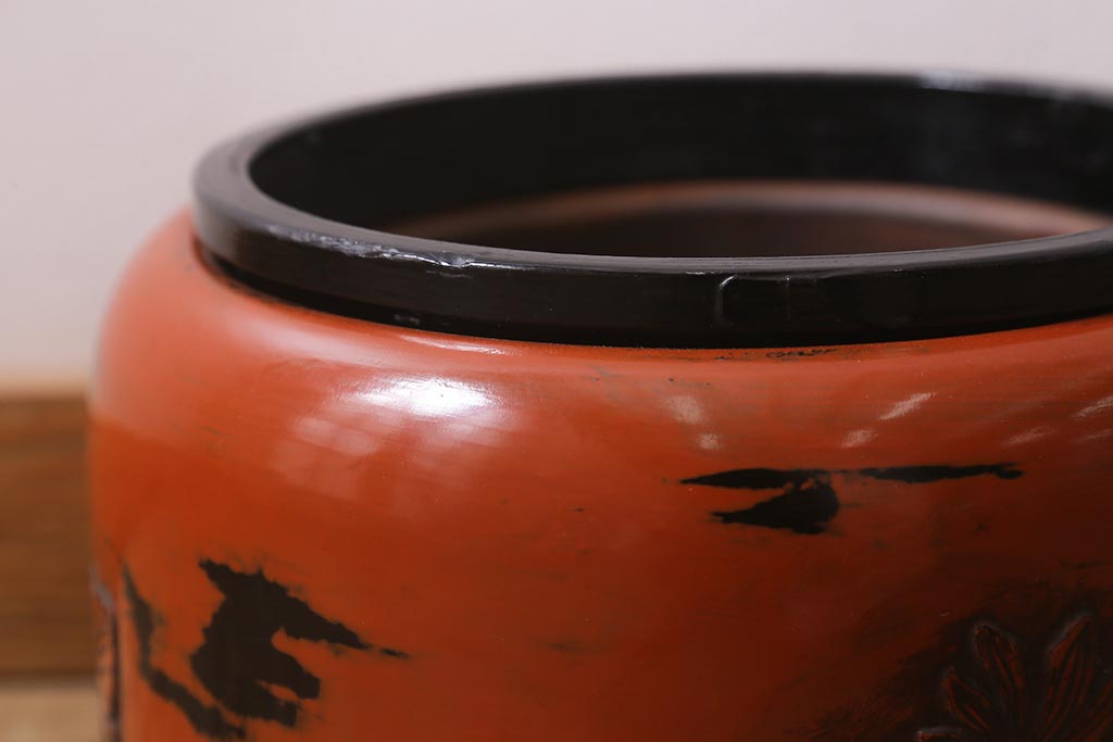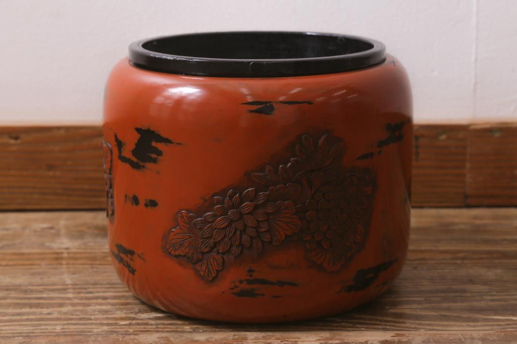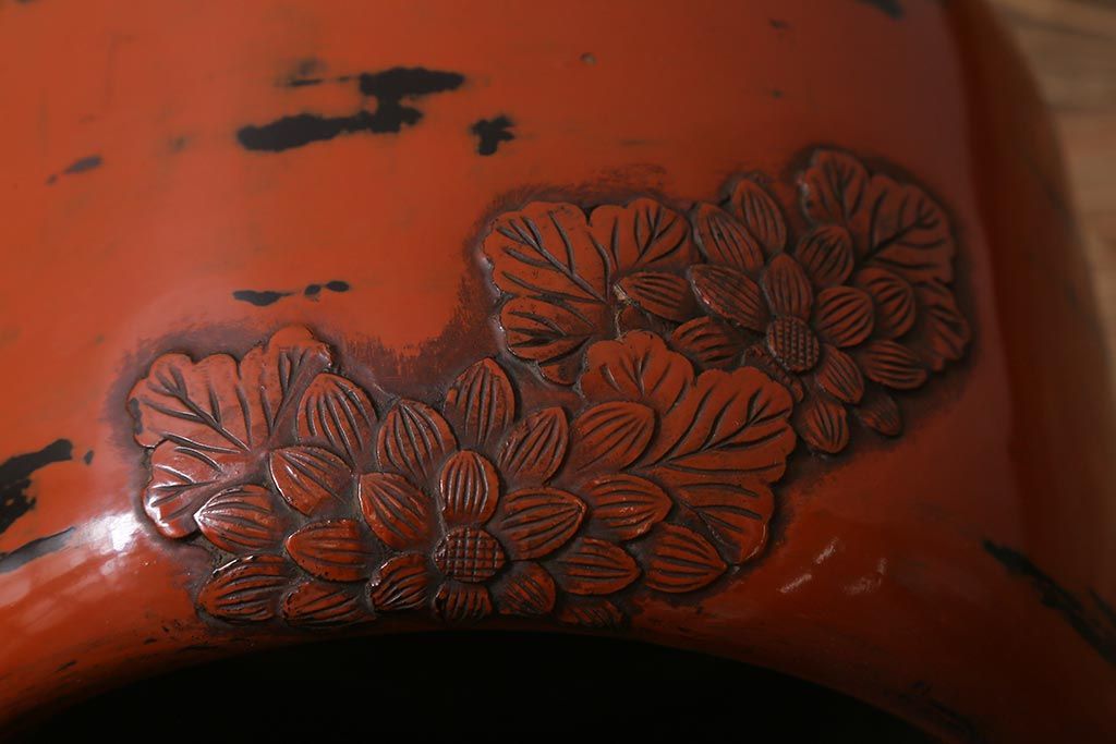 火鉢> 木製火鉢 > アンティーク雑貨 時代物 菊の図 古い鎌倉彫根来塗火鉢(てあぶり)(R-042066)