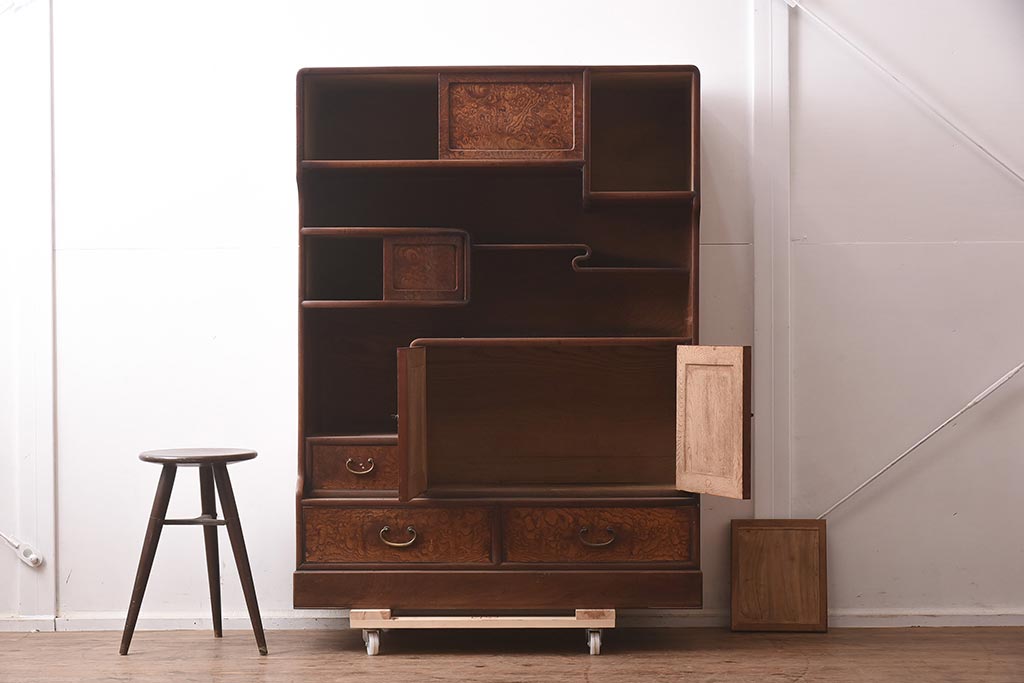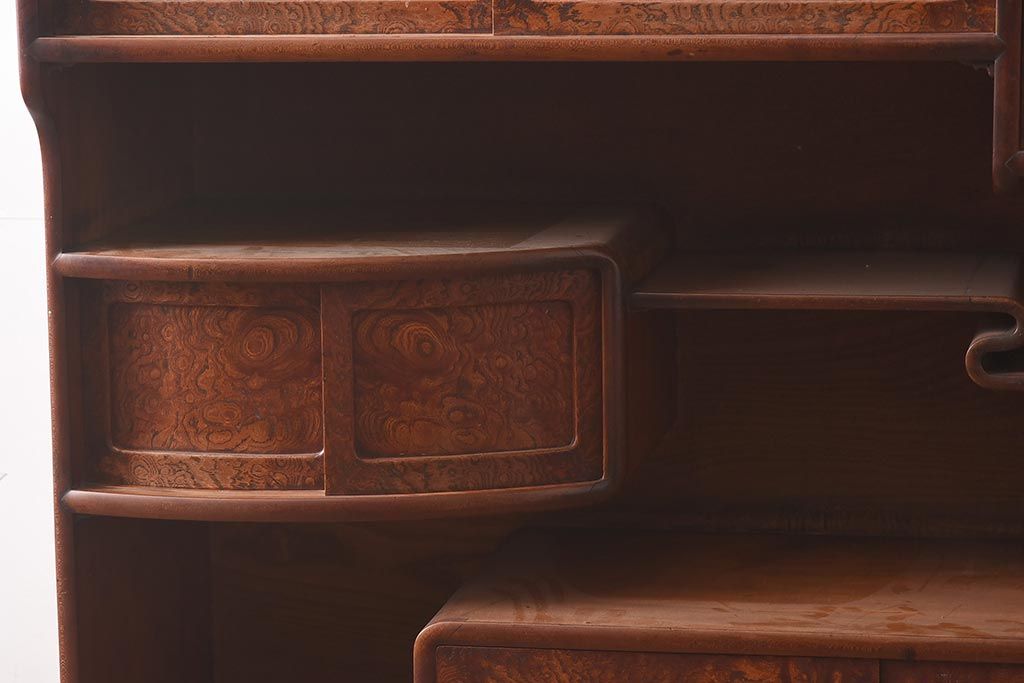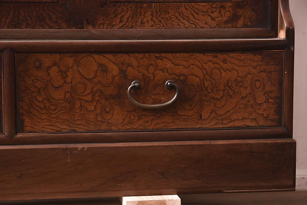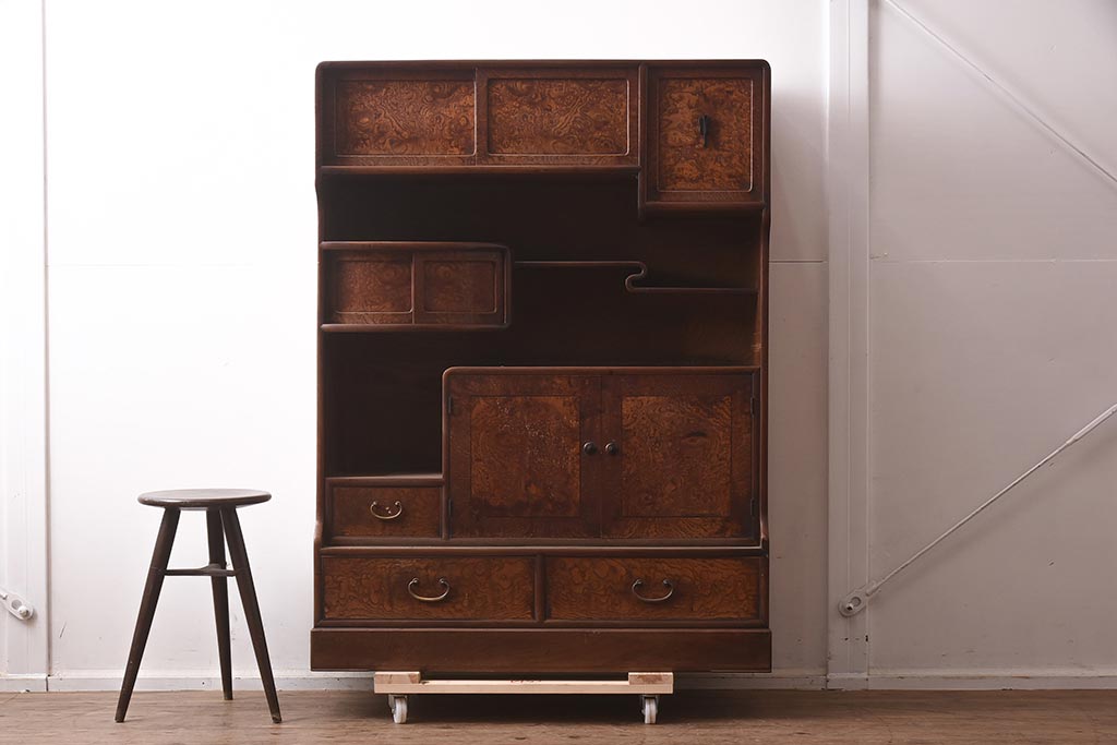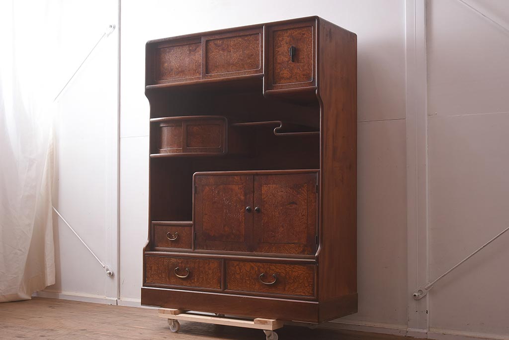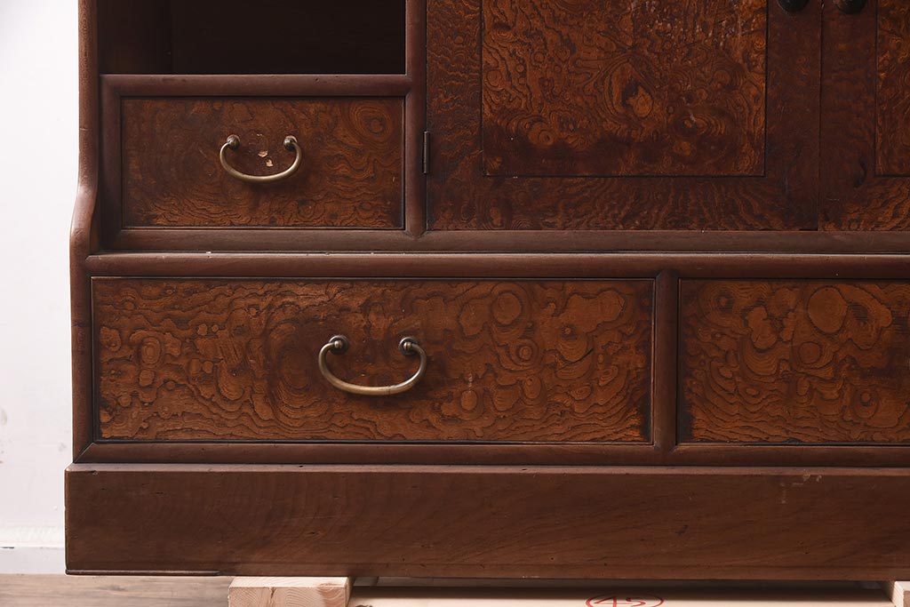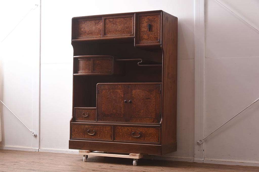 和箪笥> 茶箪笥・茶棚 > アンティーク家具 大正昭和初期 前面欅(ケヤキ)玉杢材 凝った造りの茶箪笥(飾り棚、茶棚)(R-042457)