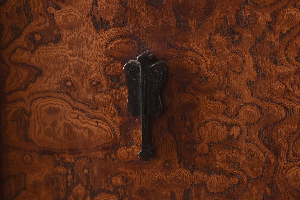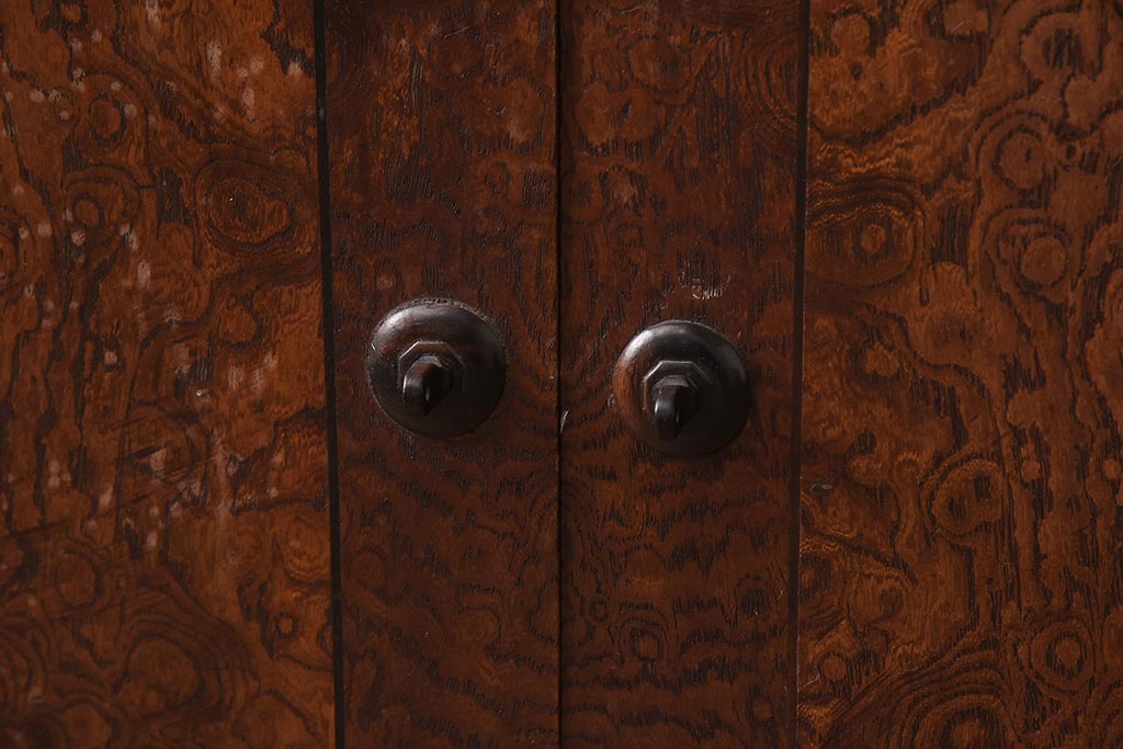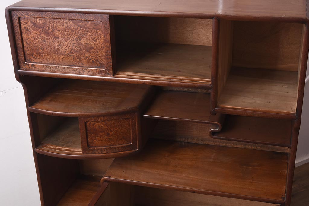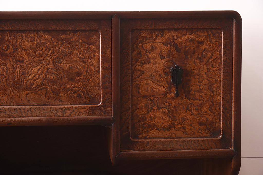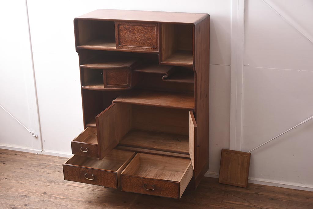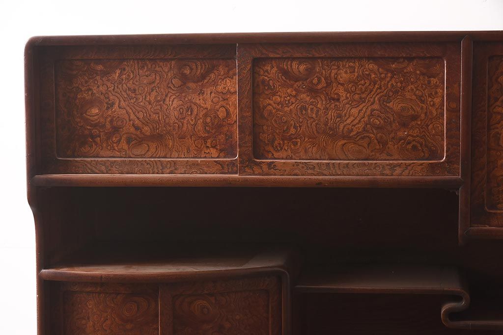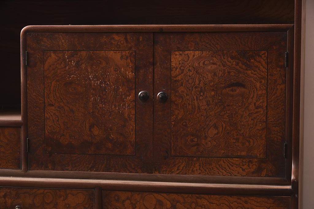 和箪笥> 茶箪笥・茶棚 > アンティーク家具 大正昭和初期 前面欅(ケヤキ)玉杢材 凝った造りの茶箪笥(飾り棚、茶棚)(R-042457)