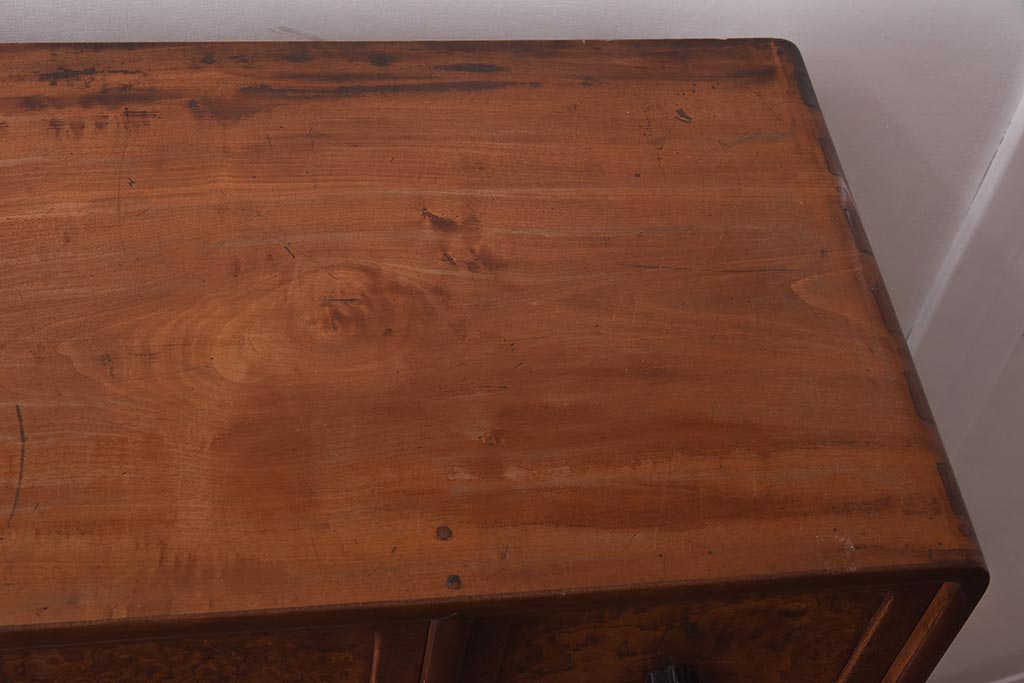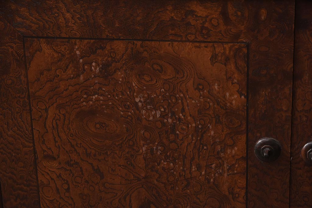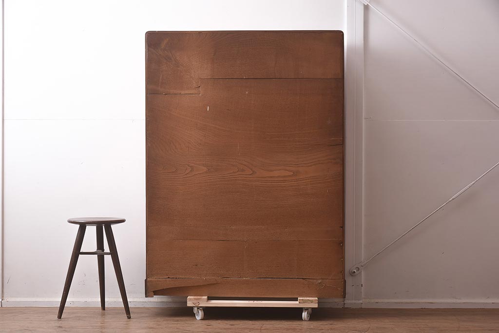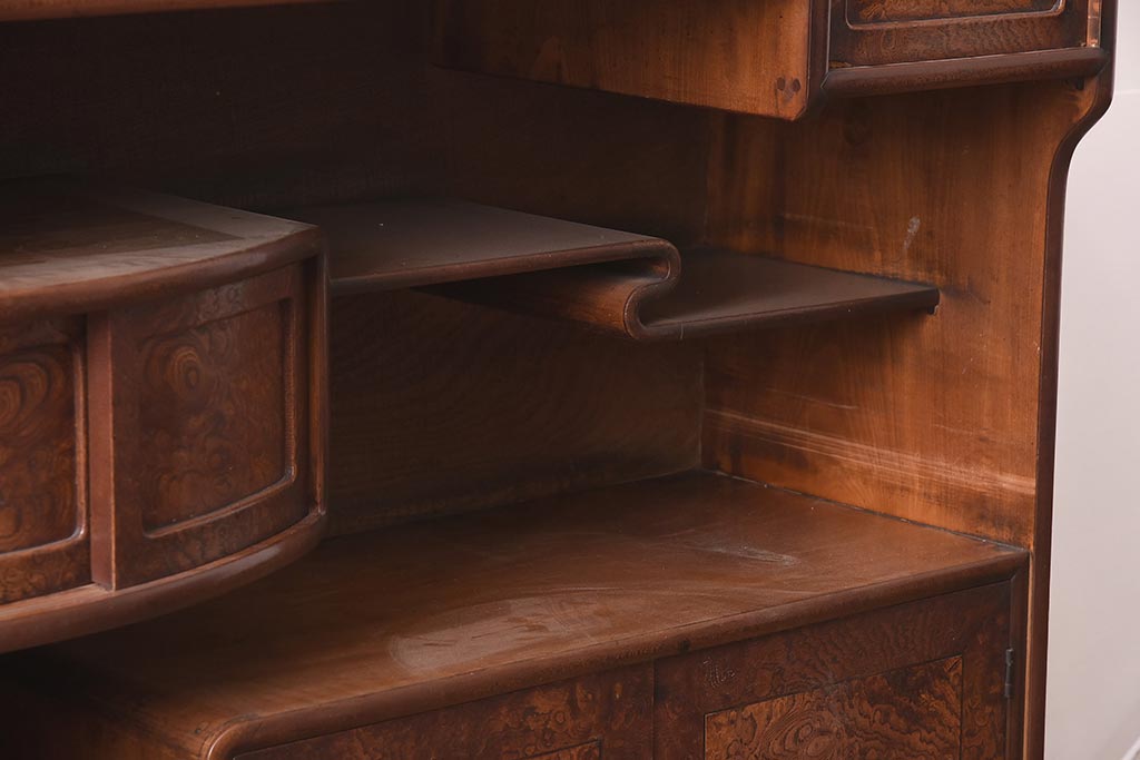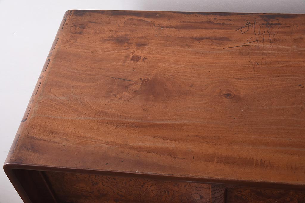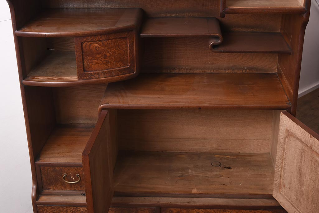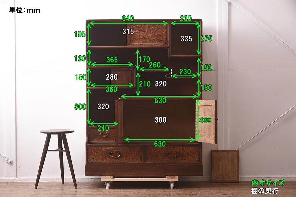和箪笥> 茶箪笥・茶棚 > アンティーク家具 大正昭和初期 前面欅(ケヤキ)玉杢材 凝った造りの茶箪笥(飾り棚、茶棚)(R-042457)