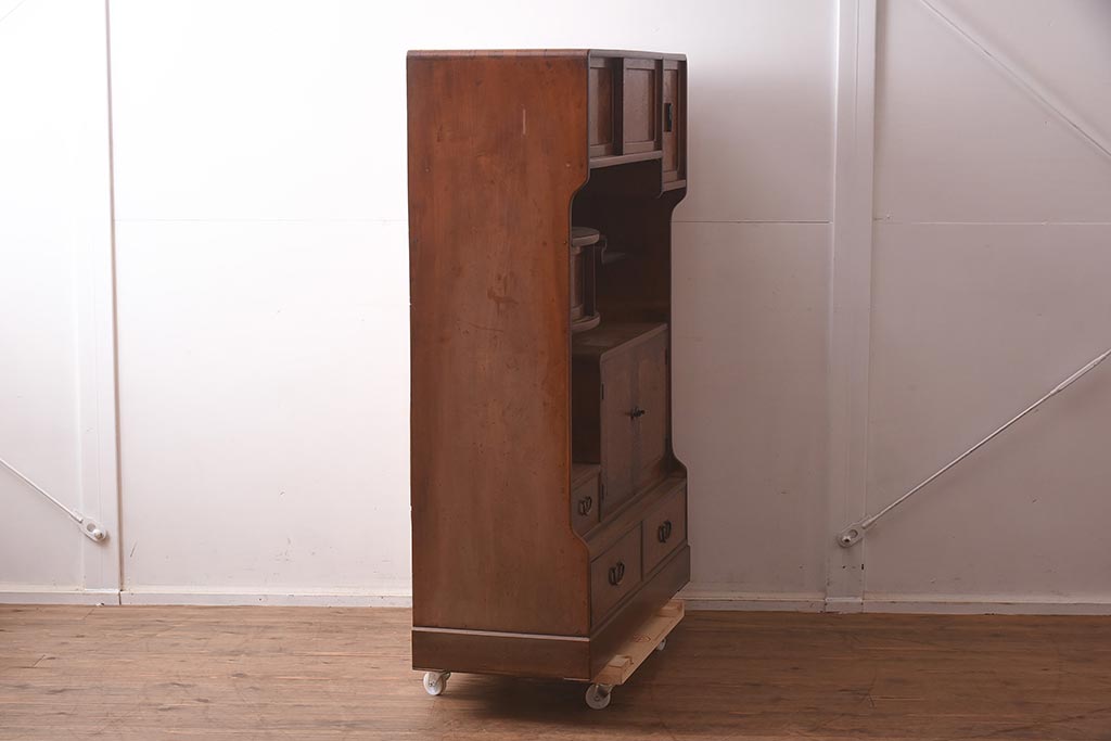 アンティーク家具 大正昭和初期 前面欅(ケヤキ)玉杢材 凝った造りの茶箪笥(飾り棚、茶棚)(R-042457)