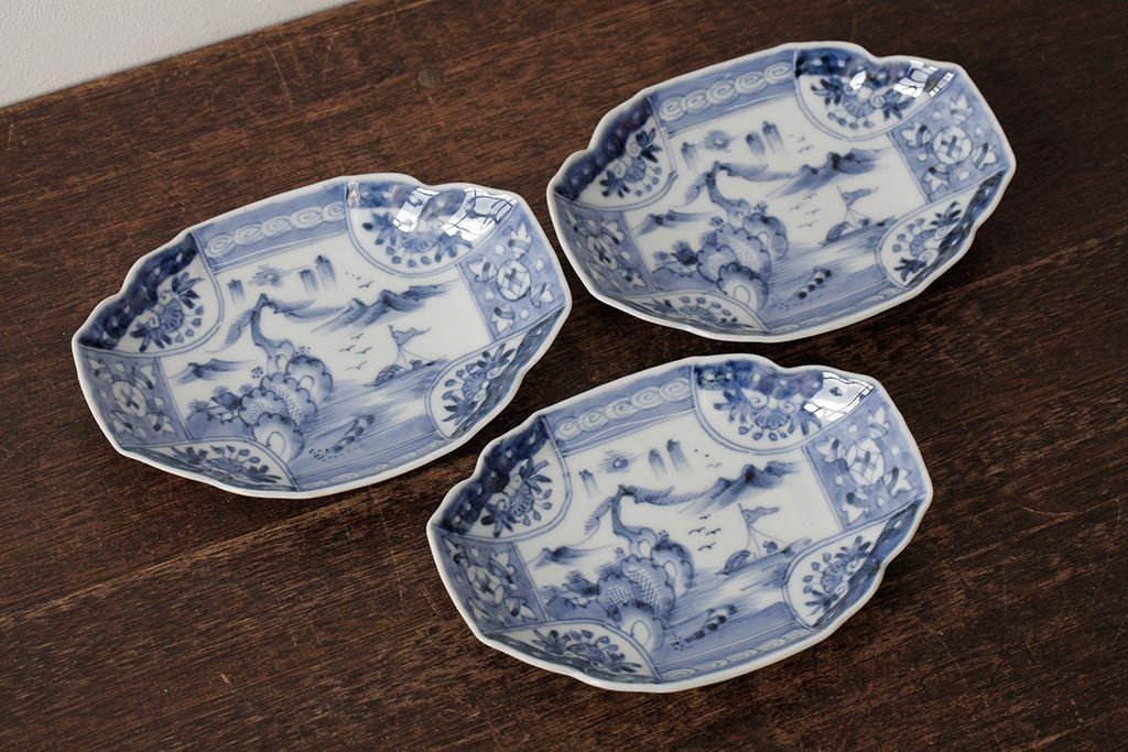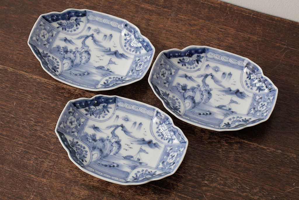 アンティーク雑貨 古民具・骨董 江戸期 古伊万里 山水図染付変形皿3枚セット(和食器)(R-042469)