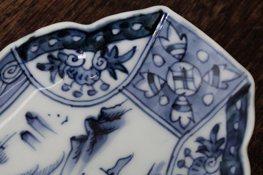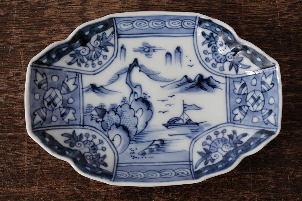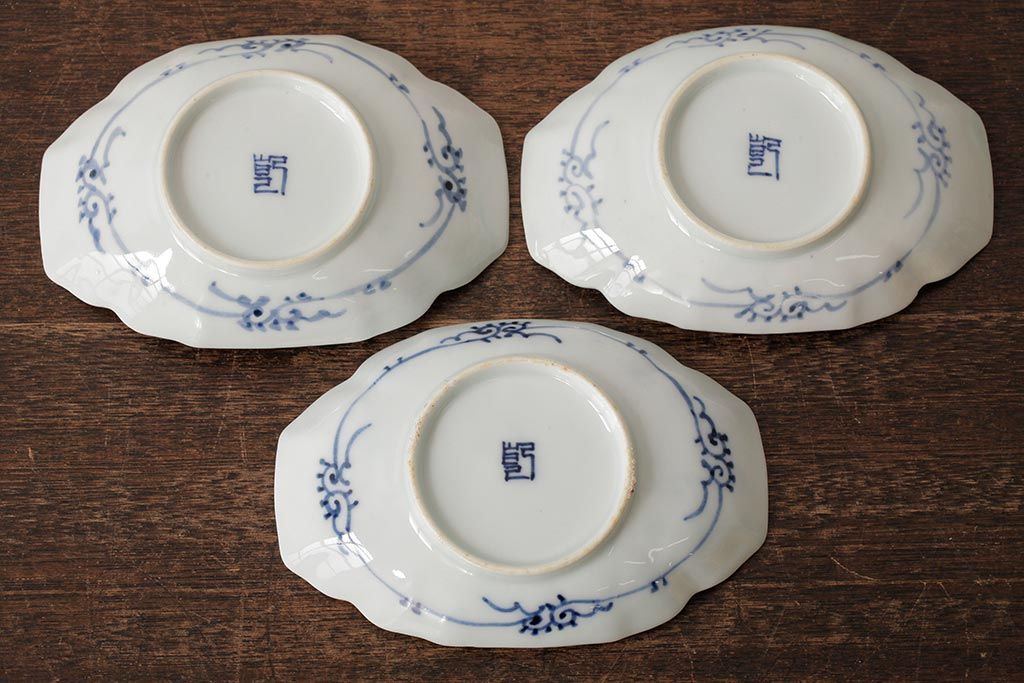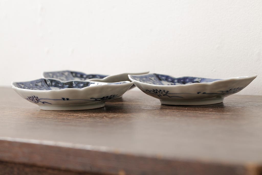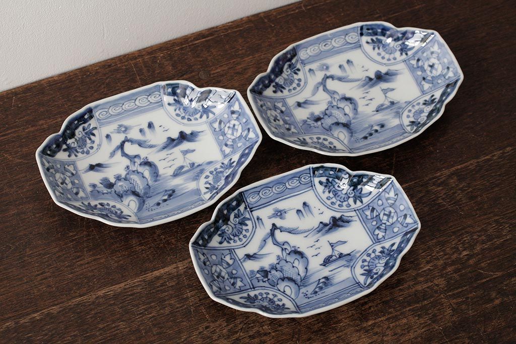 アンティーク雑貨 古民具・骨董 江戸期 古伊万里 山水図染付変形皿3枚セット(和食器)(R-042472)