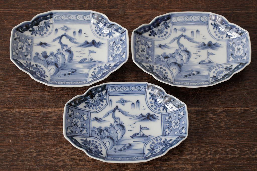 ラフジュ工房> 骨董・美術品> 骨董-陶磁器 > アンティーク雑貨 古民具・骨董 江戸期 古伊万里 山水図染付変形皿3枚セット(和食器)(R-042472)