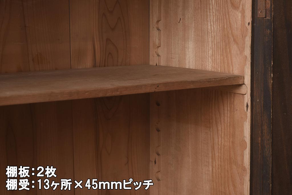 棚板は取り外しできます。棚板は2枚あります。棚受けは13ヶ所、45mmピッチで調整できます。棚幅サイズのものが1枚の作りです。