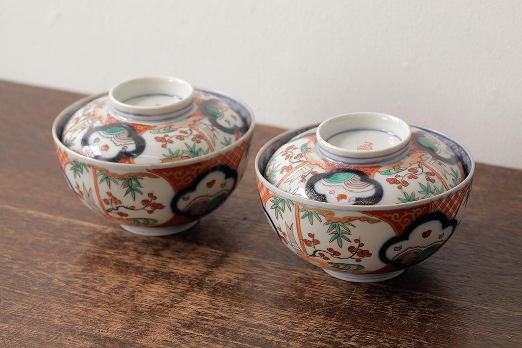 アンティーク雑貨 江戸期 古伊万里 色絵染付蓋茶碗2客セット(和食器)(R-042587)