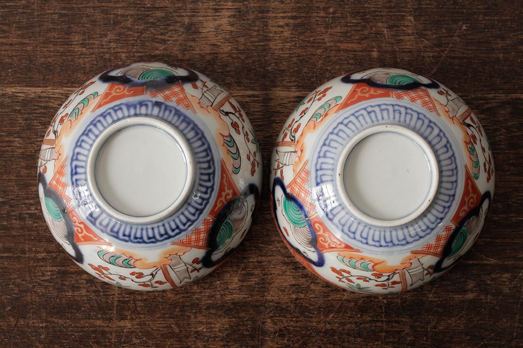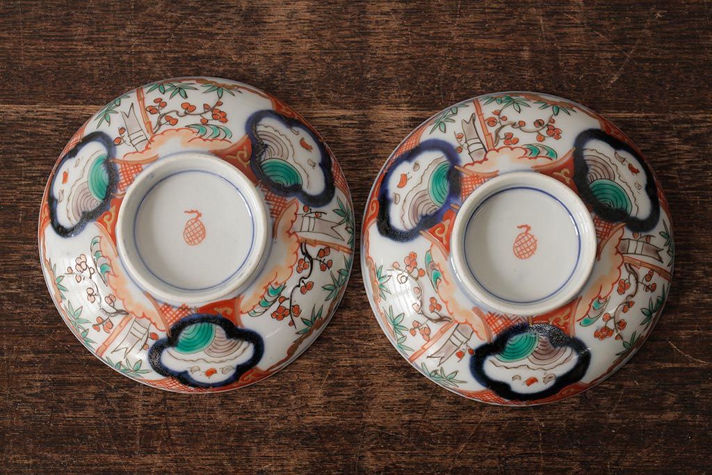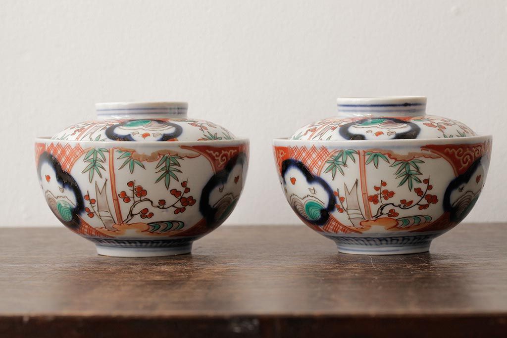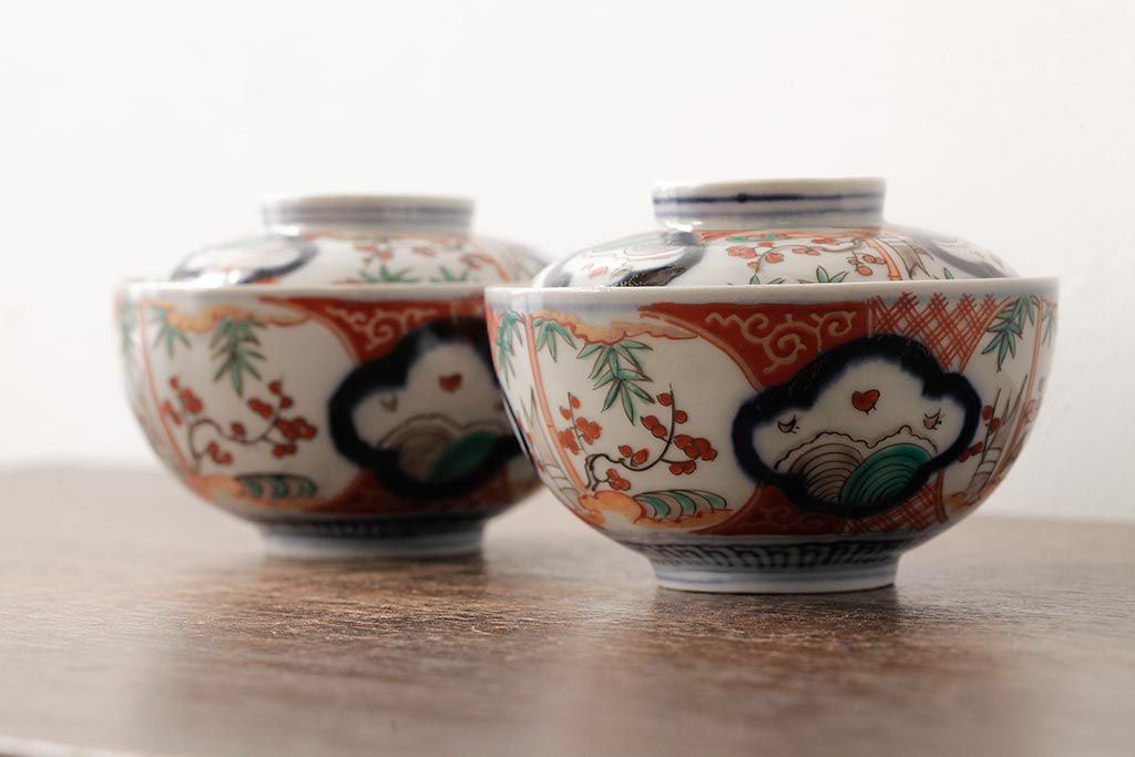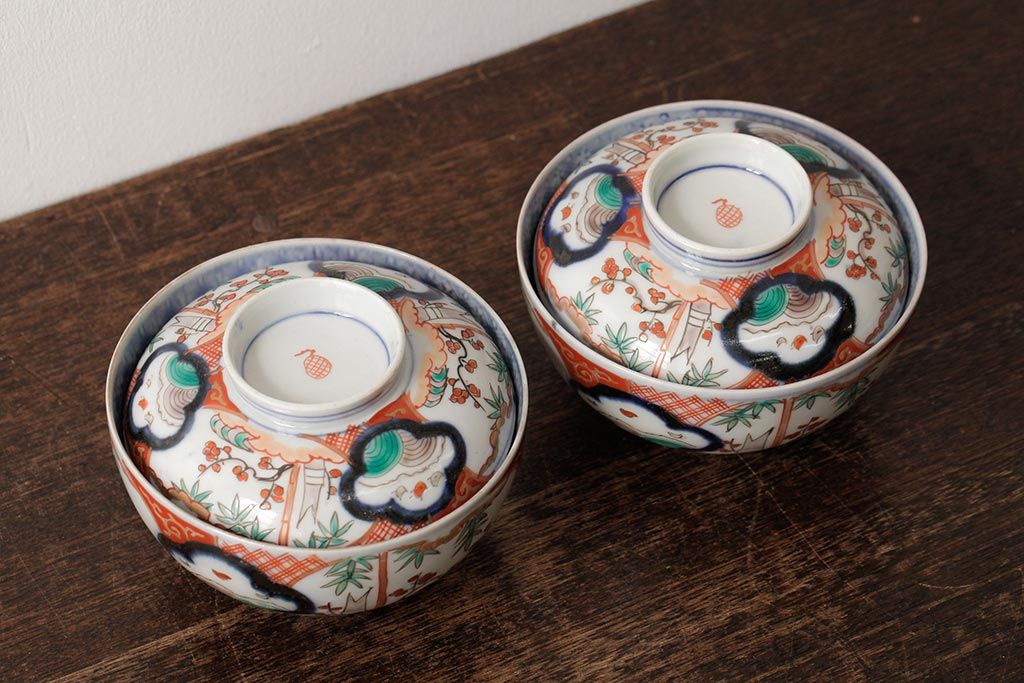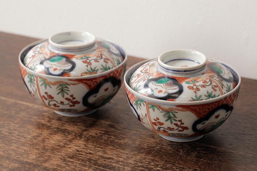 アンティーク雑貨 江戸期 古伊万里 色絵染付蓋茶碗2客セット(和食器)(R-042588)