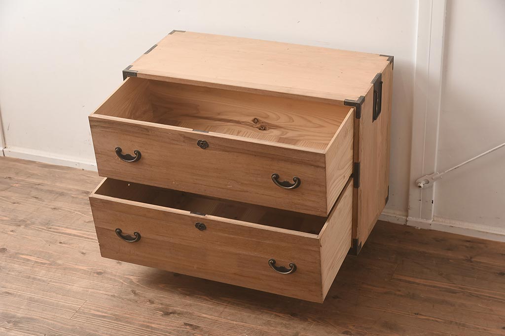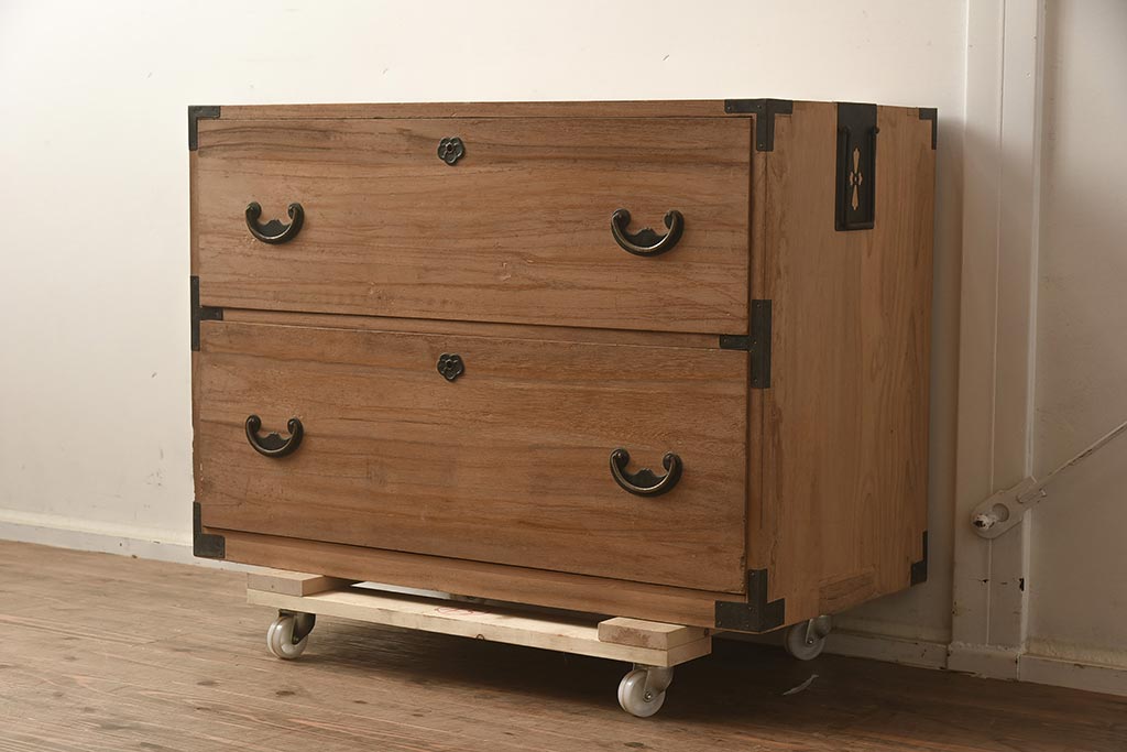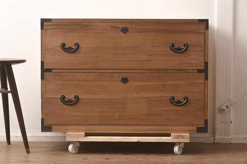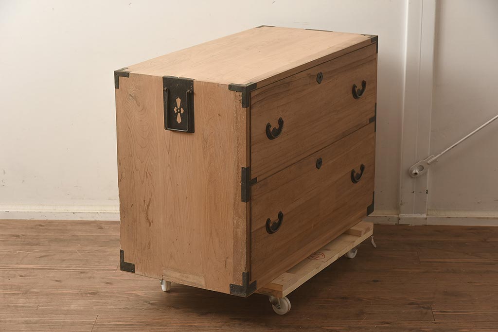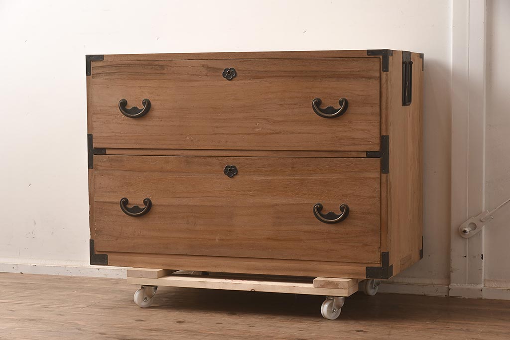和箪笥> 衣装箪笥 > アンティーク家具 和製アンティーク 前面桐材 金具が個性的な箪笥ローボード(引き出し、和タンス、ローチェスト、桐箪笥、桐たんす)(R-042513)