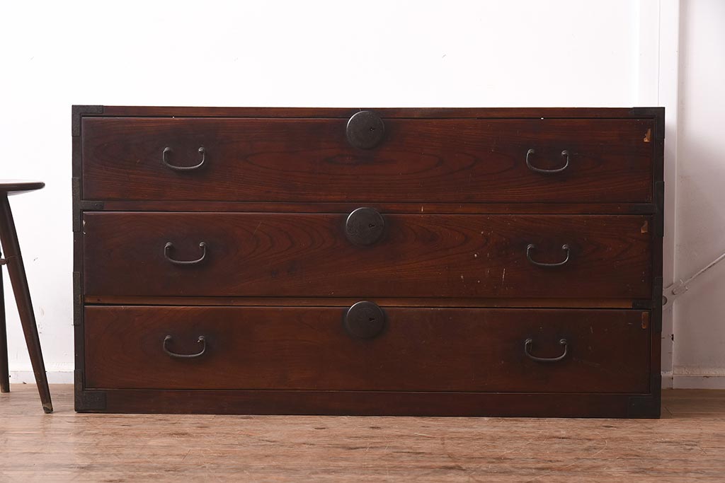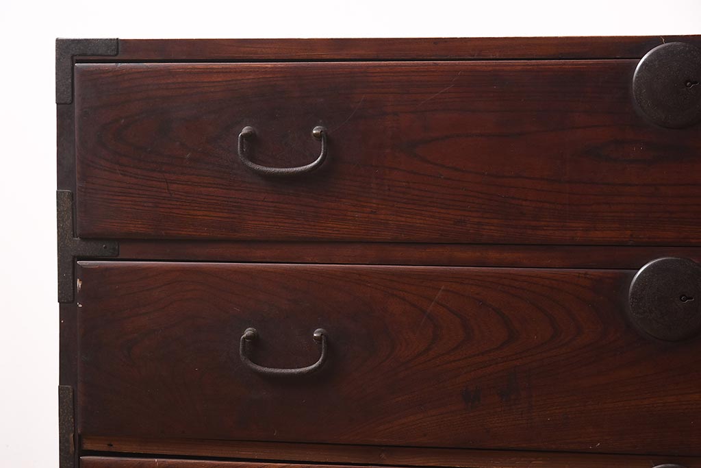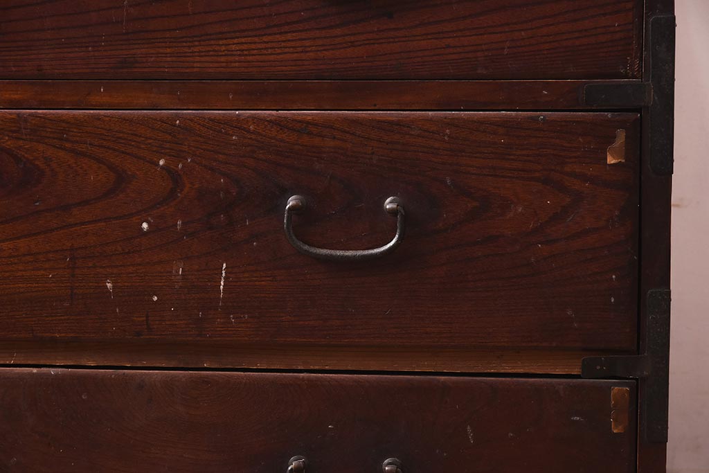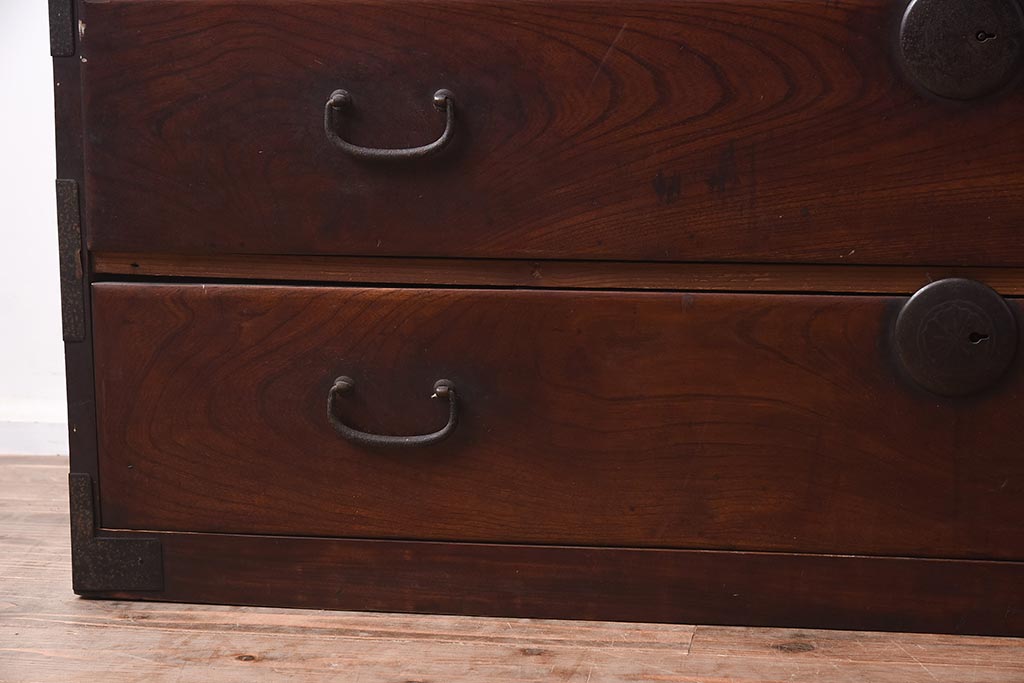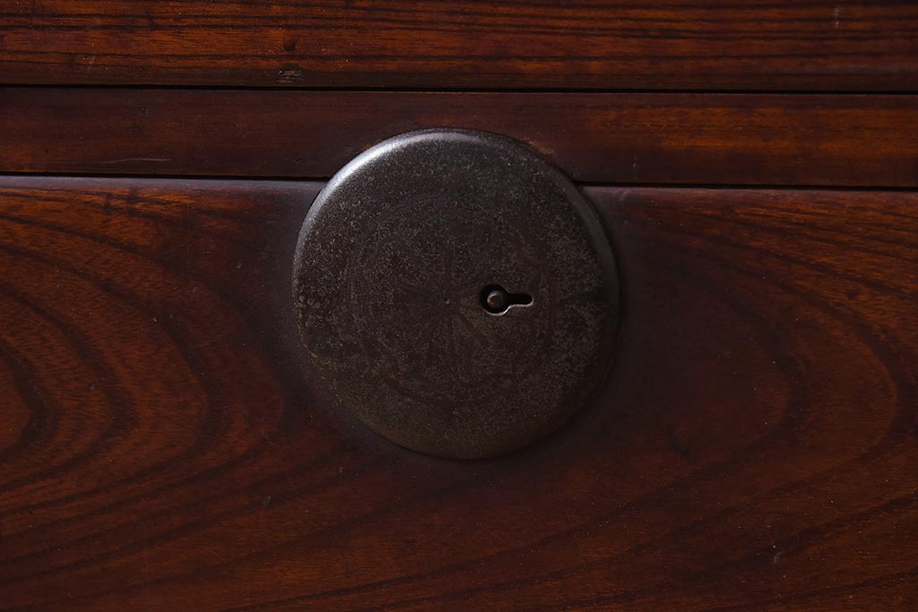 アンティーク家具 昭和初期 前面欅材・共縁 丸金具 漆塗りが上品な箪笥ローボード(チェスト、衣装箪笥、引き出し)(R-042538)